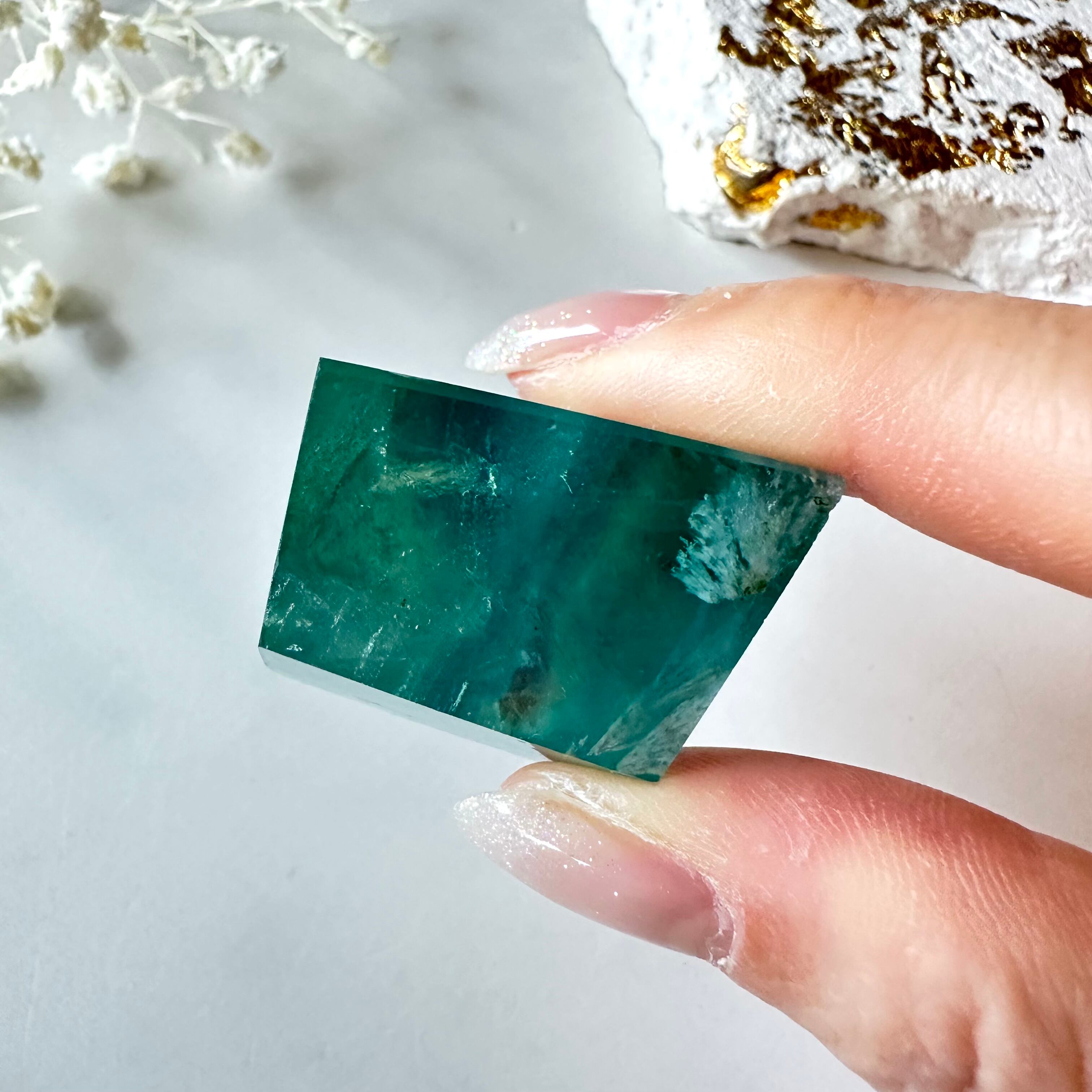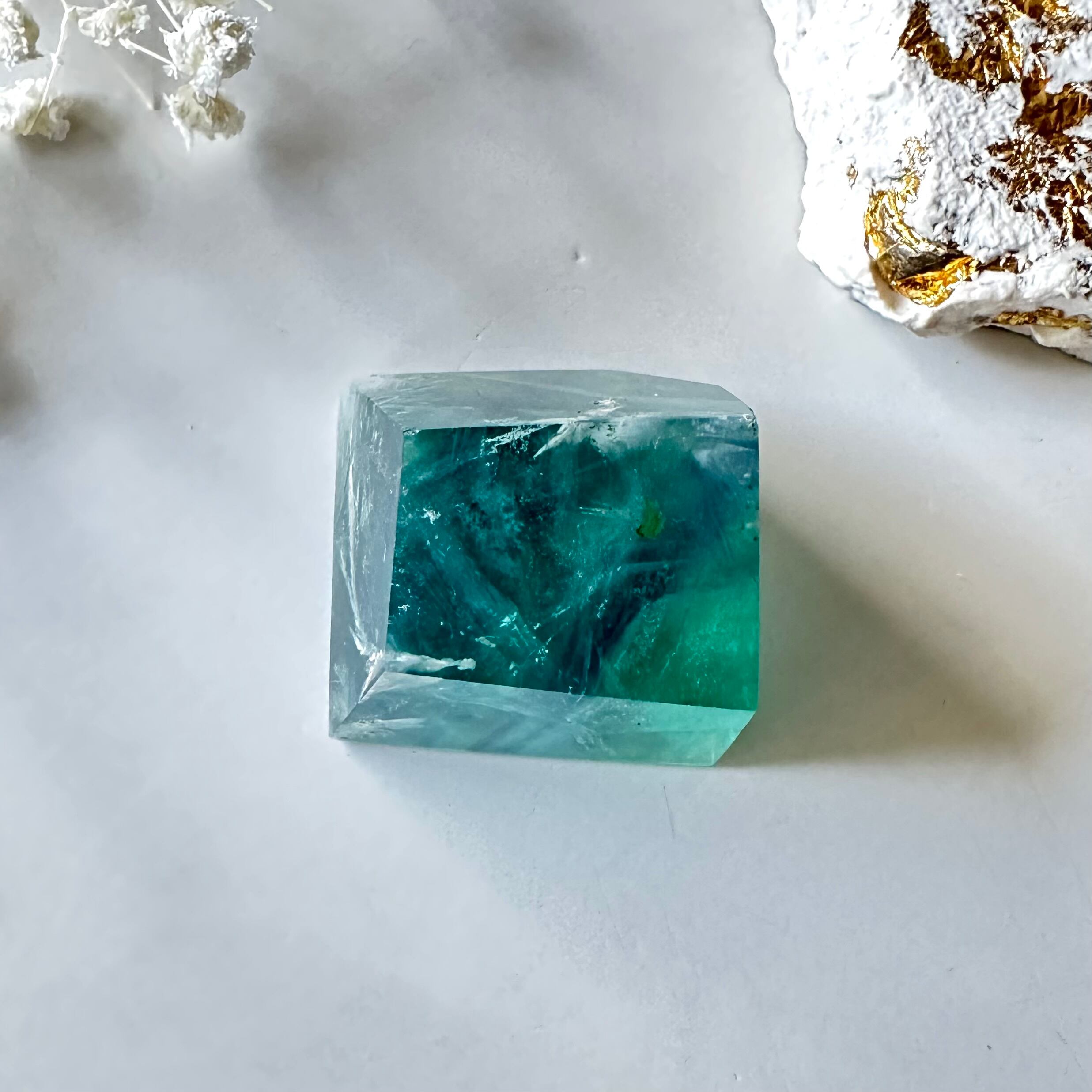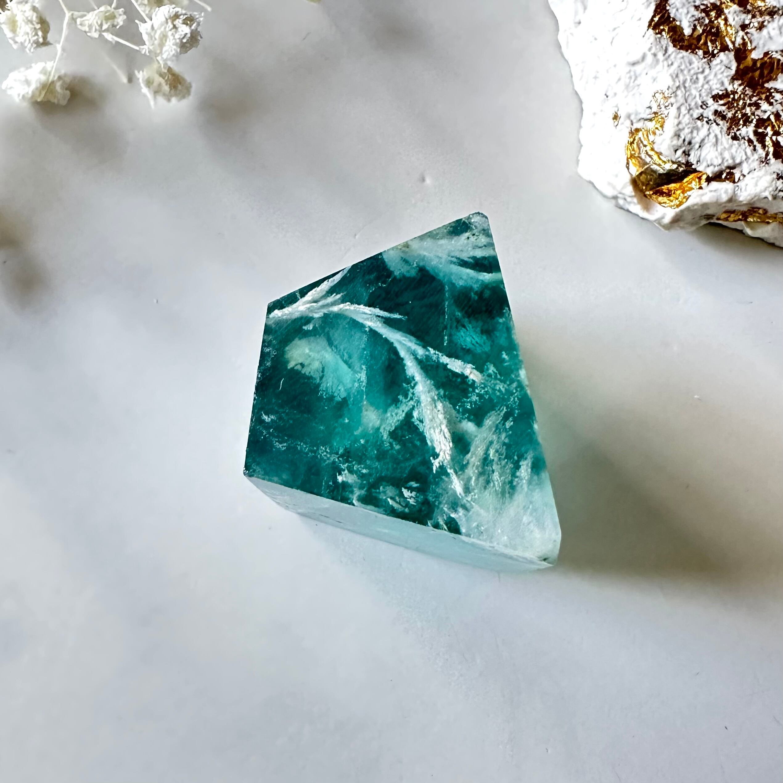 別名をスノーフレイクフローライトともいいます。ブルーグリーンの中にパープルとブルーのラインが入っています。天使の羽のようなふんわりと儚く繊細なホワイトのインクルージョンが美しく、眺めいていると安らぎを覚えるようなアイテムです。