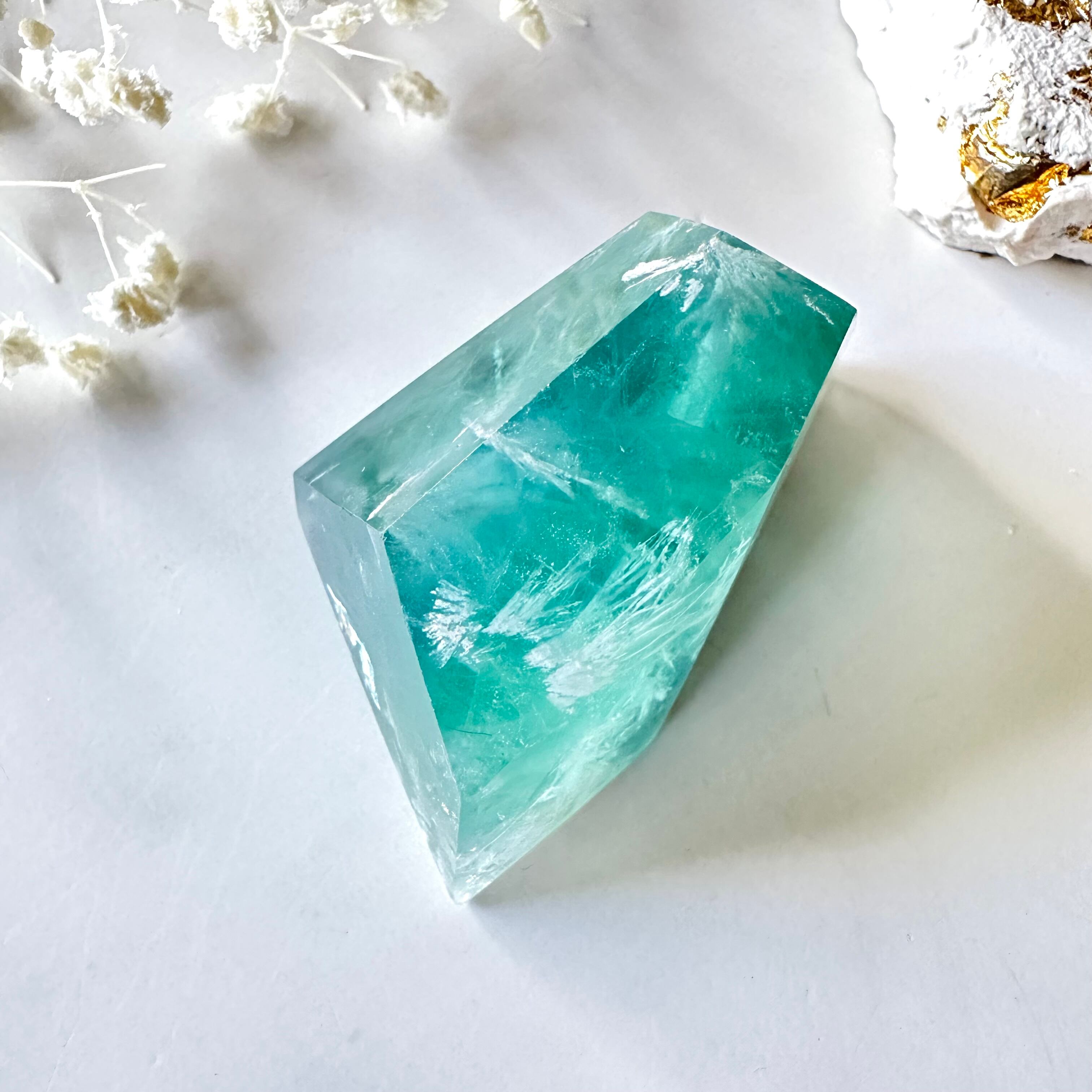 別名をスノーフレイクフローライトともいいます。美しいグルーグリーンの中にふわふわとした天使の羽のような、儚く繊細なホワイトが散りばめられています 光にかざすとエメラルドグリーンに輝き、その輝きにうっとりと思わず心を奪われます。