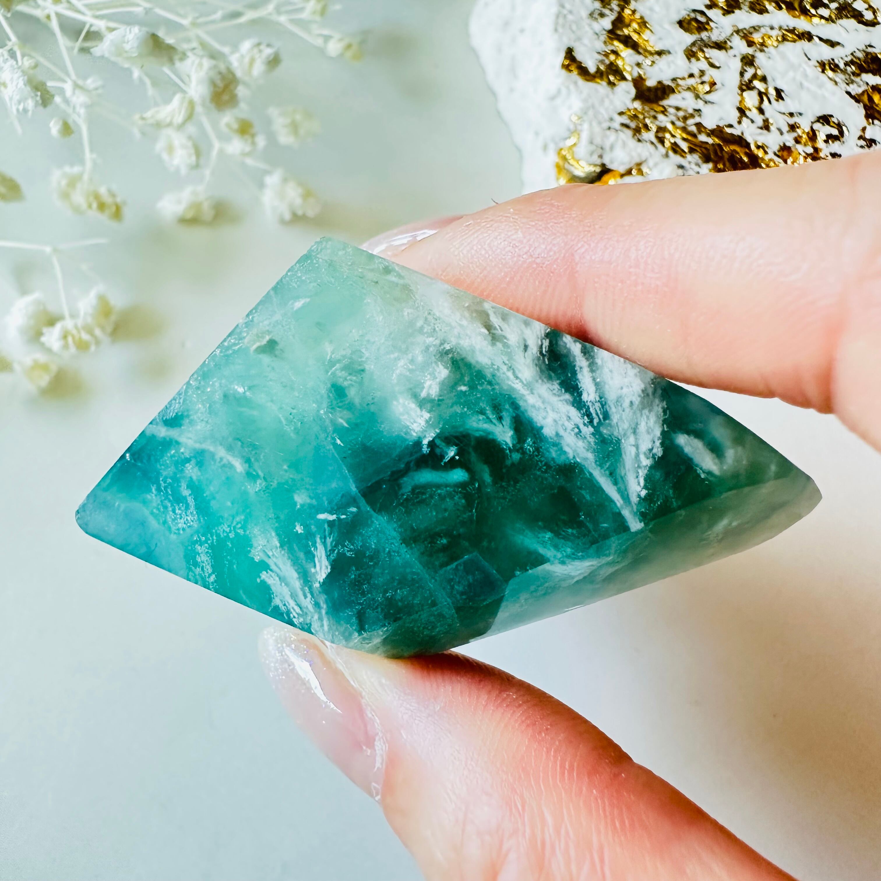 別名をスノーフレイクフローライトともいいます。深いブルーグリーンの中に天使の羽のような、あるいは雪の結晶のような白く儚く繊細な模様が詰め込まれ、少しミルキーなカラーが優しい雰囲気を演出します。そのふわふわとした印象は自然が生み出す世界にたったひとつの特別なアイテムです。