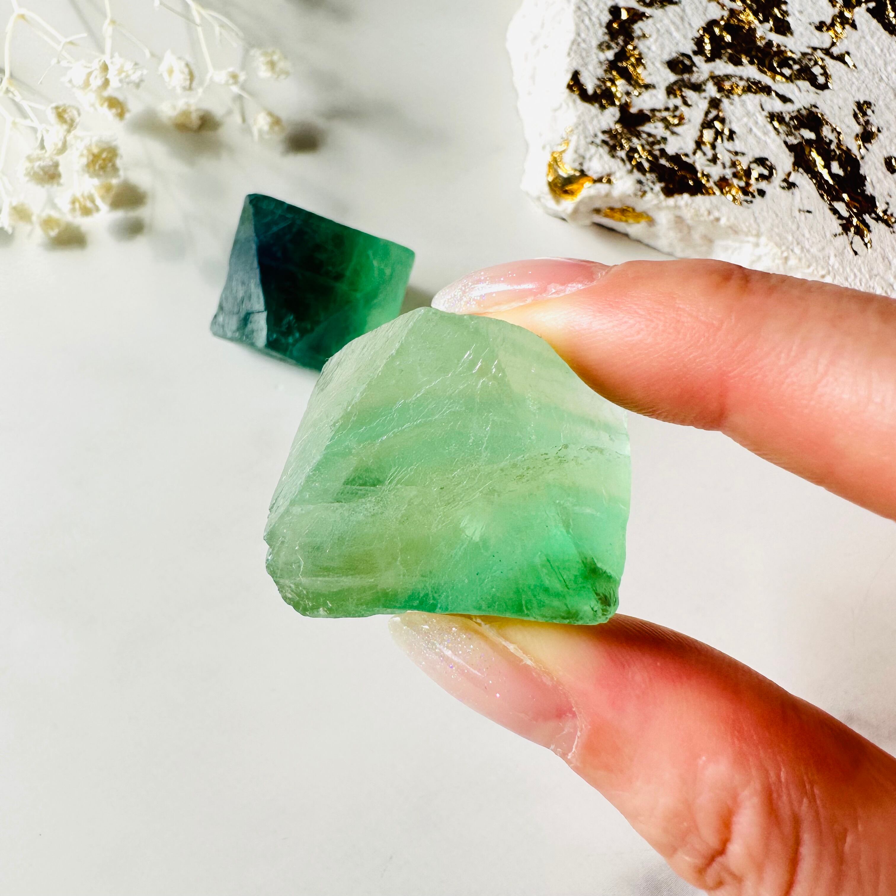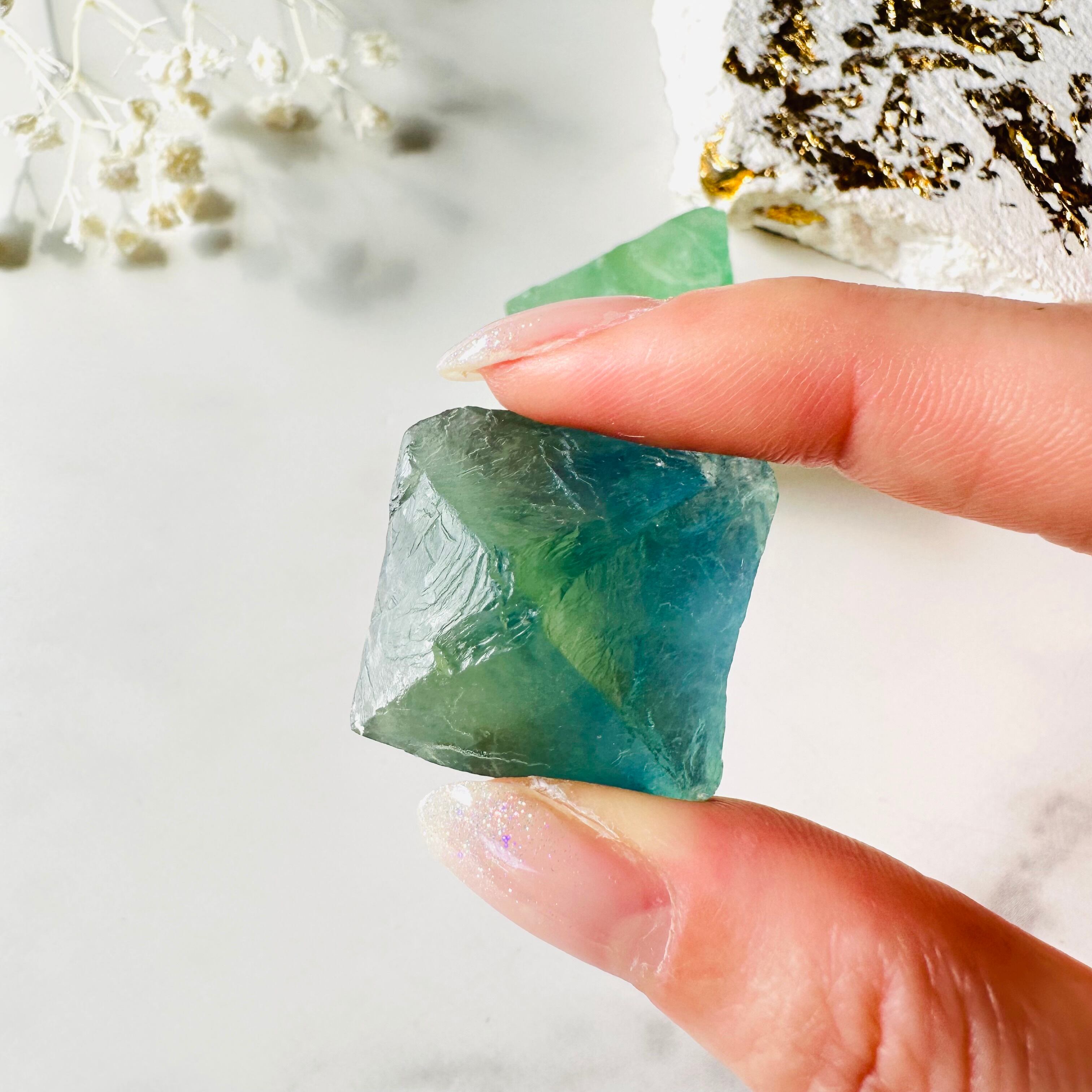 フローライトは平面に平行に割れやすい性質があり、その性質を利用して加工された形です。