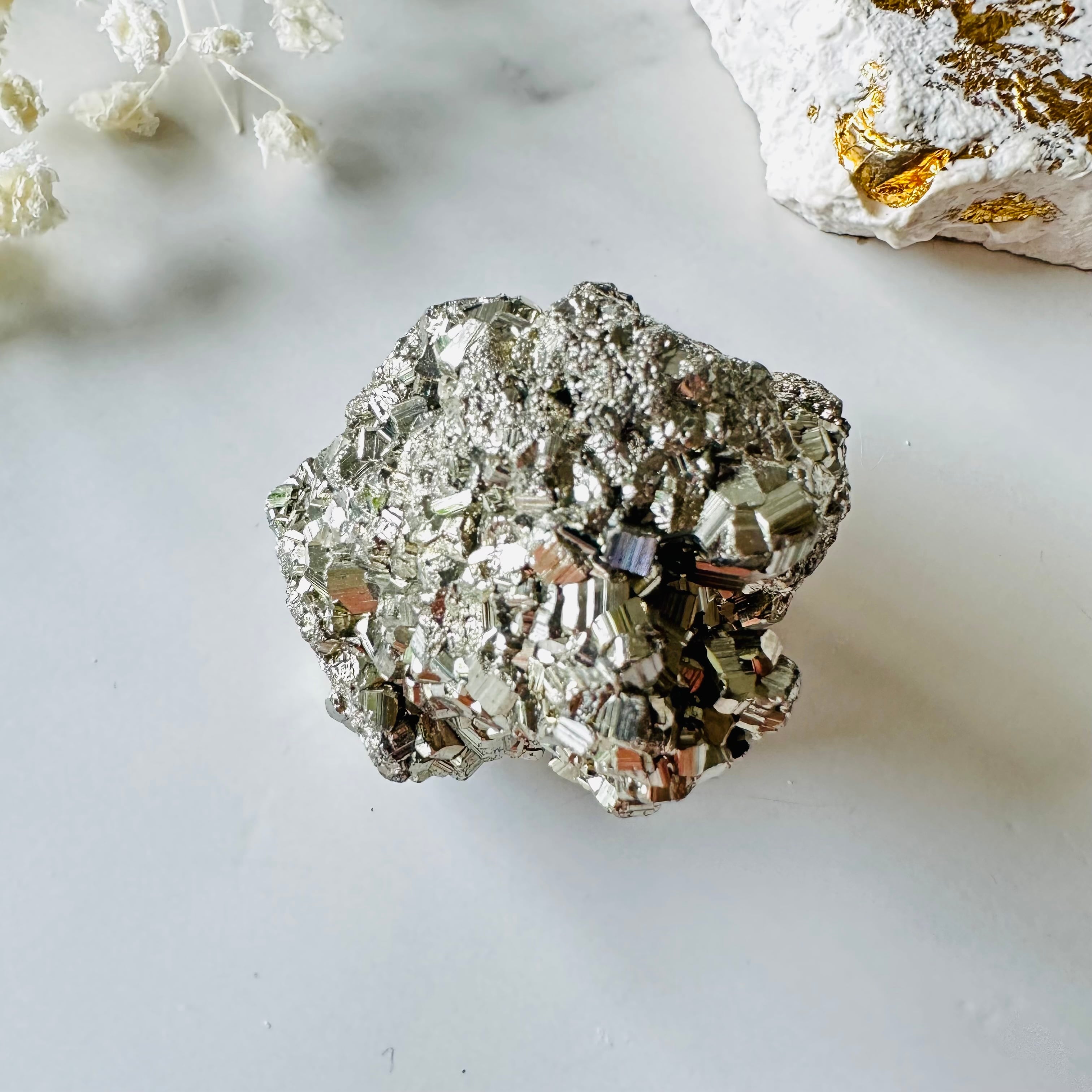 火山活動によって生成されたパイライト。このメタリックな塊から上昇のエネルギーが溢れ出してくるかのようにパワフルです。金運アップにも良いと言われています。