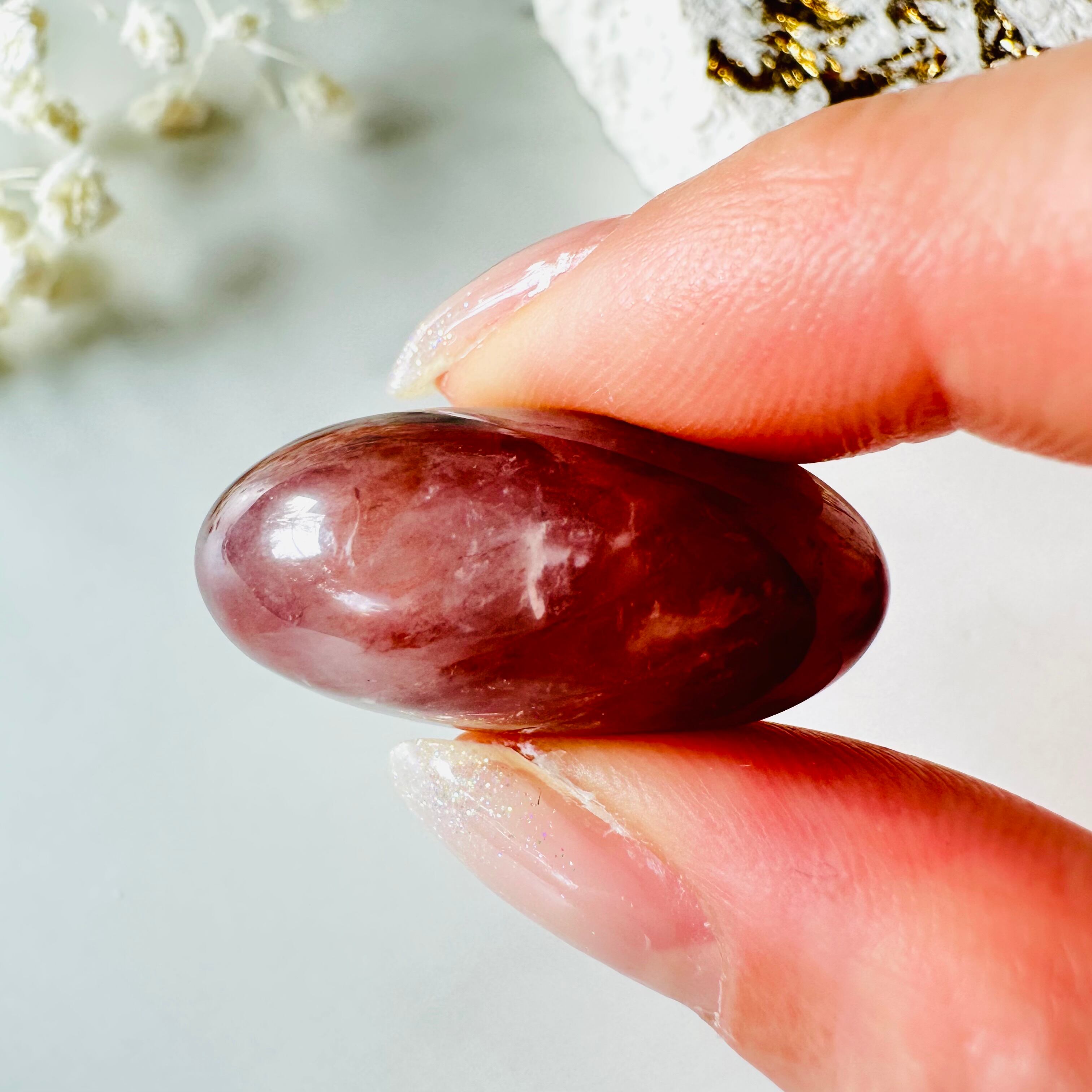 レピドクロサイトを内包した水晶で、別名「レピドクロサイト イン クォーツ」と言います。 スーパーセブンやストロベリークォーツと同じくクリスタルヒーラーに人気があるパワーストーンで、全体的に赤みを帯びていることから「情熱」「力強さ」を表し、持ち主に自信と決断力を与えると言われています。
