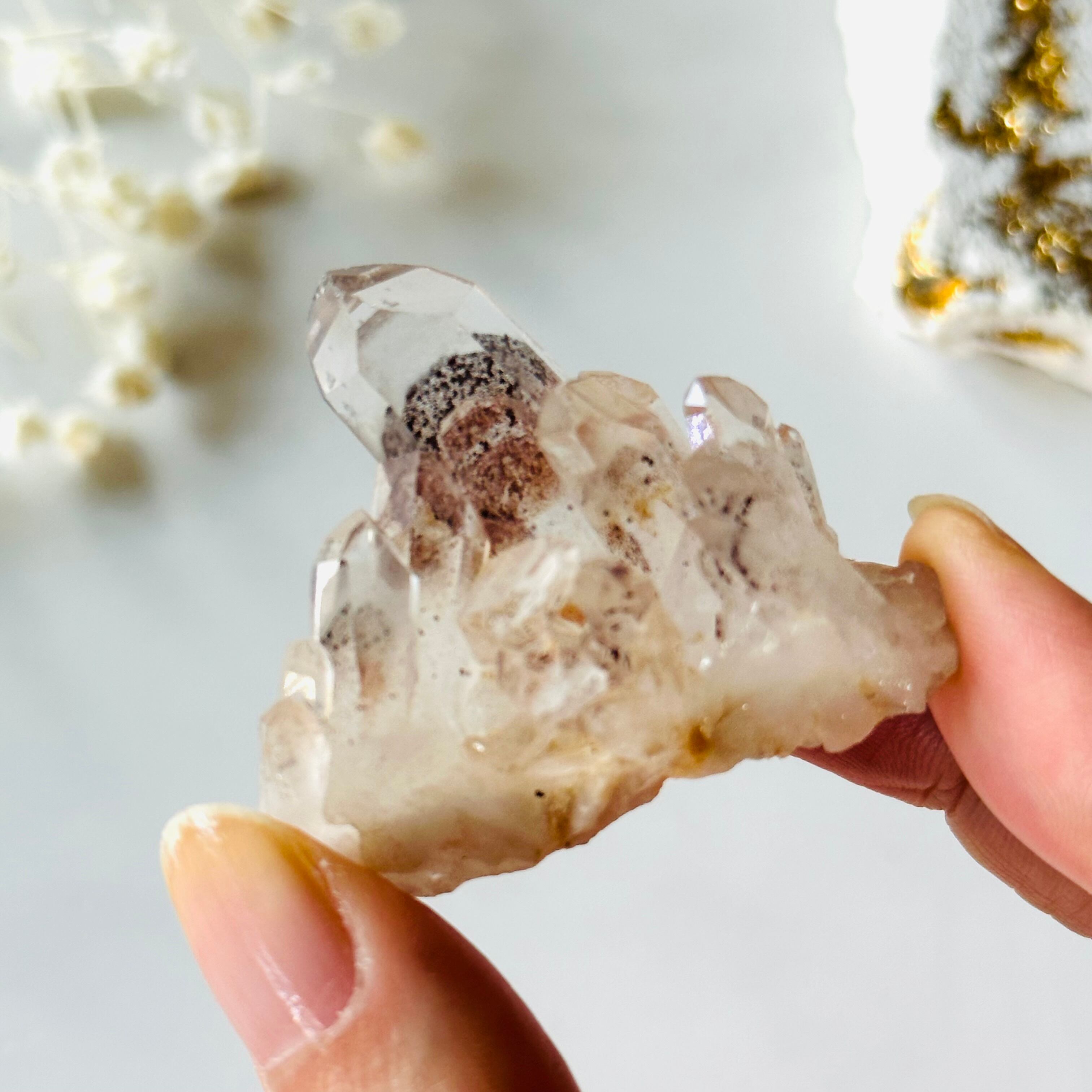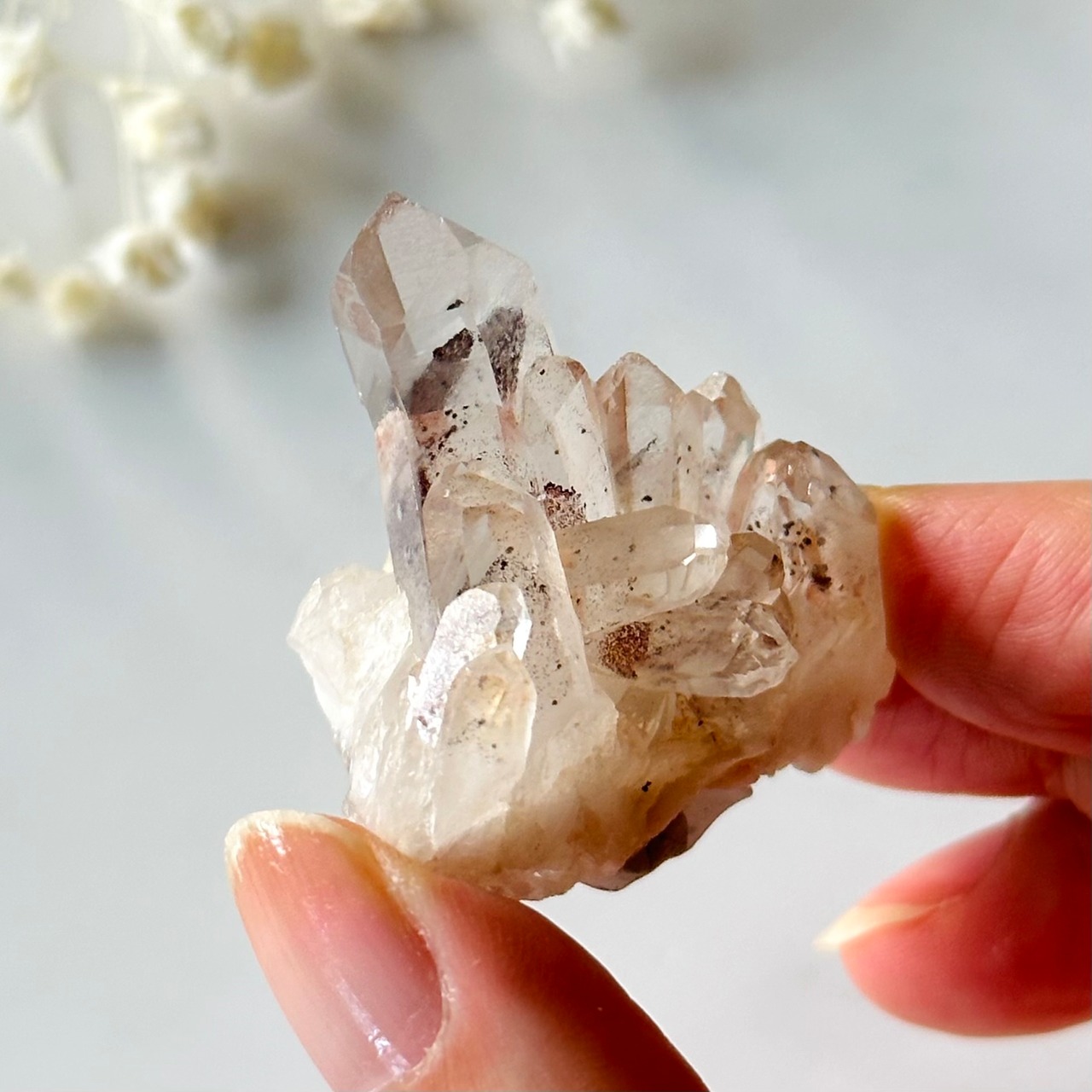 非常にクリアなクォーツの内部に描かれた美しいレッドファントムが、点描画のように赤く細かいドットが集合し力強い稜線を描いています。虹も入って、大地のエネルギーを宿す小さくてもパワフルなクラスターです。