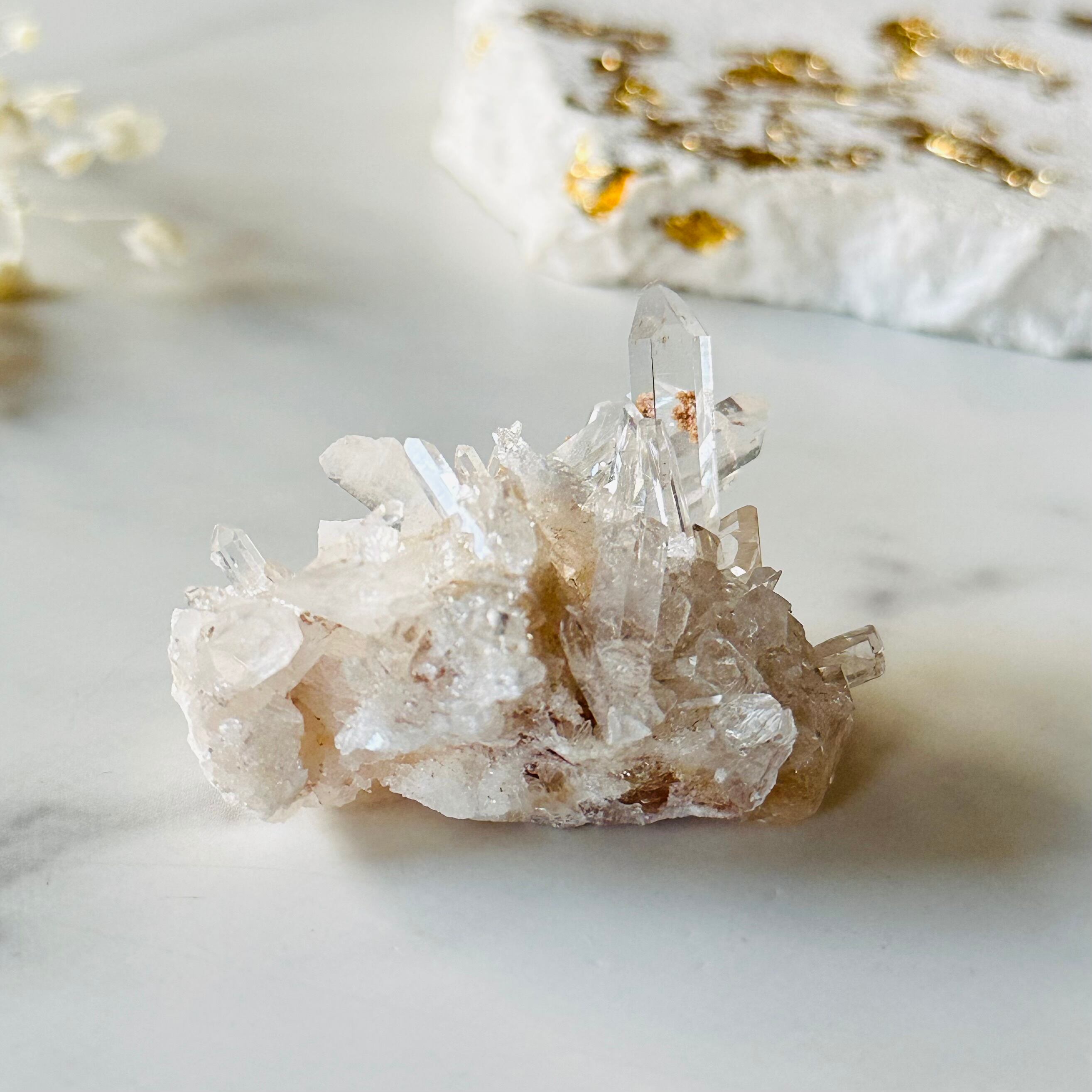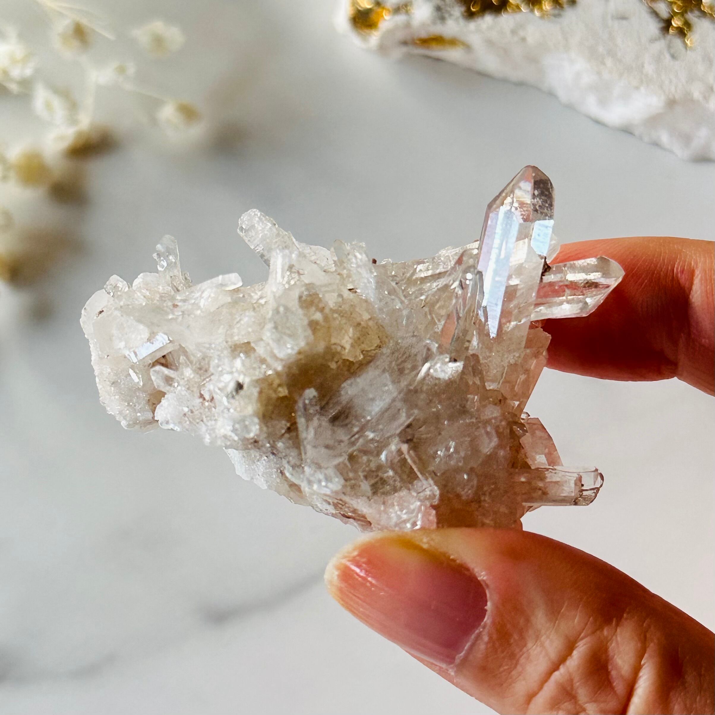 鉄分の付着によりピンク色に染まった美しいレムリアンクォーツは、古代レムリアの時代に用いられたサイキック能力や宇宙の叡智、強力なヒーリングエネルギーを秘めていると言われます。非常に高い叡智をもったレムリア人の知性や知恵を現世に伝えてくれているのでしょうか。レムリアの女神が宿るとも言われ、女性性を高める愛のクリスタルです。