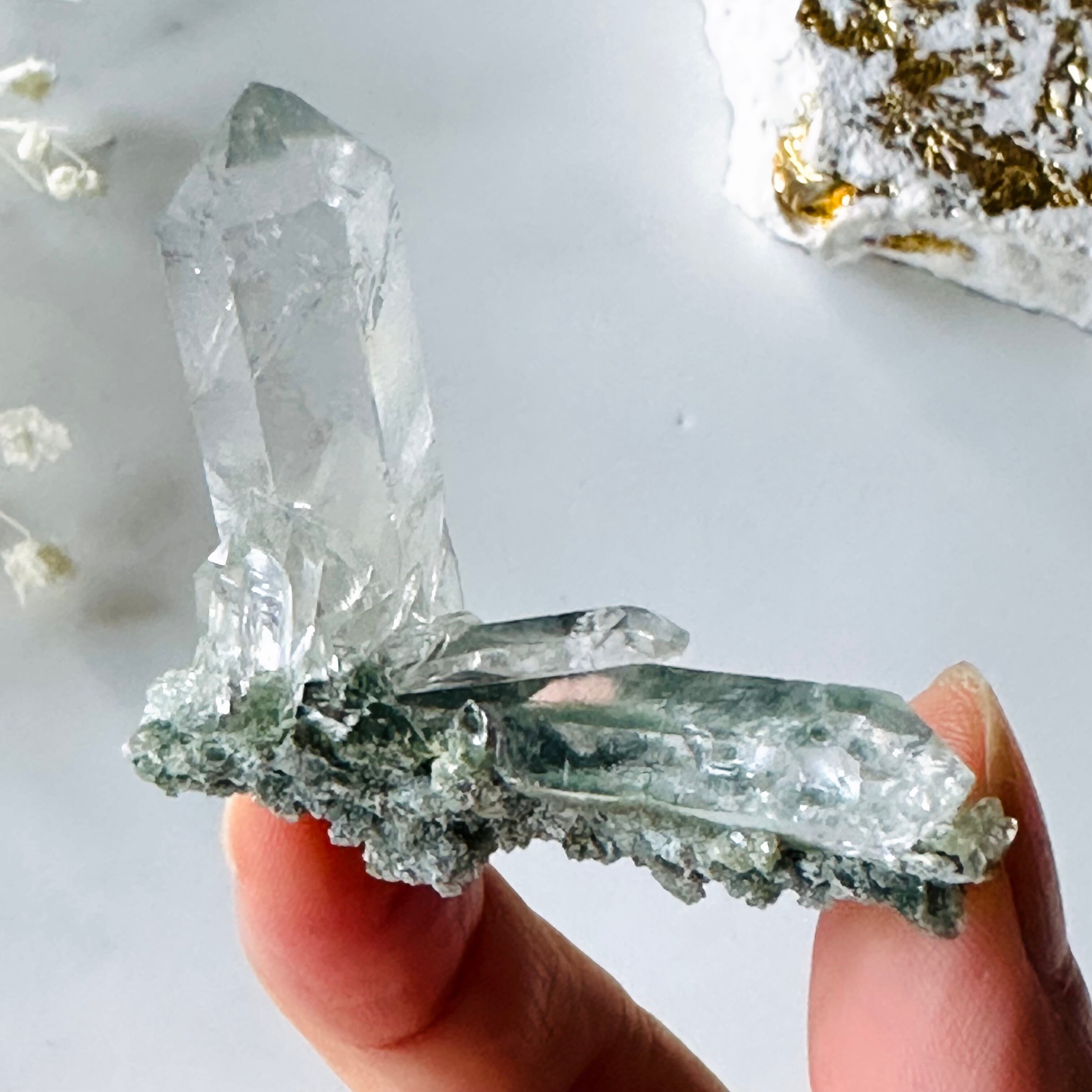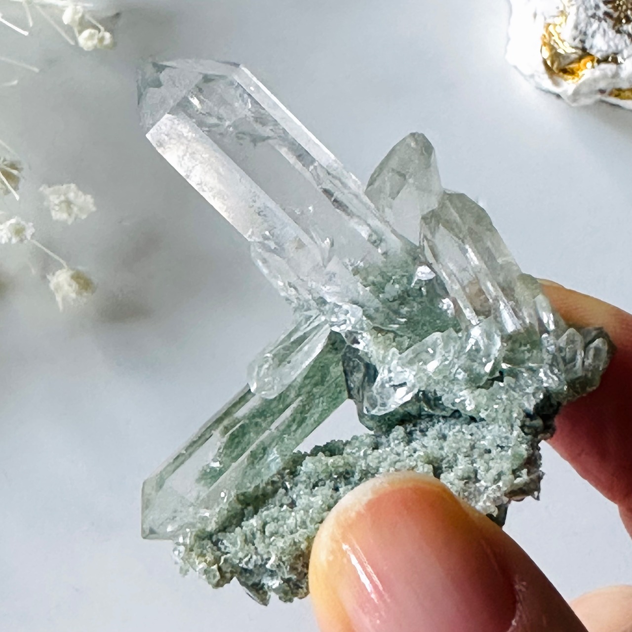極上の湧水のような透明度と艶やかな照りのある美しさで、内部には虹を宿します。クローライトとのコントラストが美しく小さいながらに魅力的が詰まったクラスターです。忙しない心を鎮まらせ、ひたひたと満たしてくれる特別なクリスタルです。