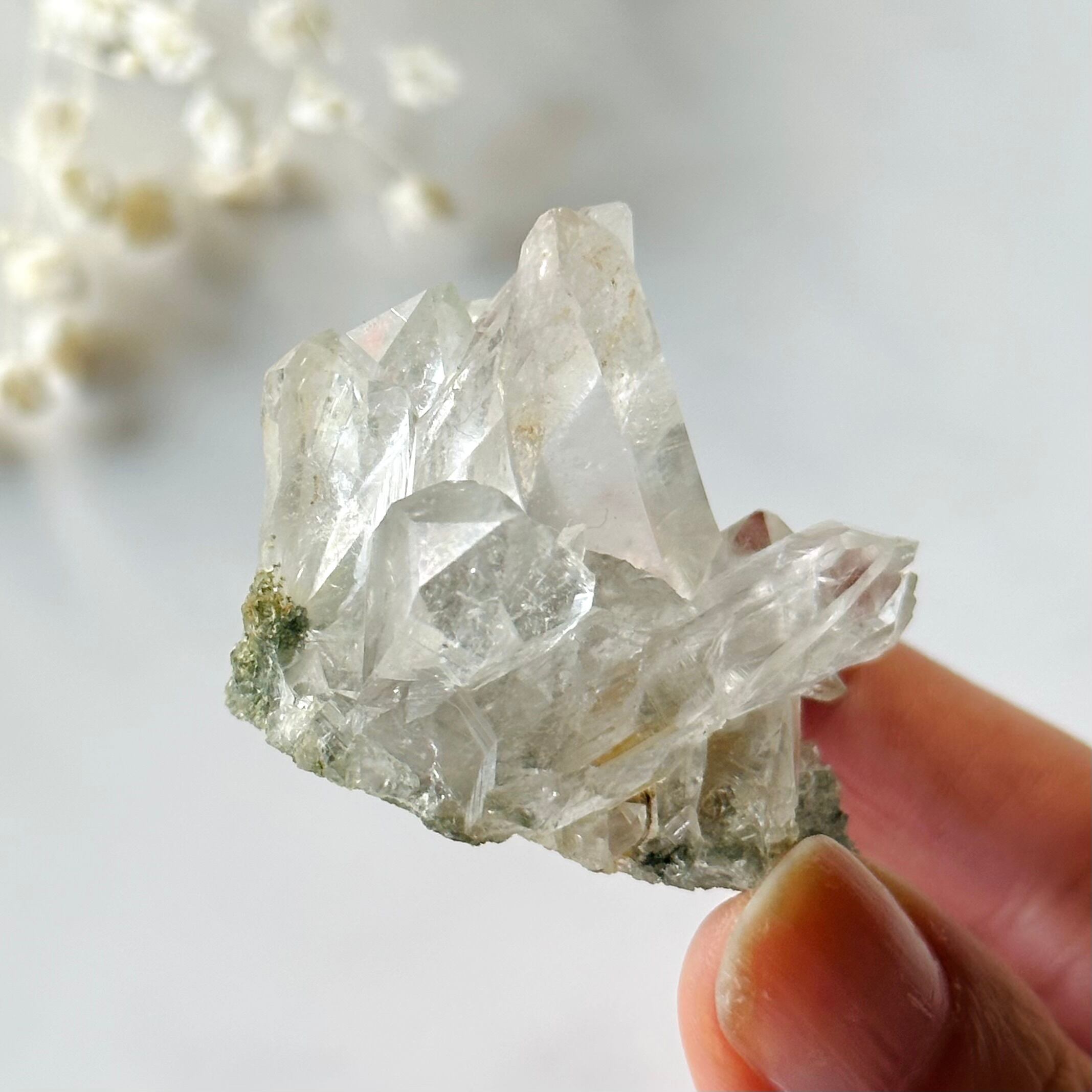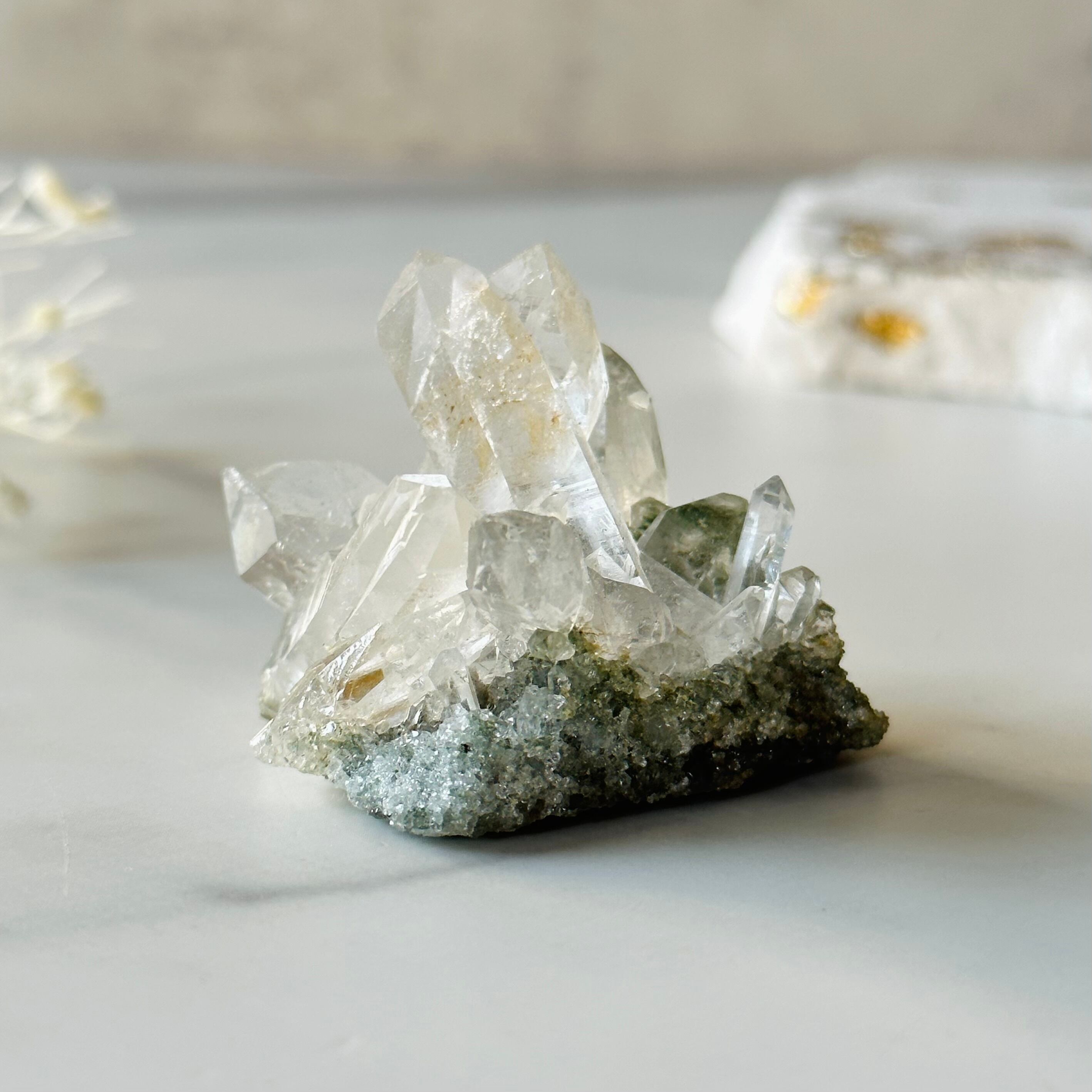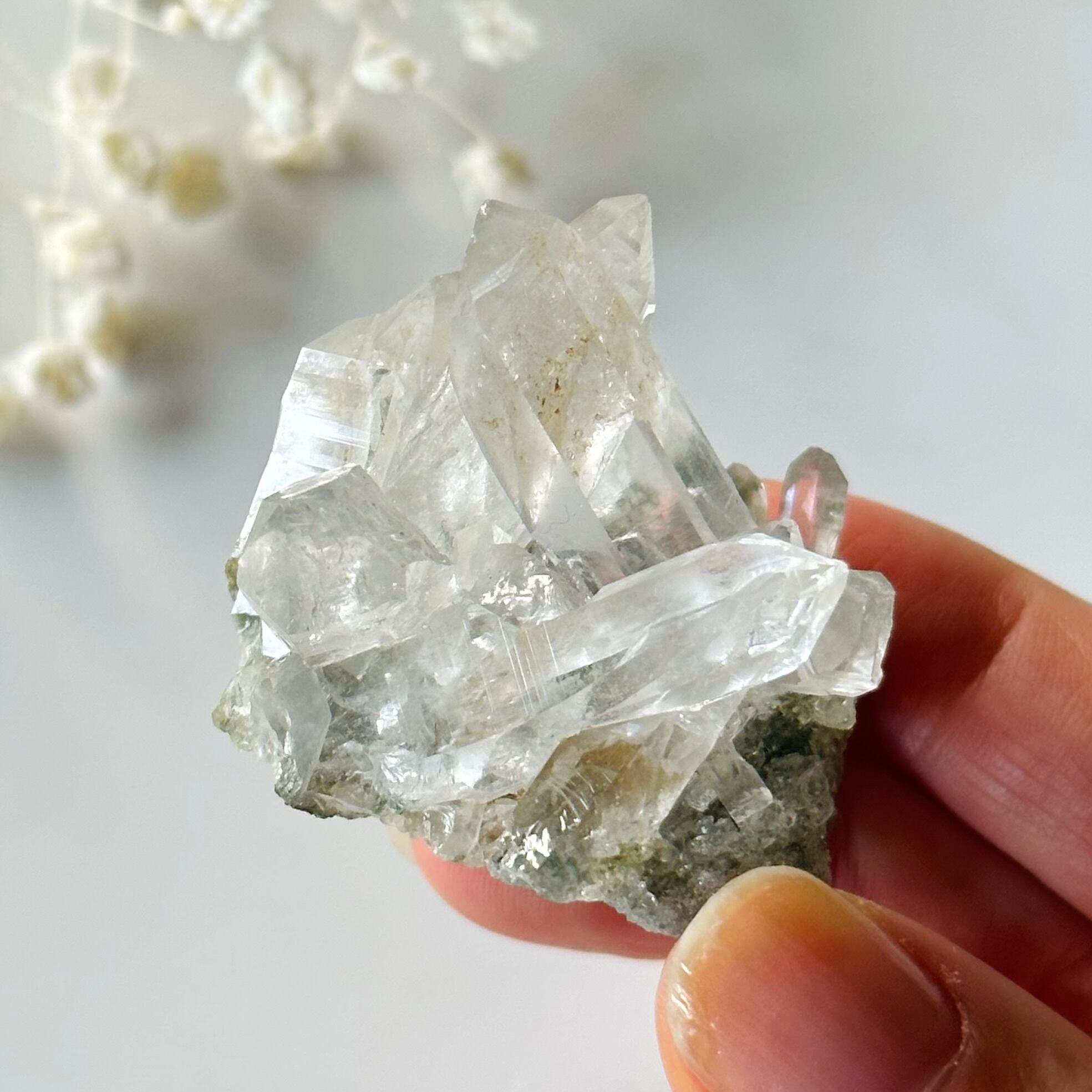 極上の湧水のような透明度と艶やかな照りのある美しいクラスターです。足元のクローライトがキラキラと静かに輝きます。忙しない心を鎮まらせ、ひたひたと満たしてくれる特別なクリスタルです。