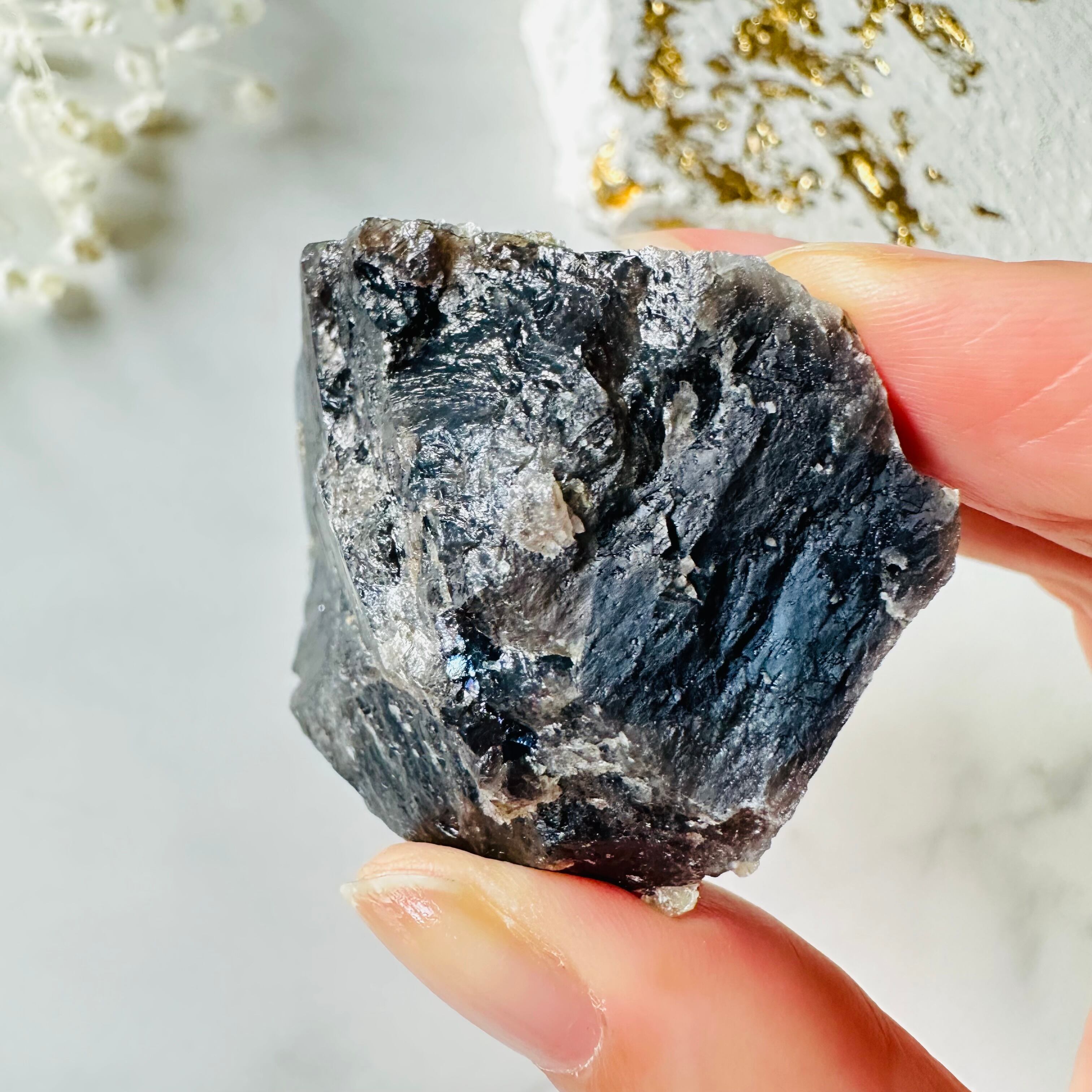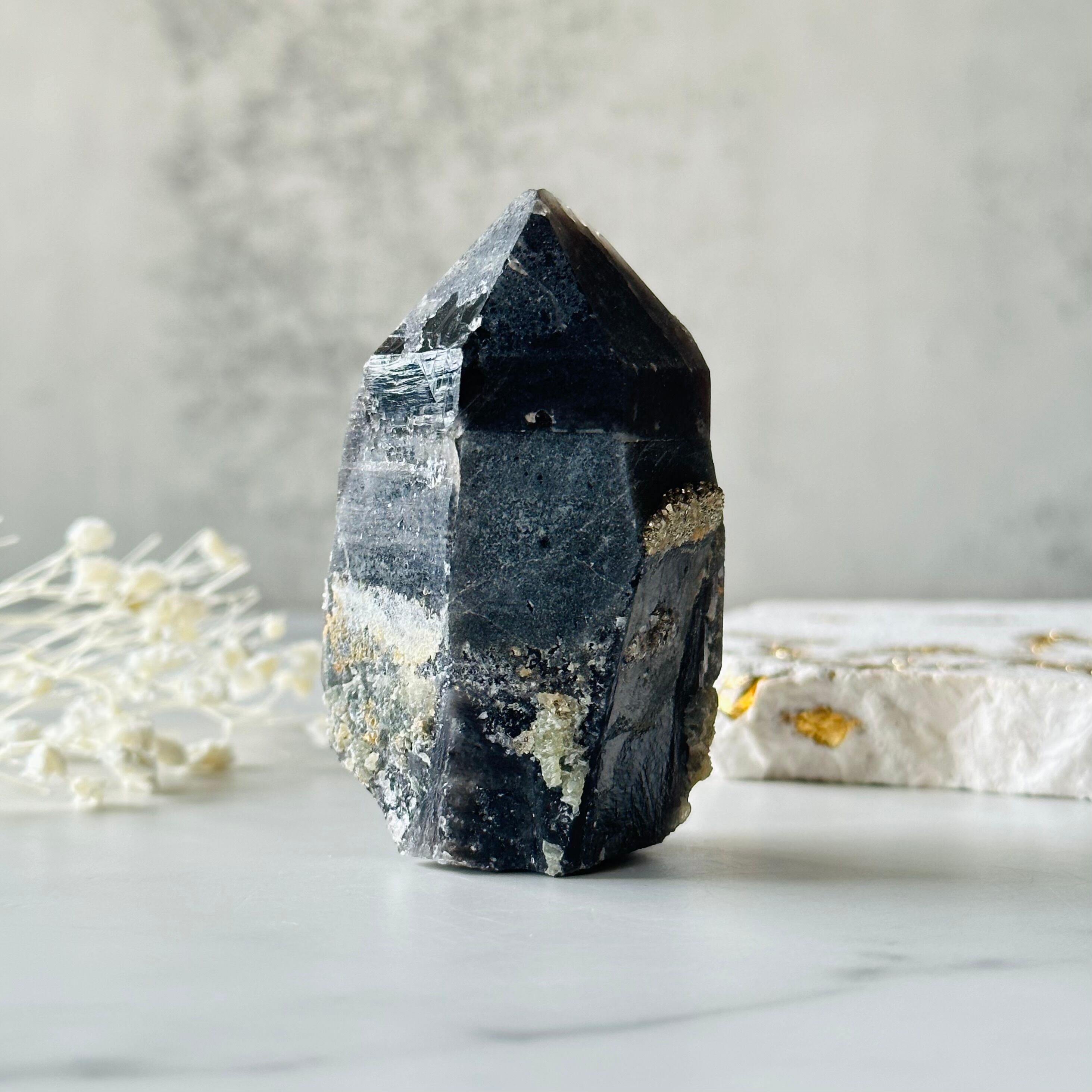 パイライトのアクセサリーを纏ったモリオンの原石です。
