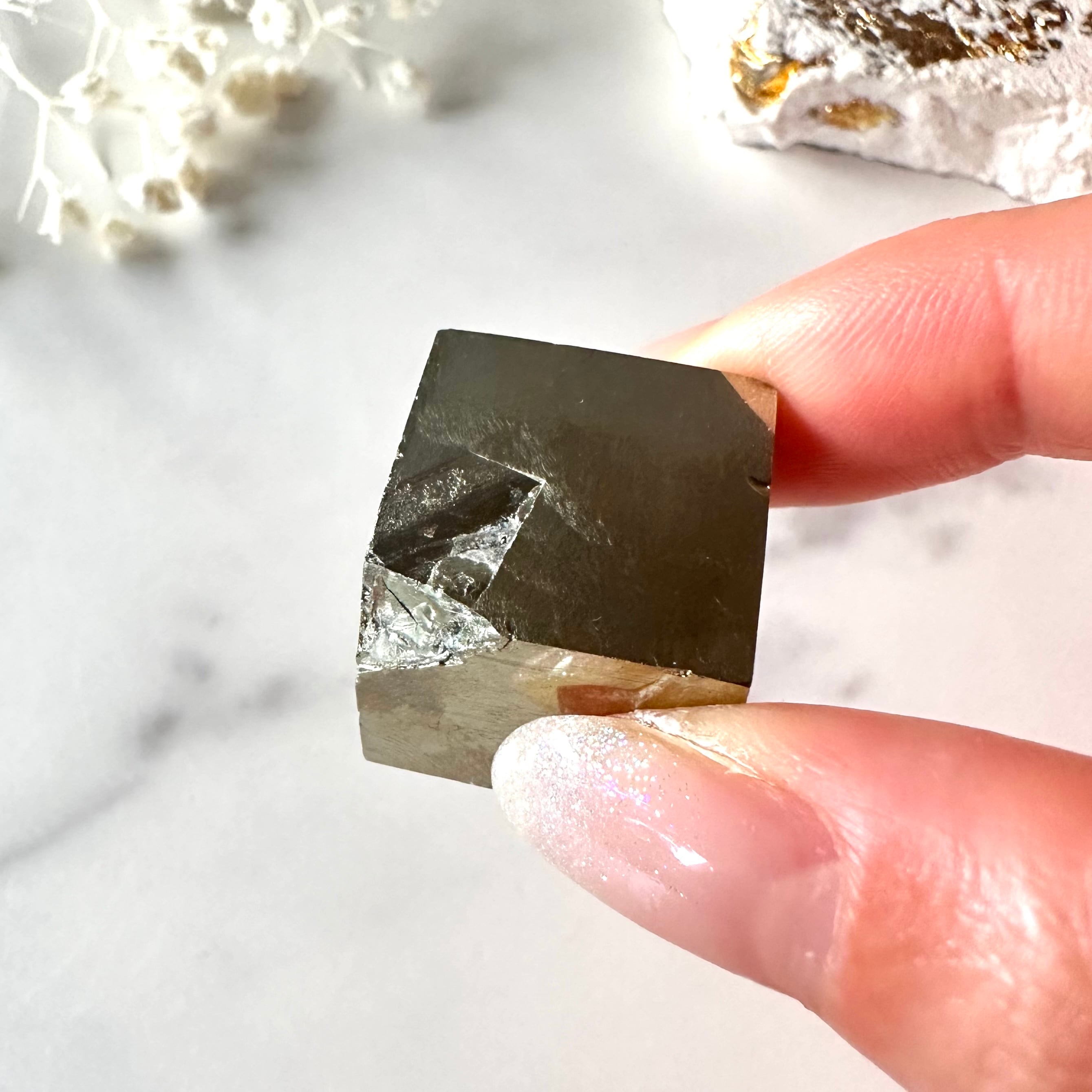 火山活動によって生成されたパイライトのスクエアキューブ。自然が生み出すメタリックなキューブからは上昇のエネルギーが溢れ出してくるかのようにパワフルです。金運アップにも良いと言われています。