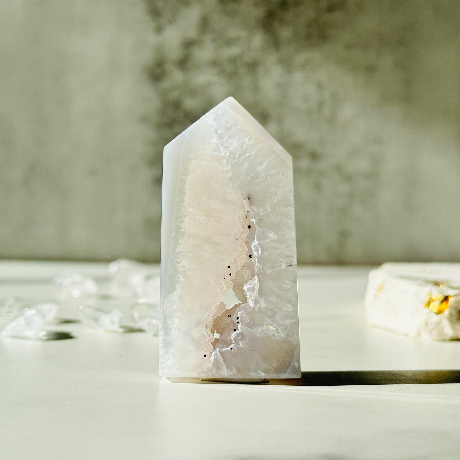 ライトグレーに白いザクザクした結晶が詰まったアゲートジオードタワーです。
