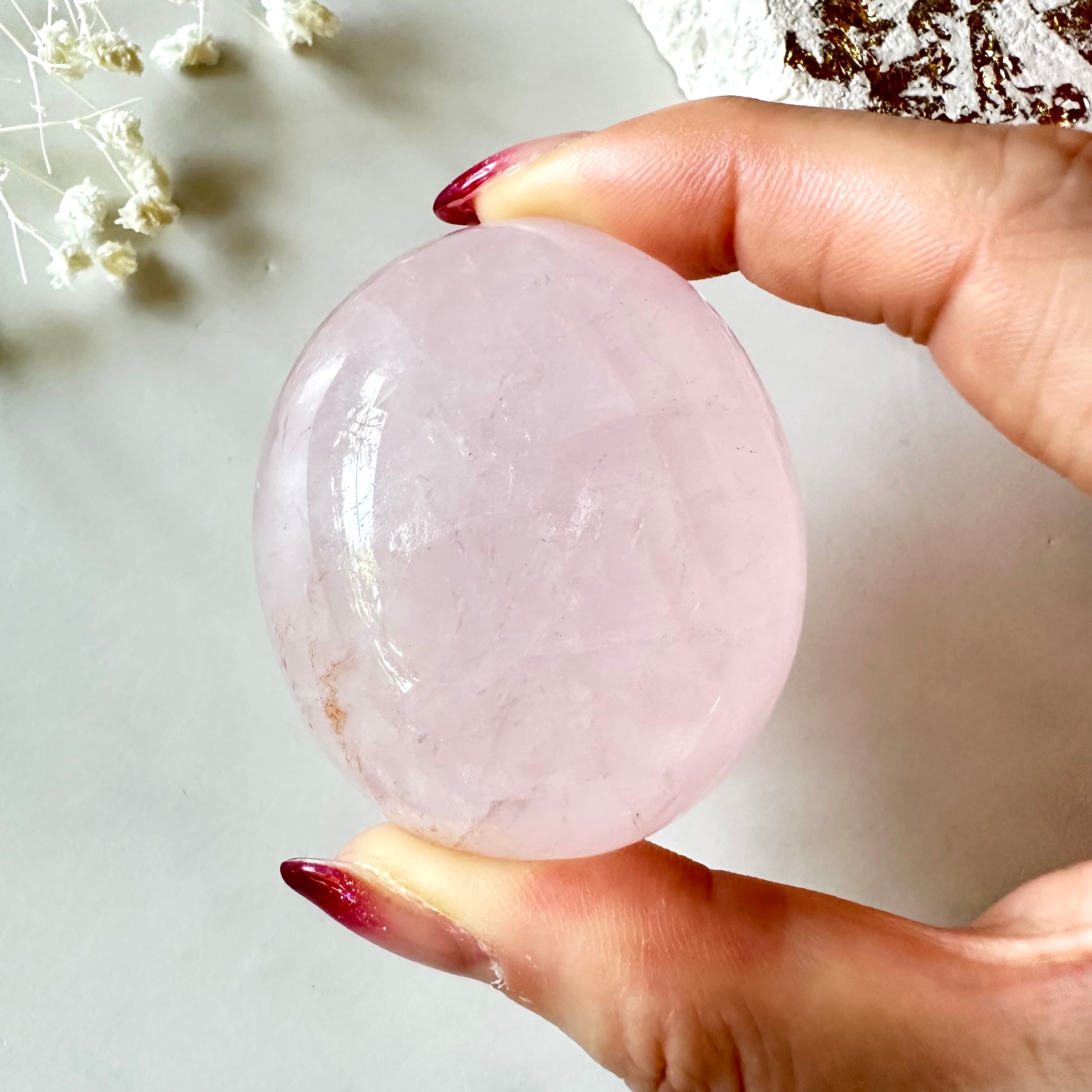 マダガスカル産スターローズクォーツのパームストーンです。ぷるんとしたみずみずしい質感の、とても綺麗なマダガスカル産ローズクォーツ。手のひらに載せて優しく握りしめて波動を感じてください。