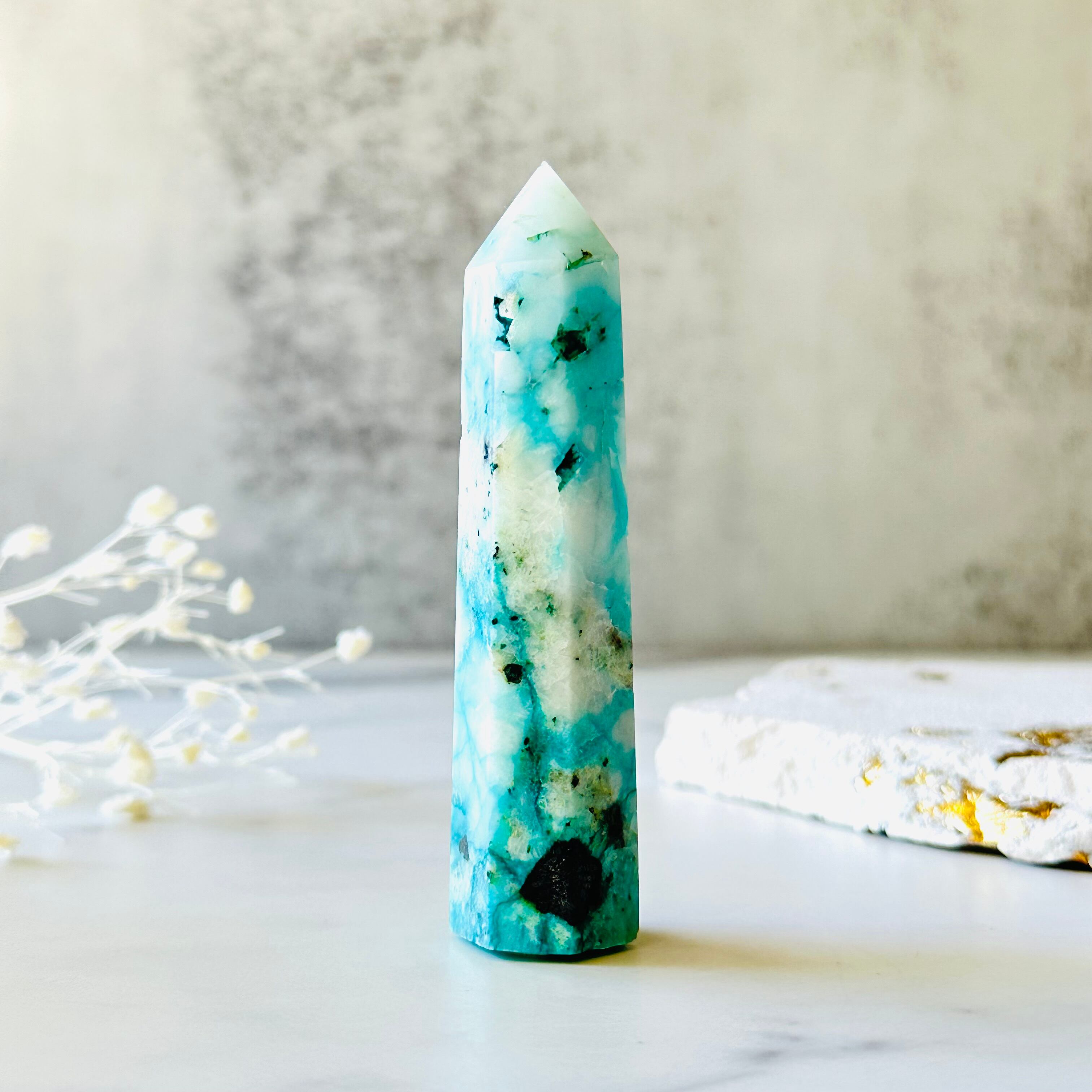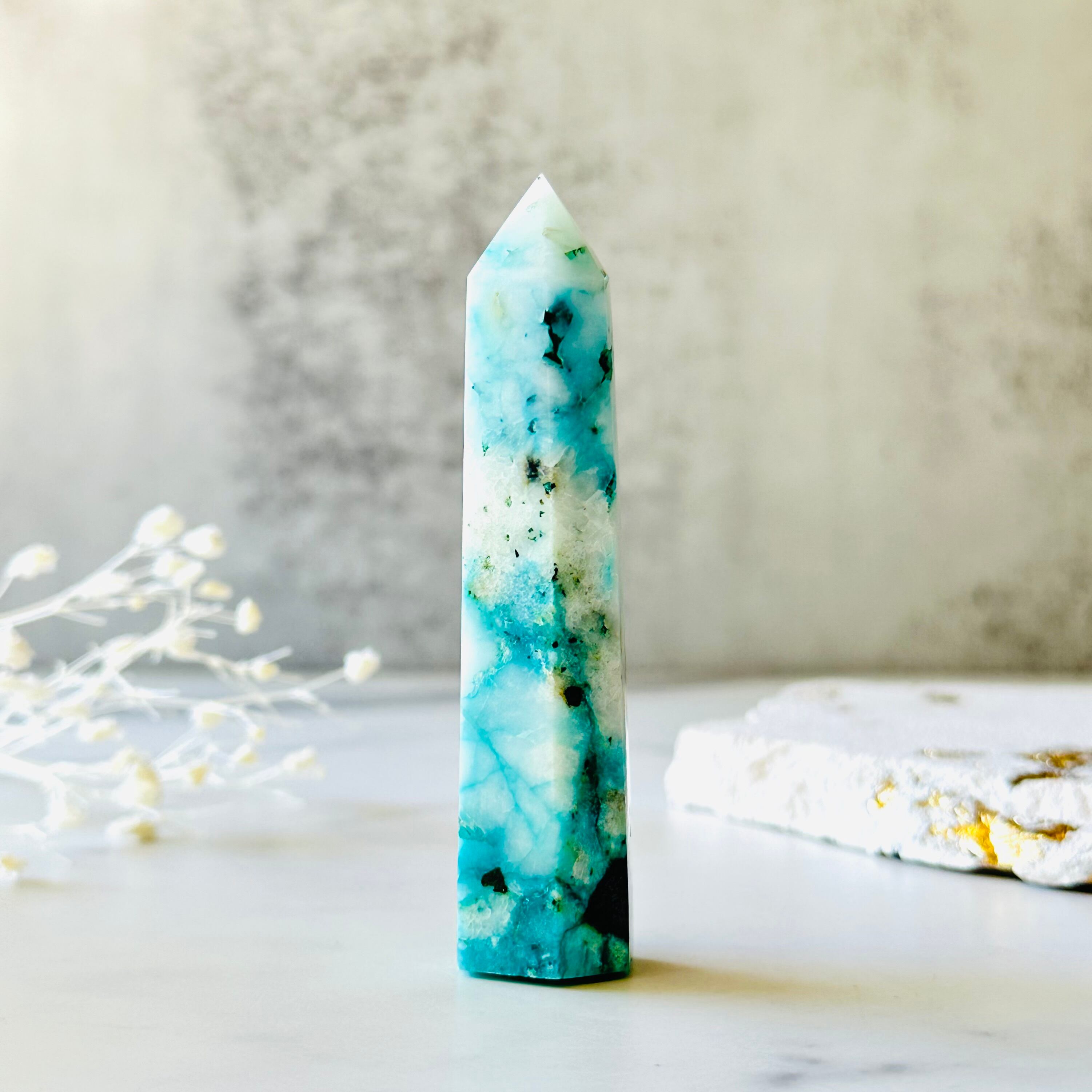 白いクォーツに爽やかなブルーとグリーンのマーブル模様が特徴のフェニックスストーンタワーです。