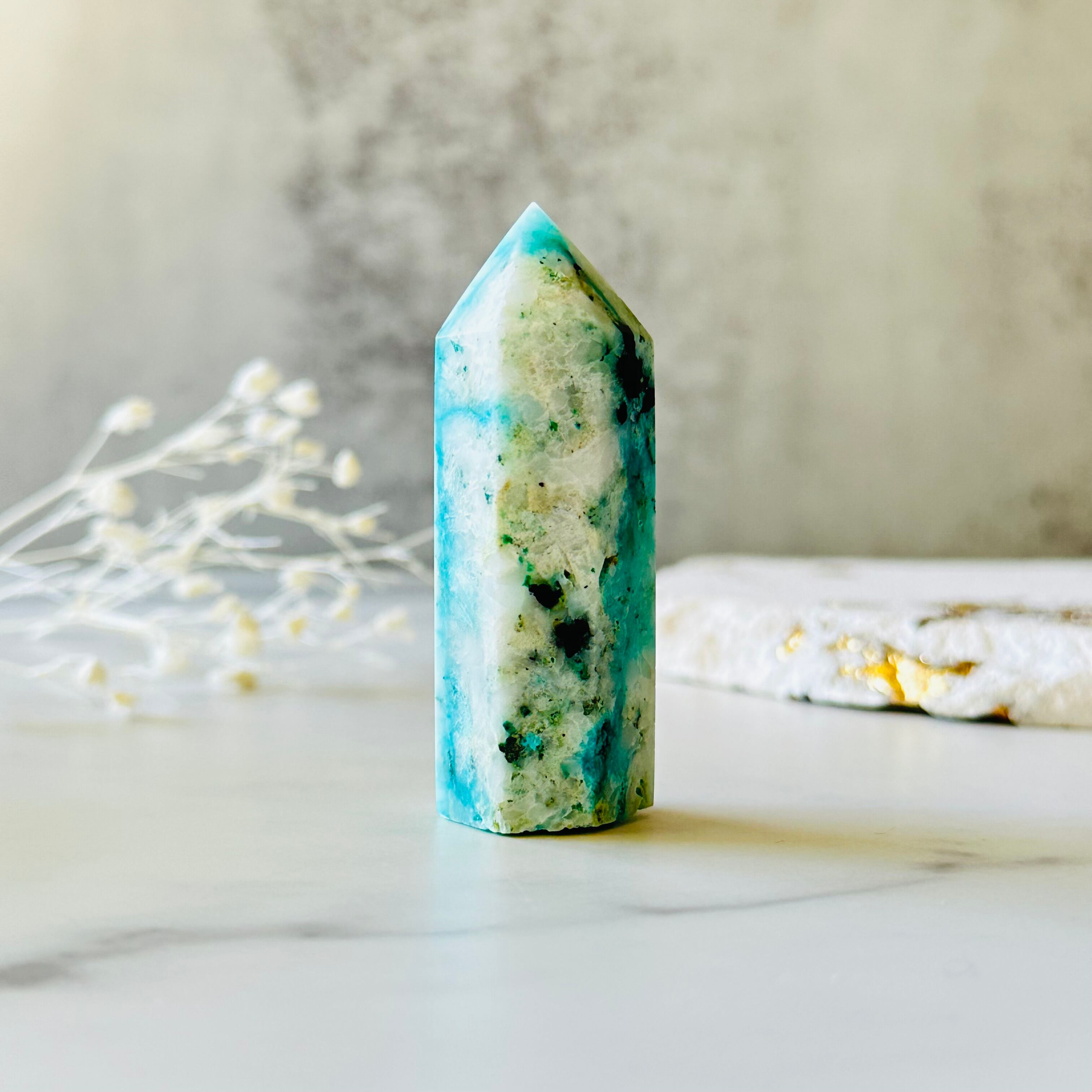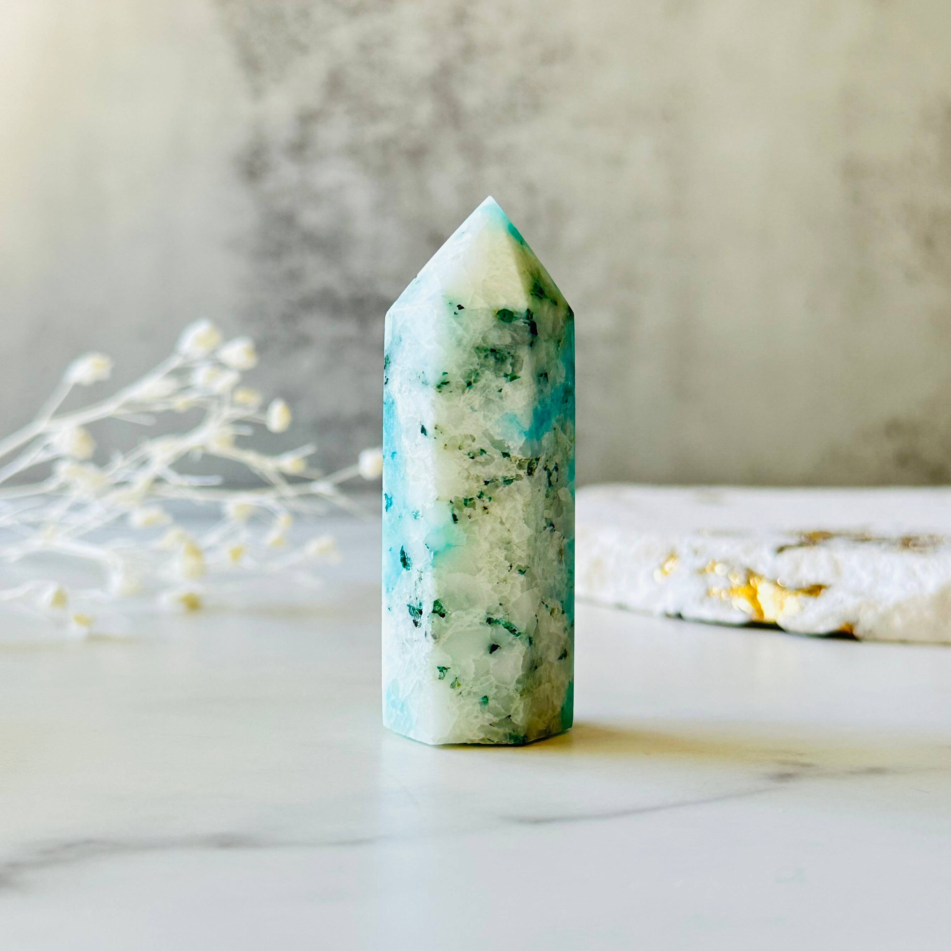 白いクォーツに爽やかなブルーとグリーンを流し込んだような模様が特徴のフェニックスストーンタワーです。
