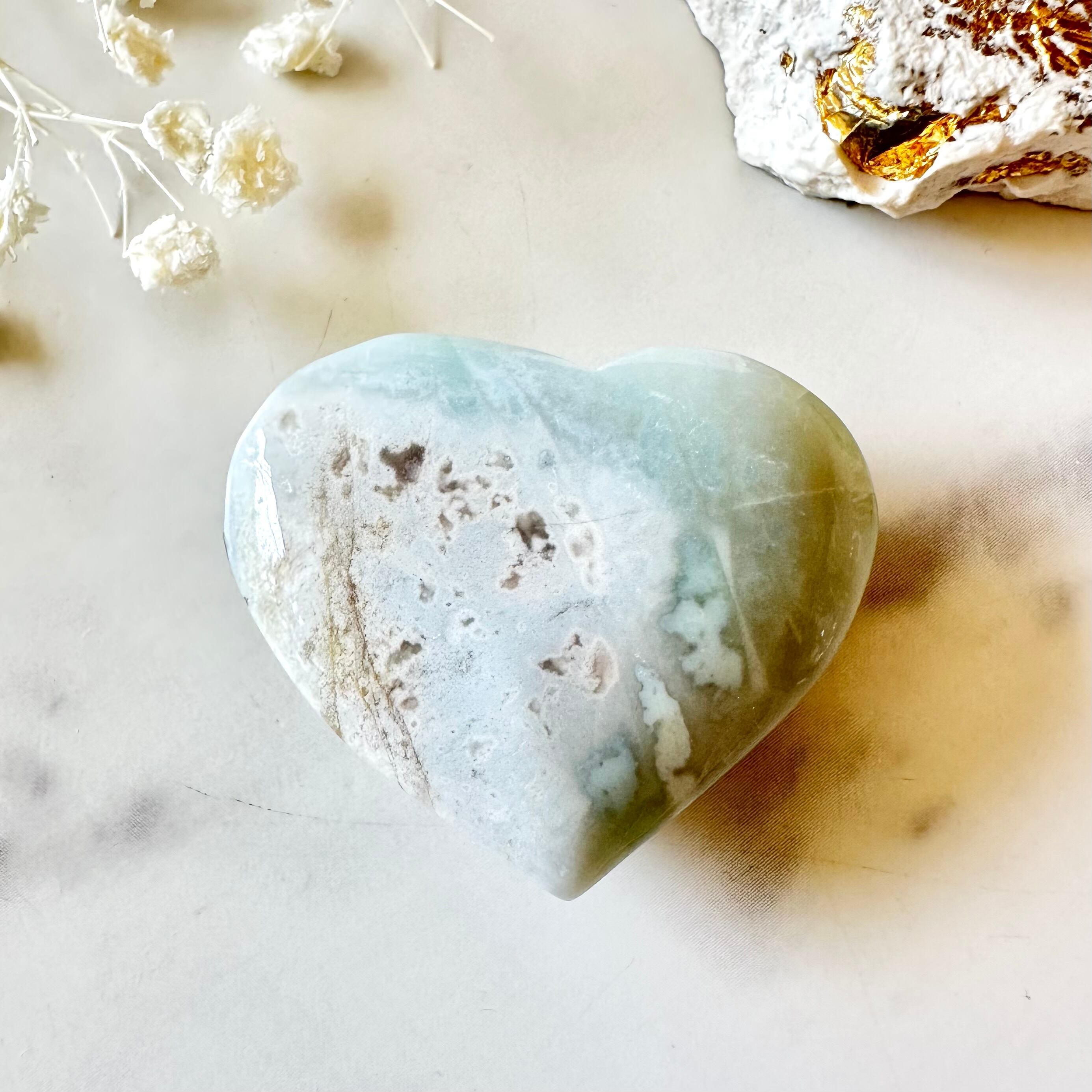 水色に近い淡いエメラルドグリーンとホワイト、グレージュが優しい色合いのハート型グリーンフラワーアゲートです。