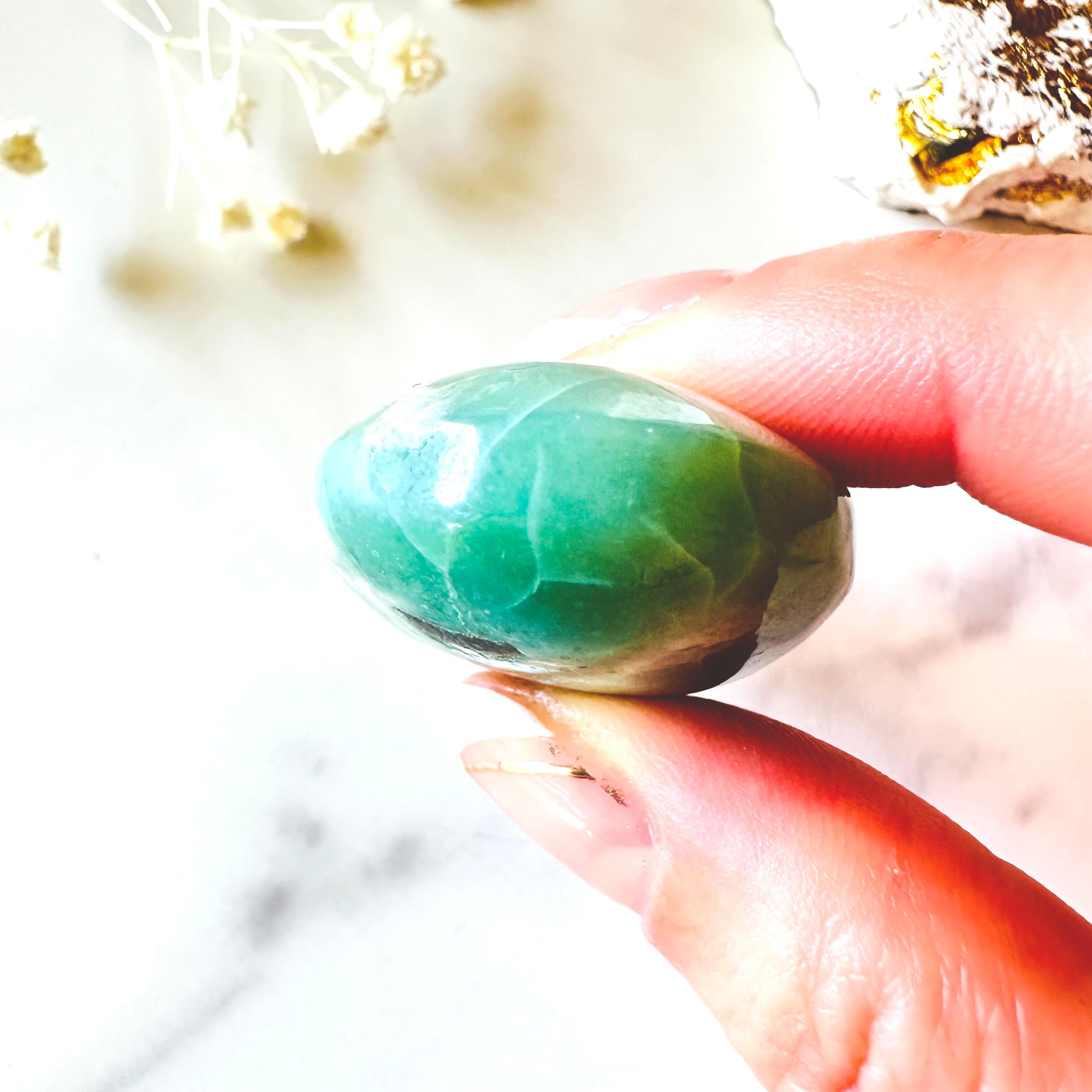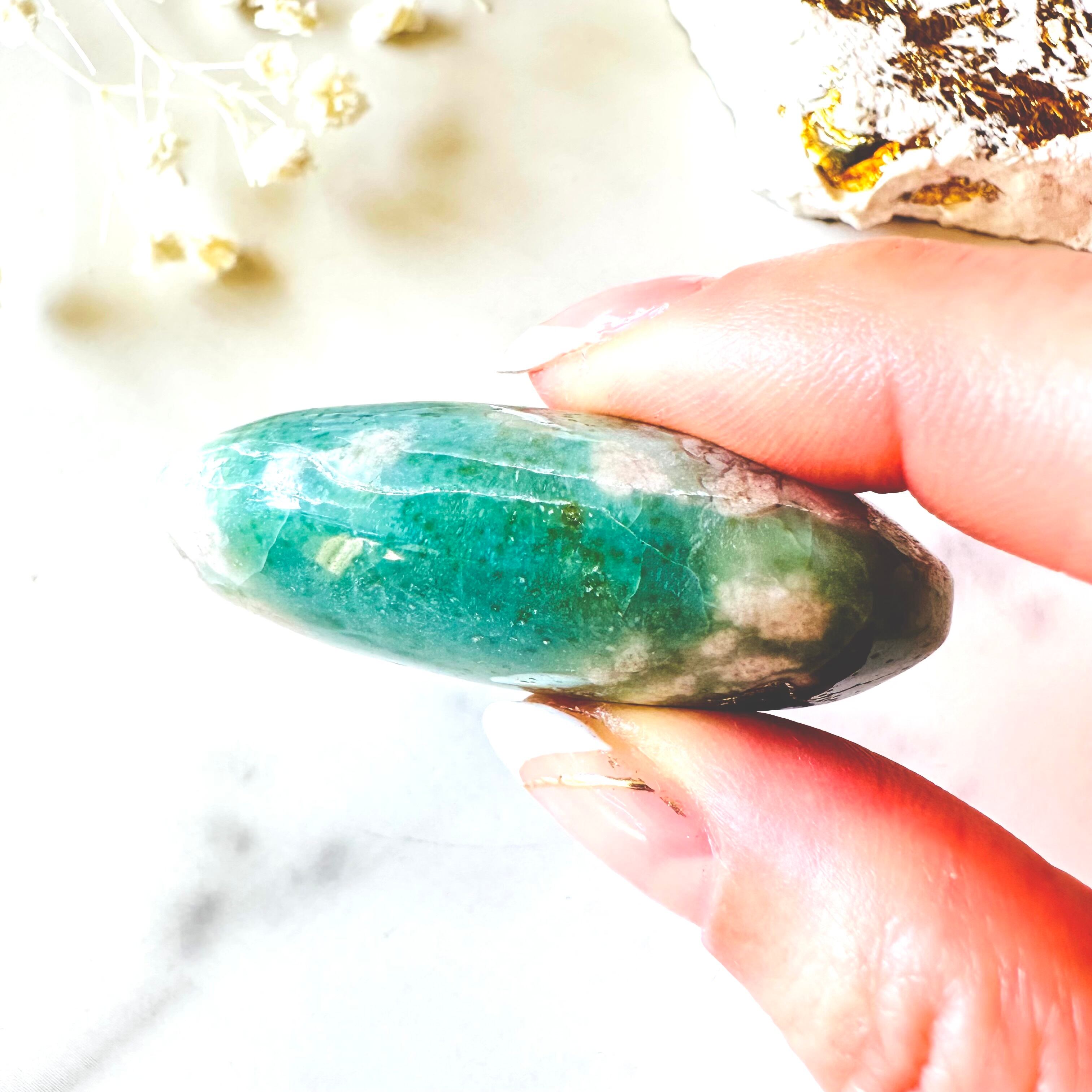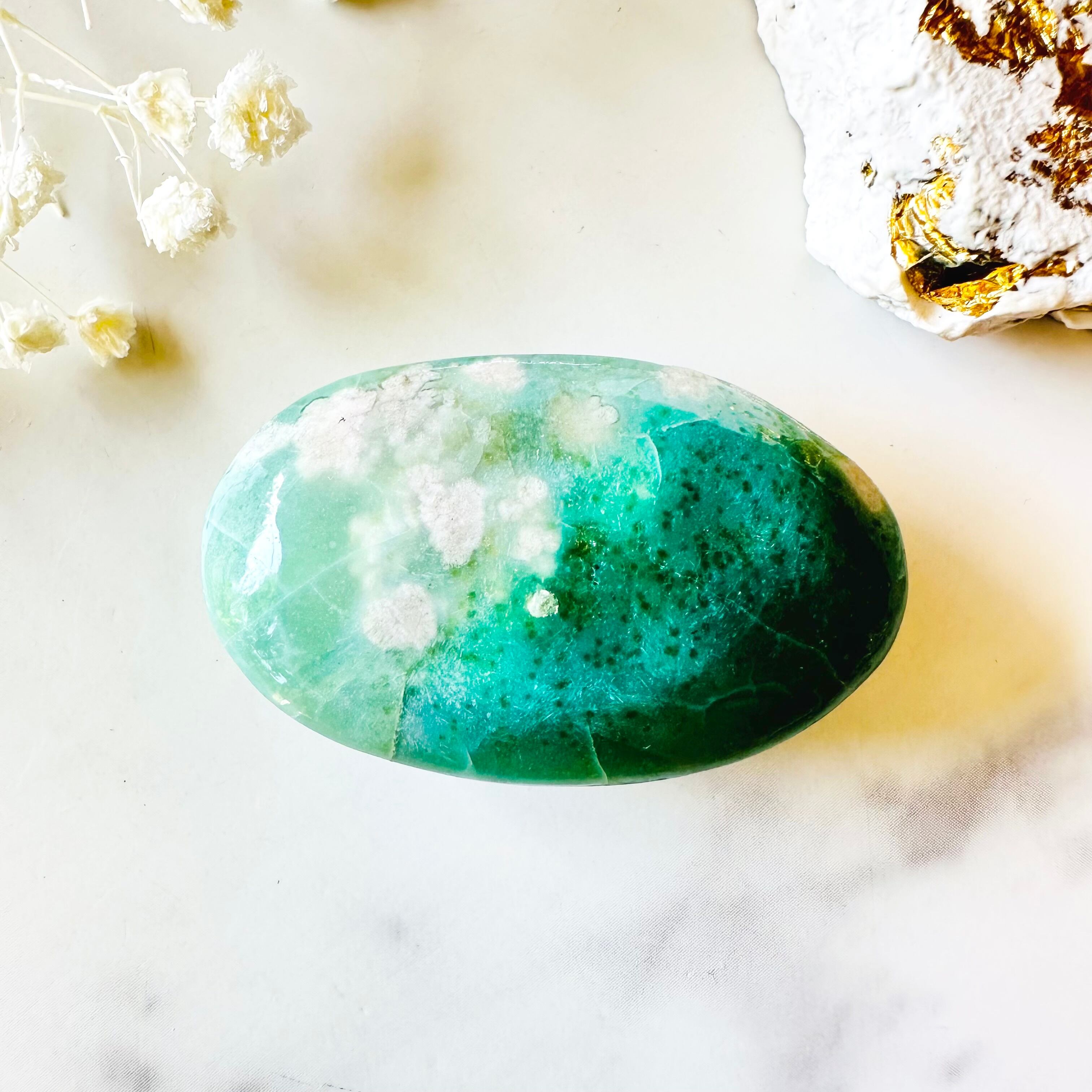 鮮やかなエメラルドグリーンの中に白いお花が咲いたような模様のパーム型のグリーンフラワーアゲートです。デザインはシンプルでありながら、存在感がありインテリアとしてもお部屋を華やかに彩ってくれます。