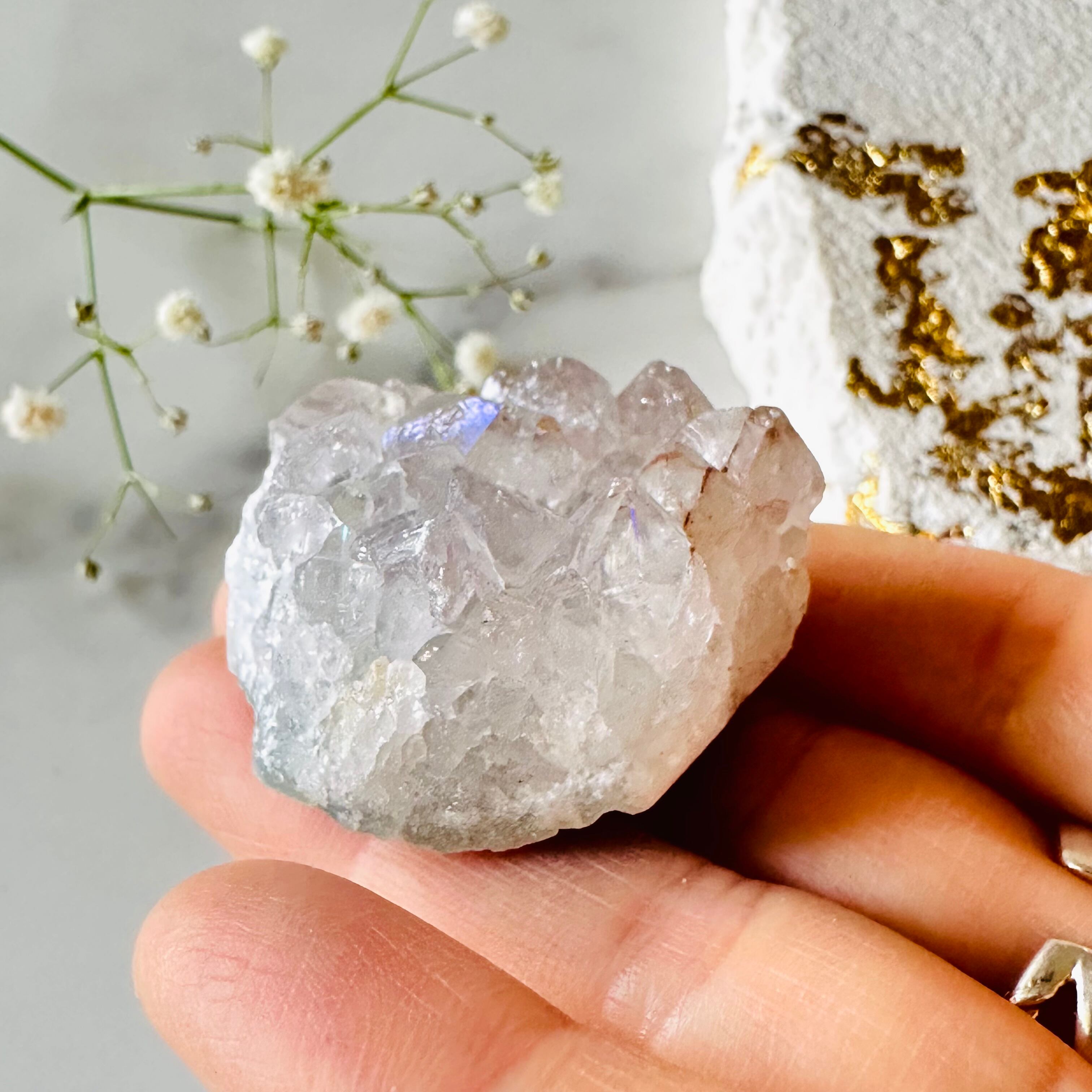 レインボークォーツとも呼ばれ、薄紫色の虹があちらこちらに輝く美しい石です。