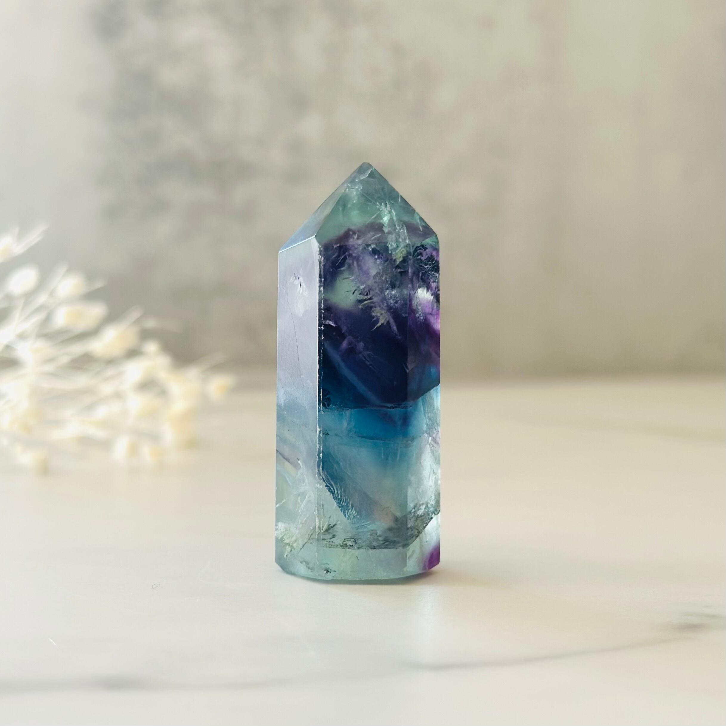 グリーンに紫のジグザクの層が入っているフローライトポイントです。