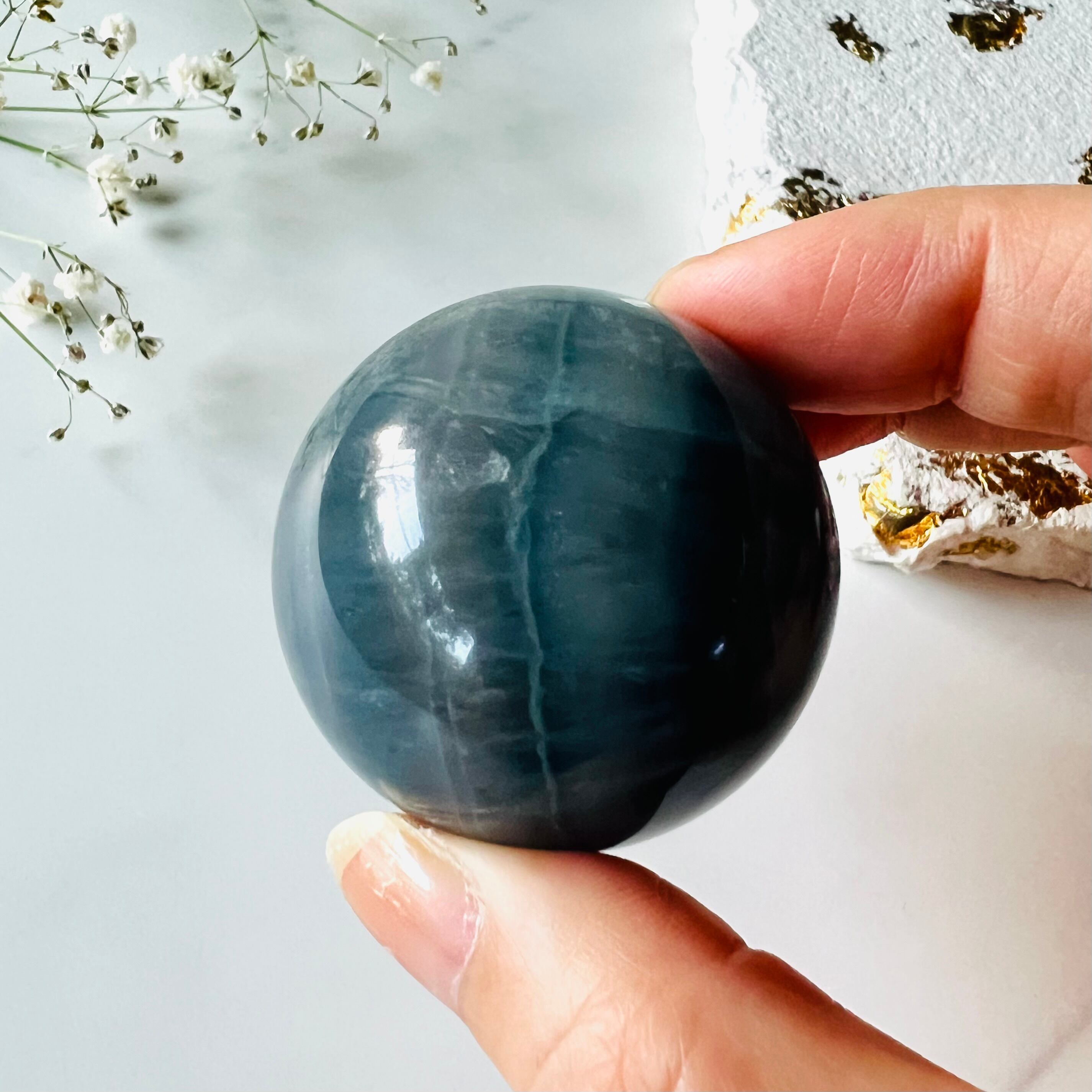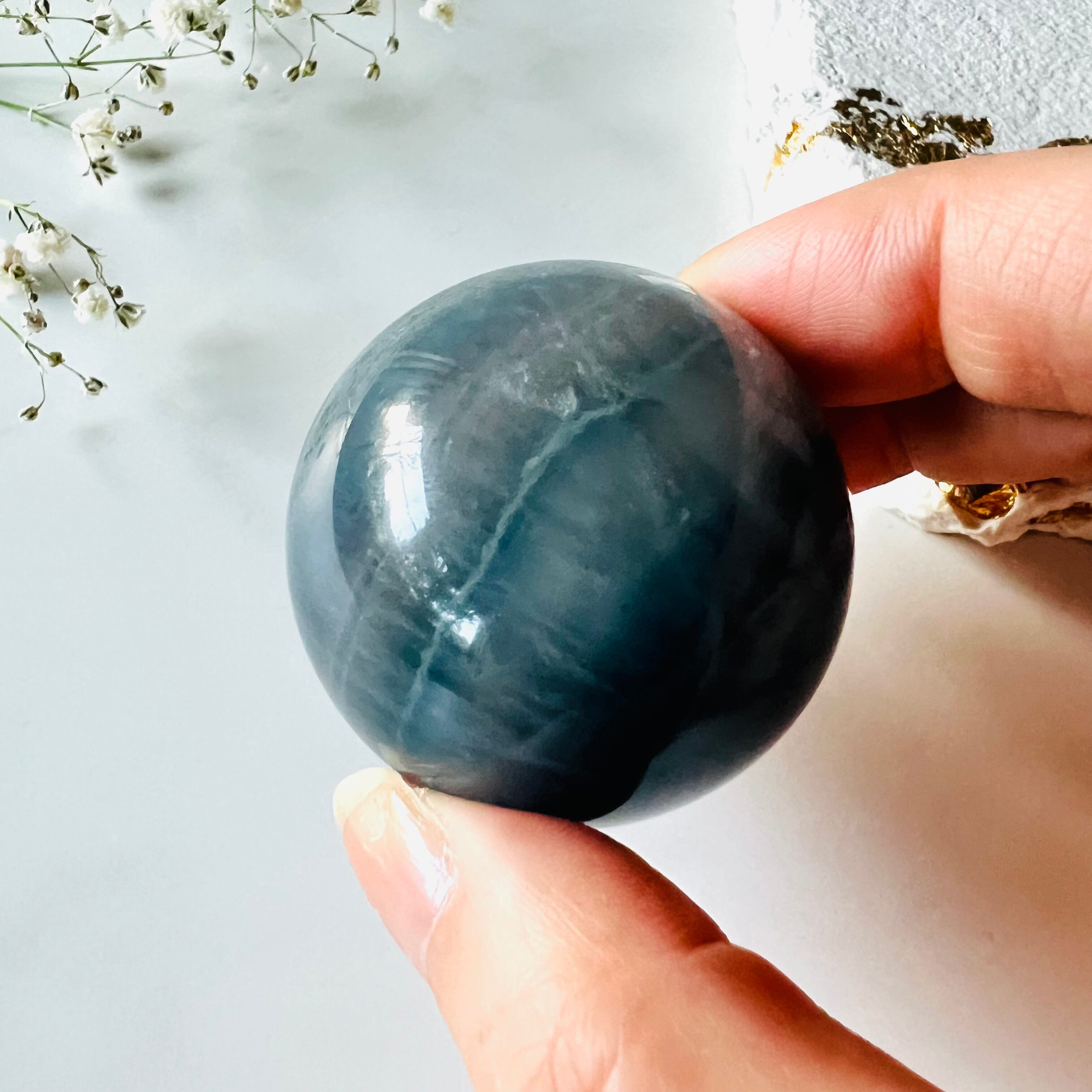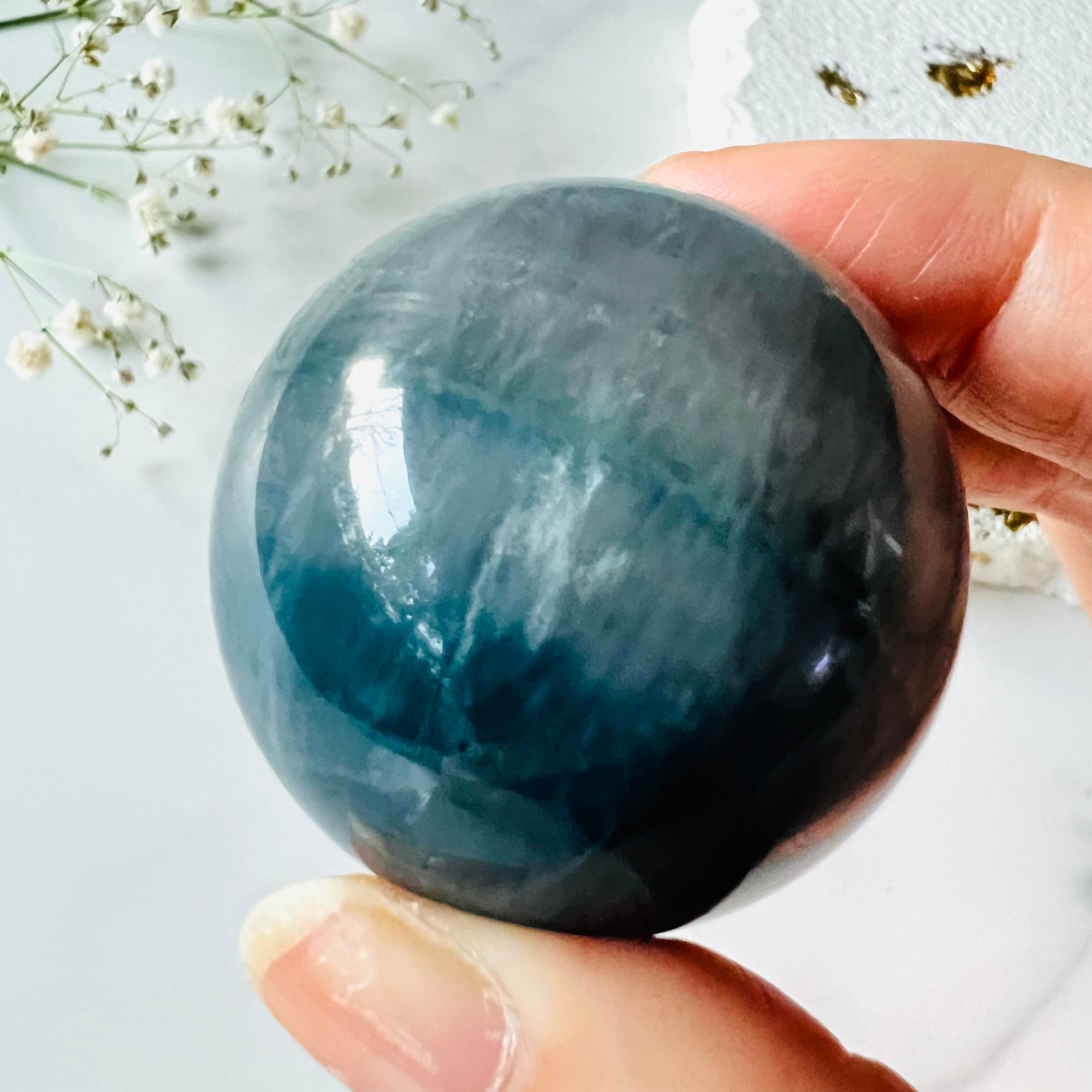 深海を連想させる深いブルーが神秘的なブルーフローライトのスフィアです。