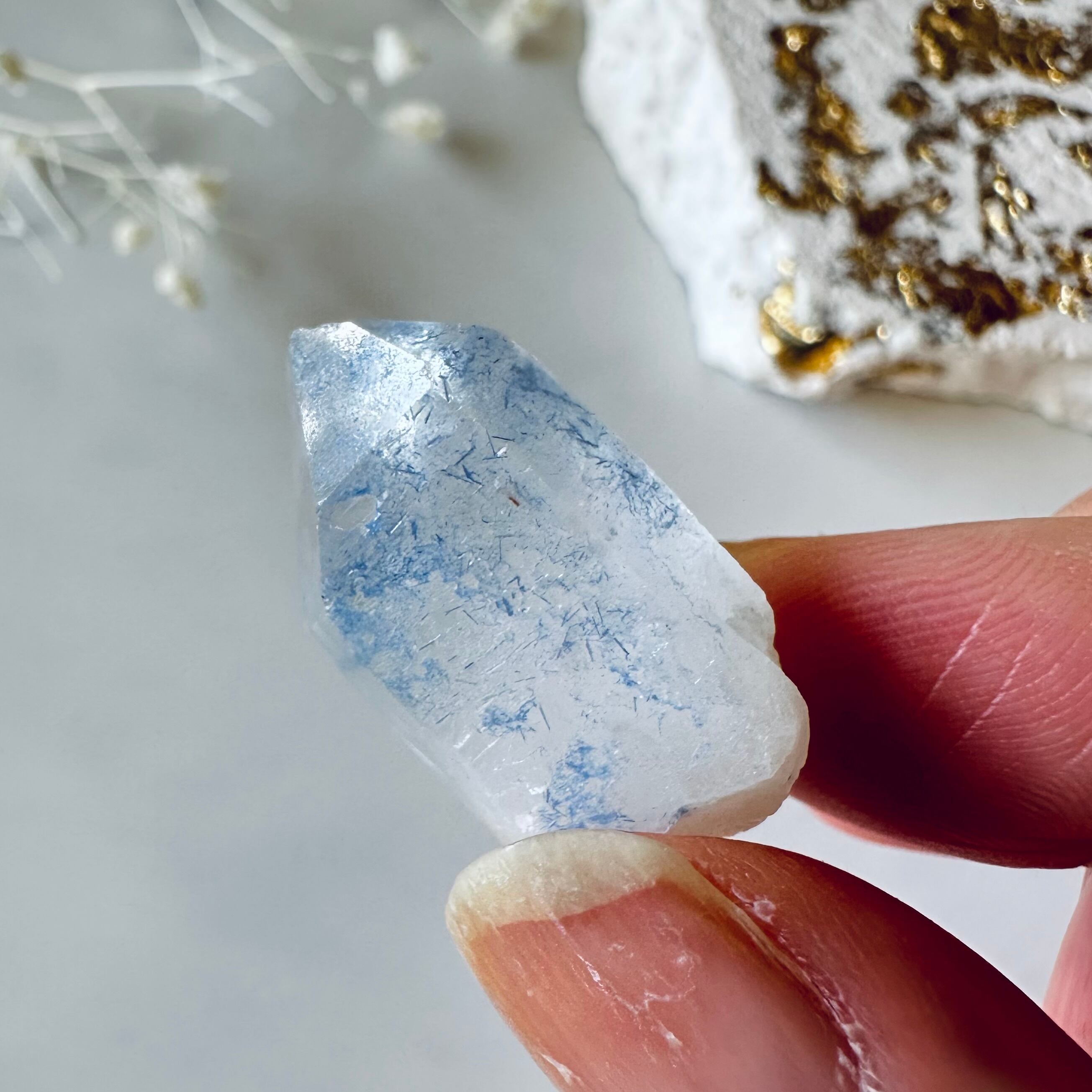 美しいブルーの石、デュモルチェライト。クォーツの表面に無数の針状結晶が散らばりキラキラと輝きます。美しいブルーの色合いと繊細な造形が魅力です。