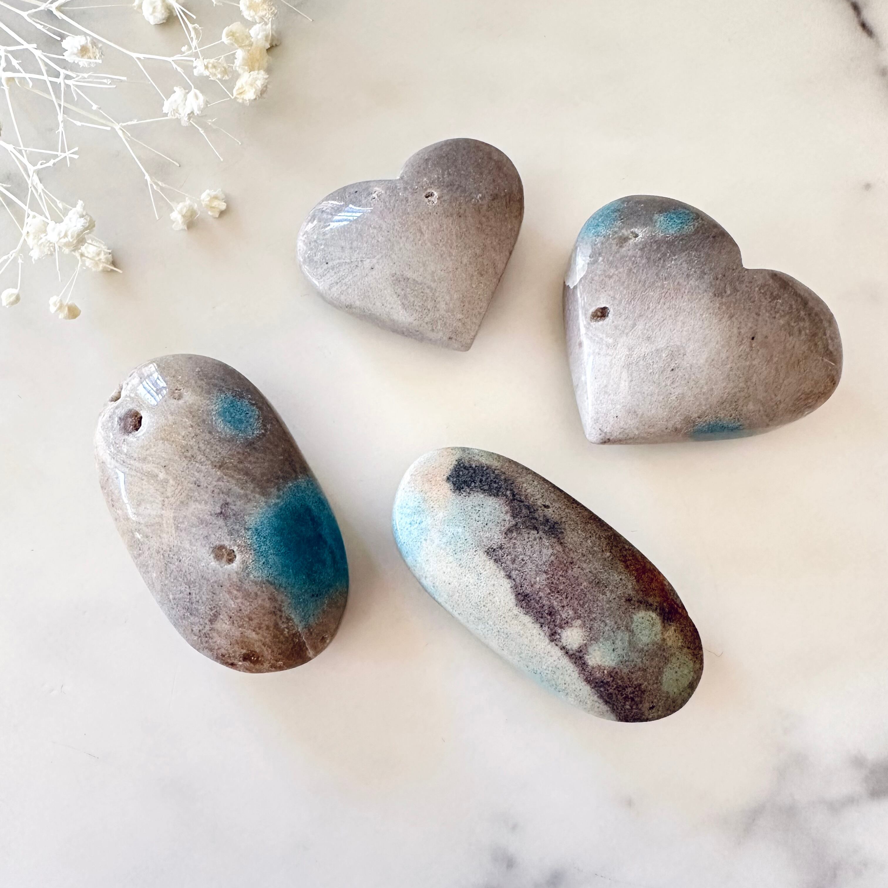 ふんわりとした抽象的な印象のあるトロレアイト。絵本の中の世界のようにメルヘンで可愛らしく、どこか懐かしい気持ちにさせてくれる不思議な雰囲気を持つ石です。つるんとした石に明るい水色がポツンポツンと入っていてます。穏やかな気持ちになるセットです。