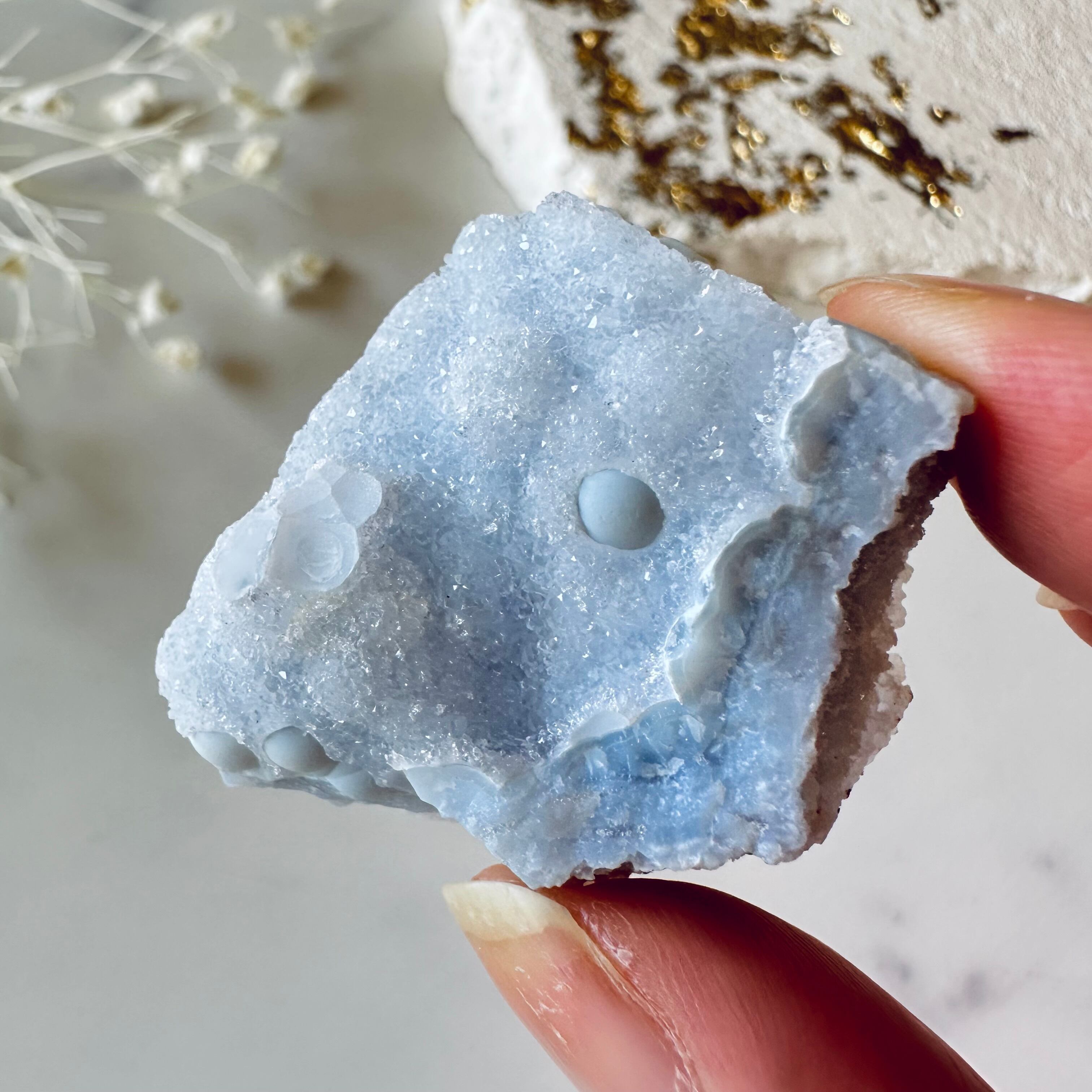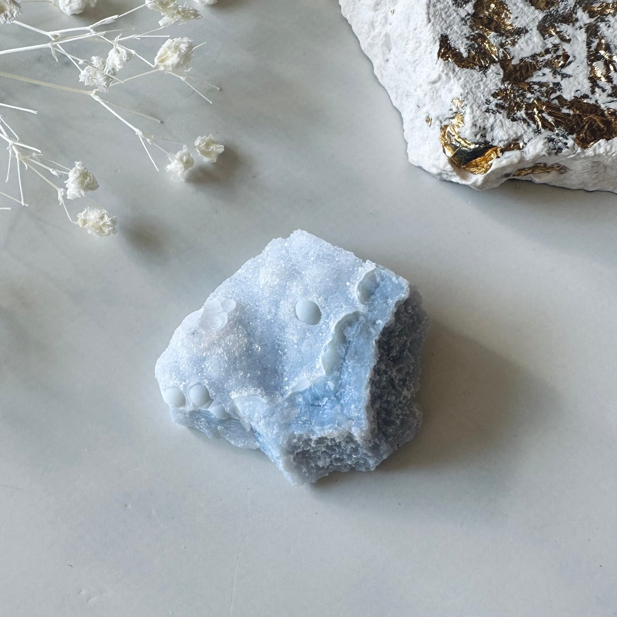 産地のマラウイ共和国はあまり知られていませんが、アフリカ南東部にある小さな内陸国で、アメジストやアクアマリンなどの天然石が採掘されています。ブルーレースアゲートは高価なことで知られる天然石ですが今回は原石のままの形でお求めやすくなっています。