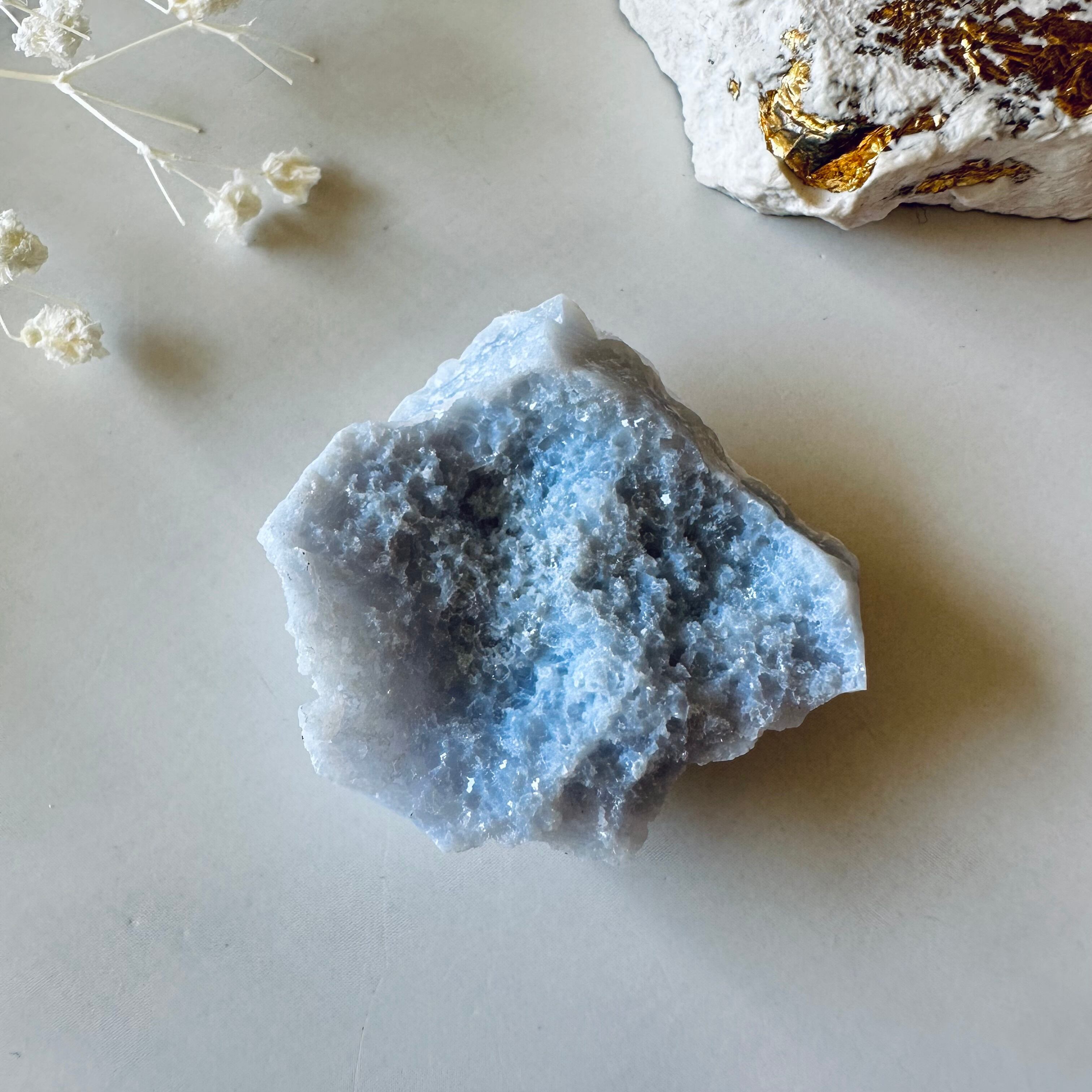 淡いサックスブルーが上品な印象のブルーレースアゲートの原石です。