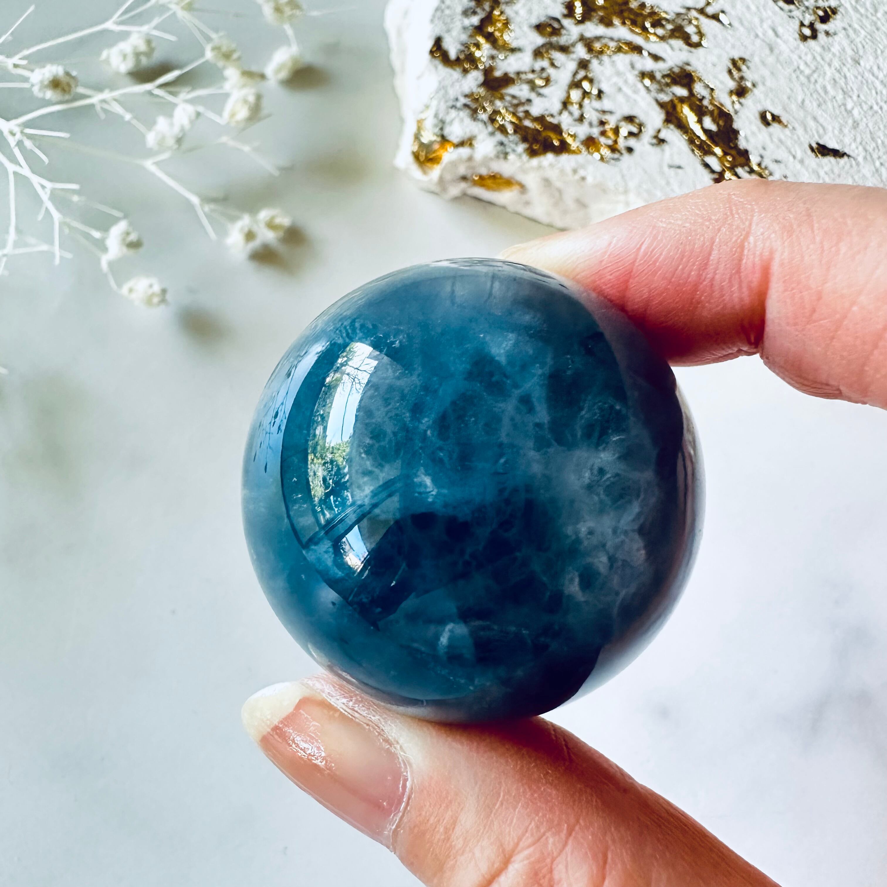 深海を連想させる深いブルーが神秘的なブルーフローライトのスフィアです。