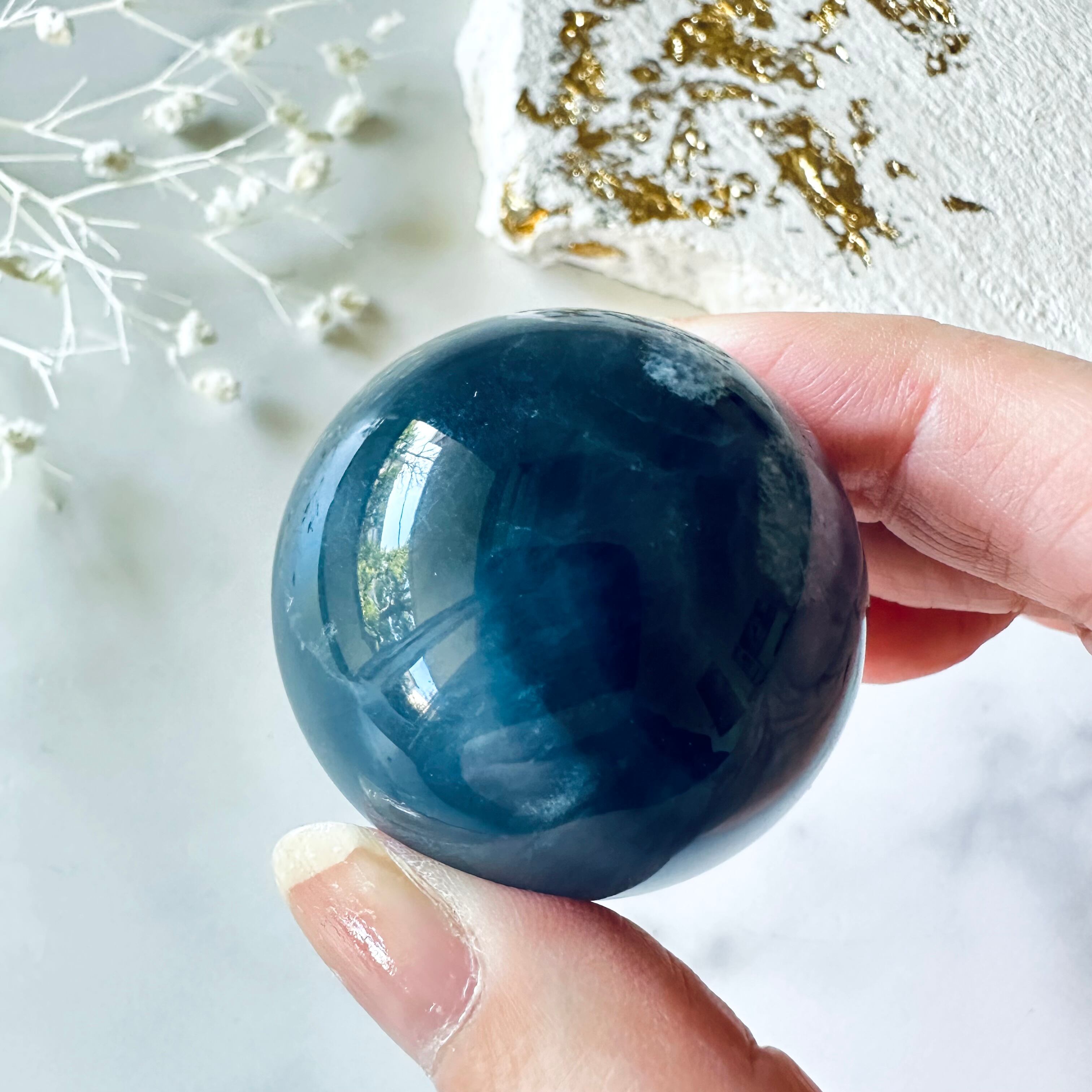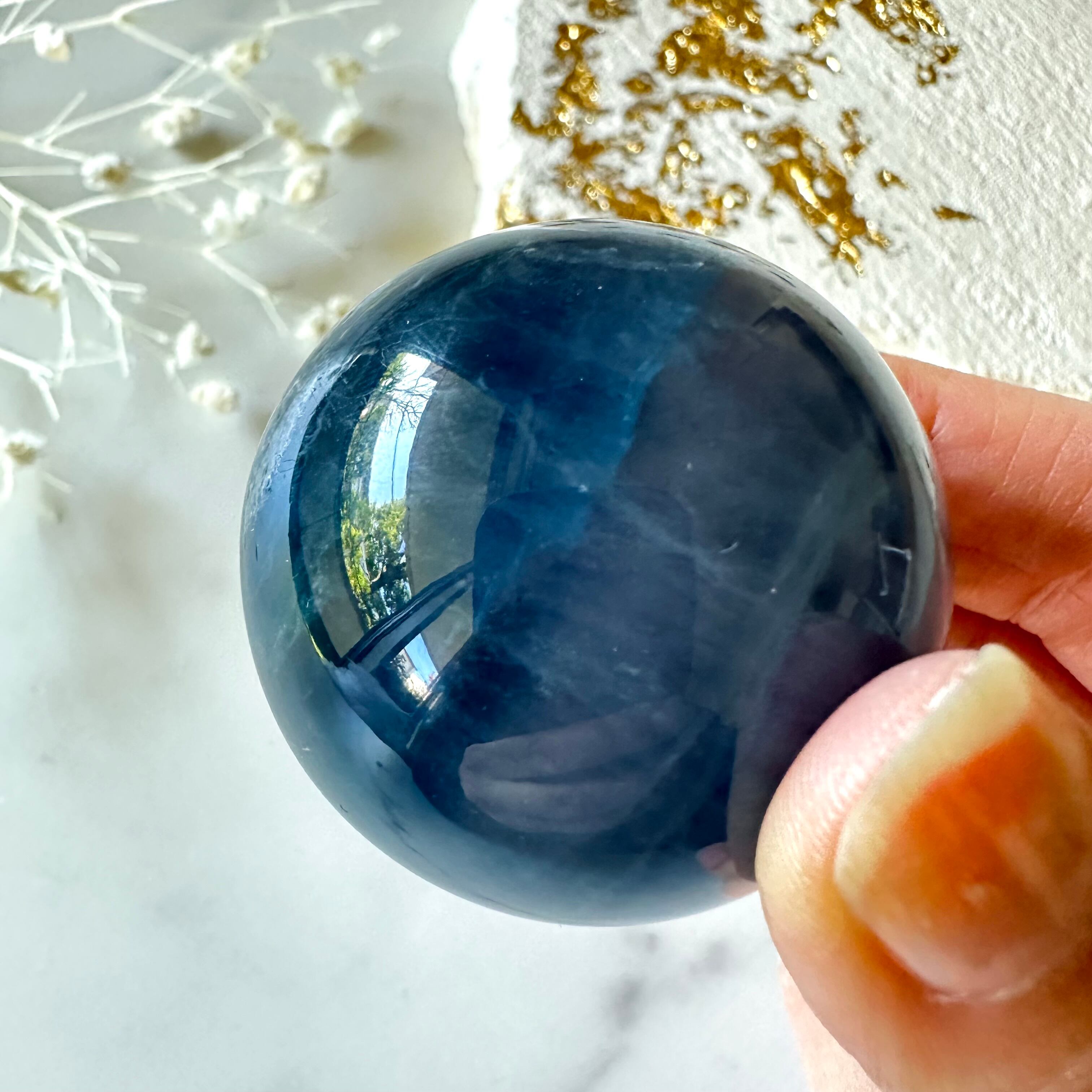 深海を連想させる深いブルーが神秘的なブルーフローライトのスフィアです。