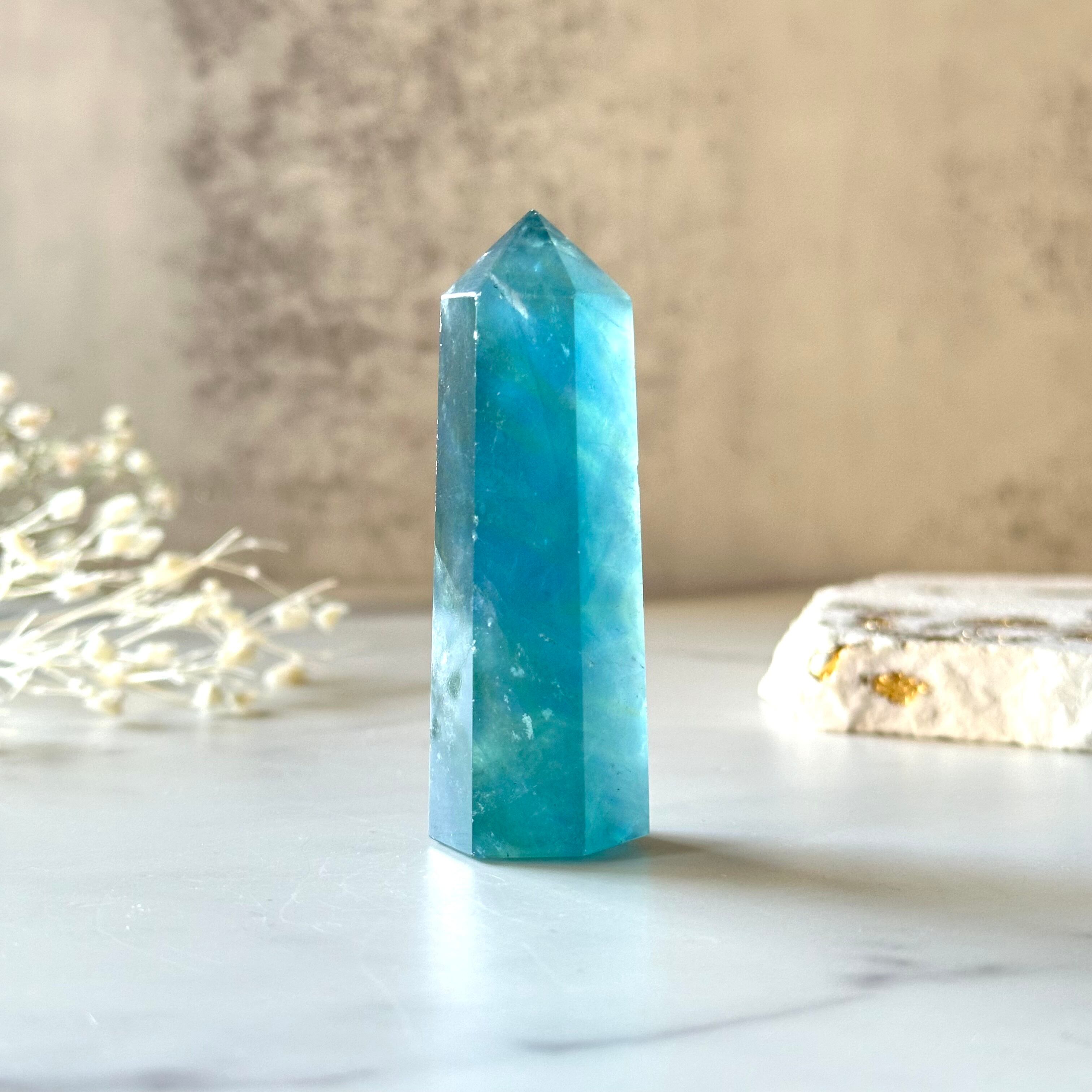 ブルーの陰影がきれいなブルーフローライトのタワーです。神秘的なその美しさは、まるで音のない静謐な深海の世界のようです。