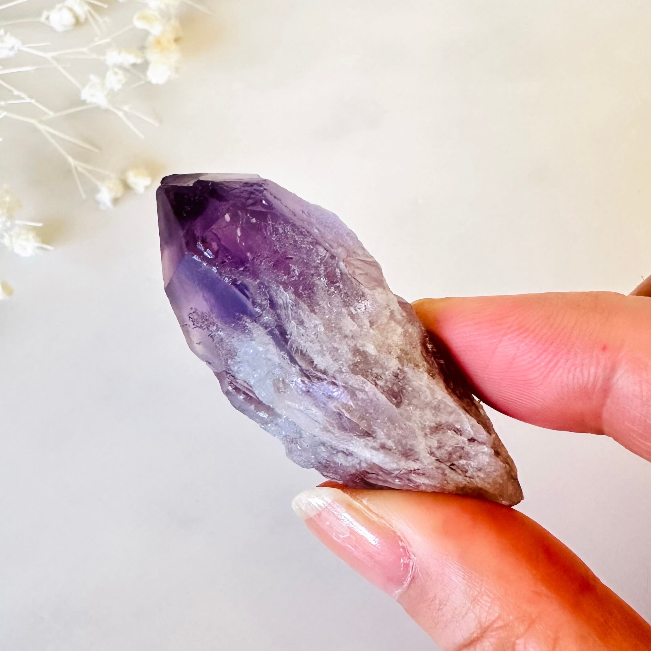 内部に紫色の山が入ったファントムアメジストの原石です。天使の指紋も見られます。