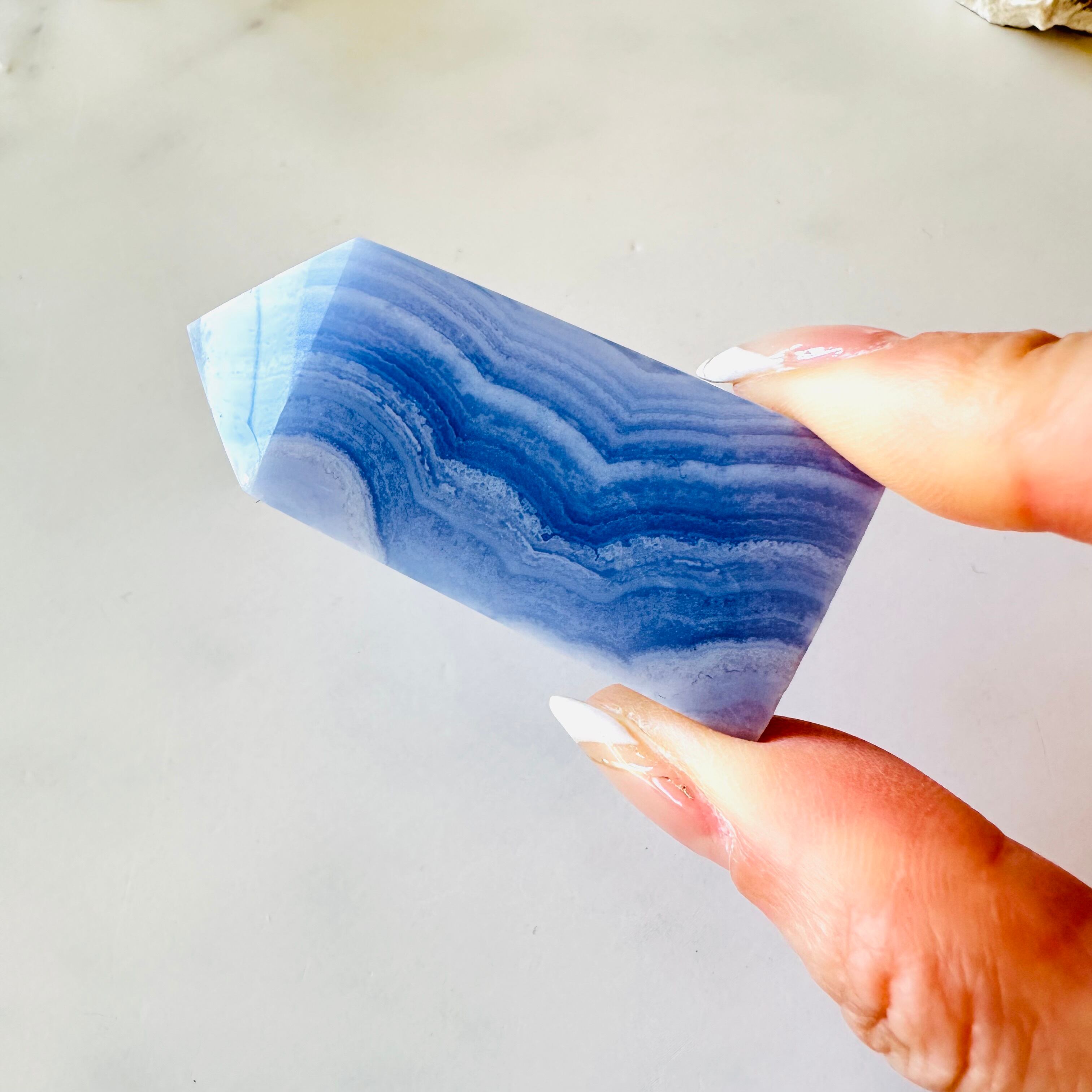淡いサックスブルーに幾重にも重なったレース模様が上品な印象のブルーレースアゲートのミニタワーです。自然が作り出した繊細なレース模様がとても上品で綺麗です。