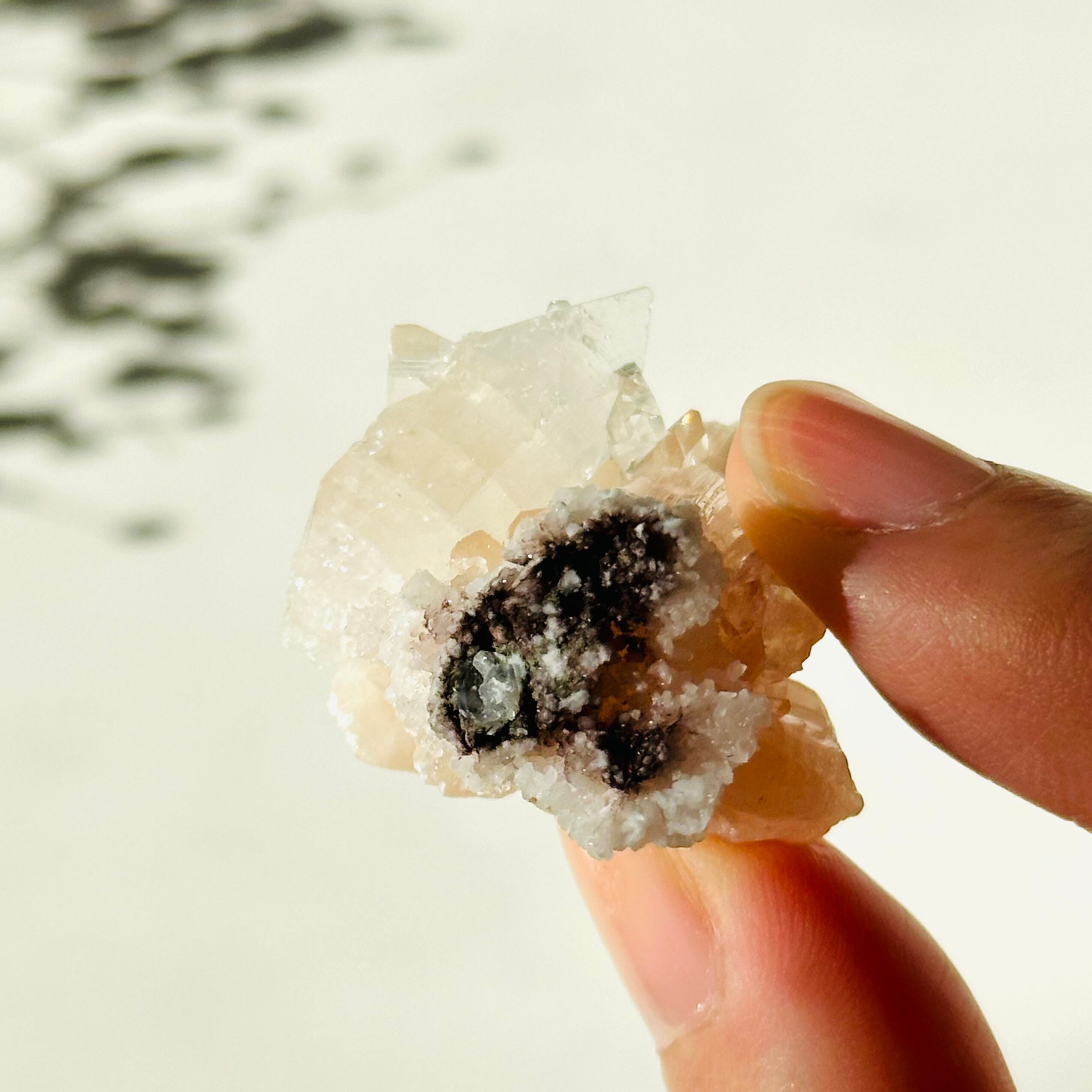 アポフィライトと共生しており、キラキラのアポフィライトとキラキラ光るシルクのように繊細な結晶のスティルバイトが組み合わさり、唯一無二の美しいクラスターです。ほんのりベージュピンク色のスティルバイトは見ているだけで優しく穏やかな気持ちになれるような気がします。