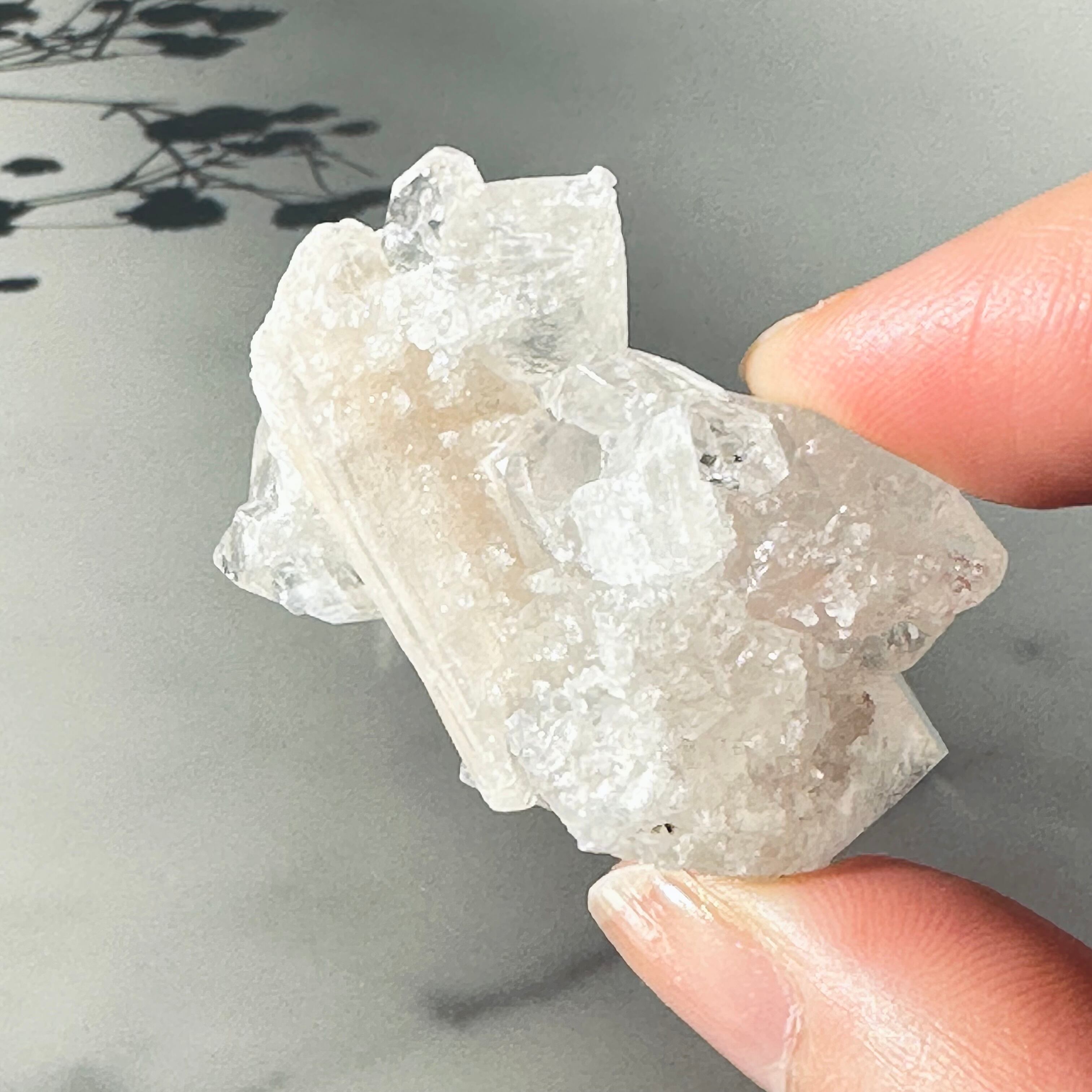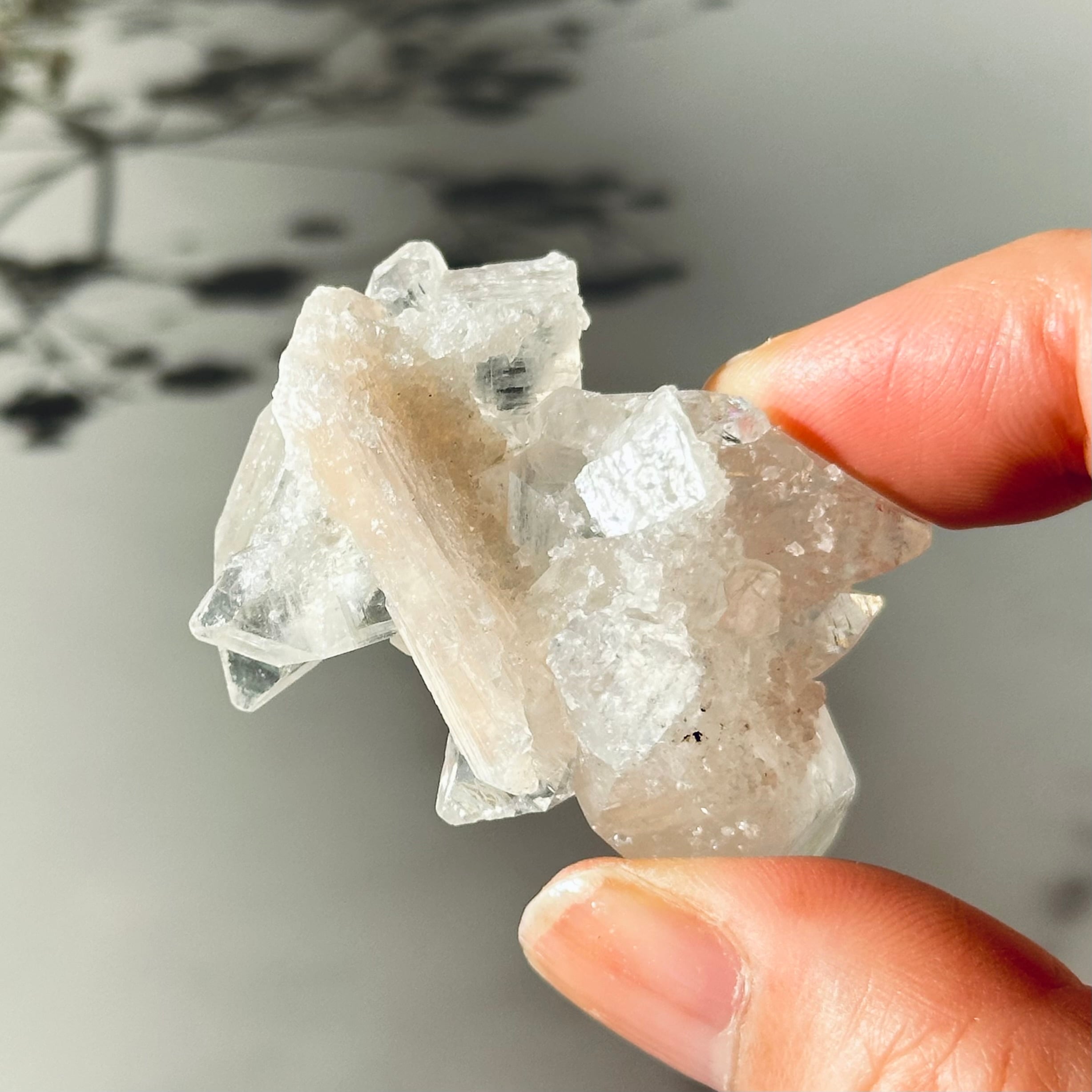 アポフィライトと共生しており、キラキラのアポフィライトとキラキラ光るシルクのように繊細な結晶のスティルバイトが組み合わさり、唯一無二の美しいクラスターです。ほんのりベージュピンク色のスティルバイトは見ているだけで優しく穏やかな気持ちになれるような気がします。