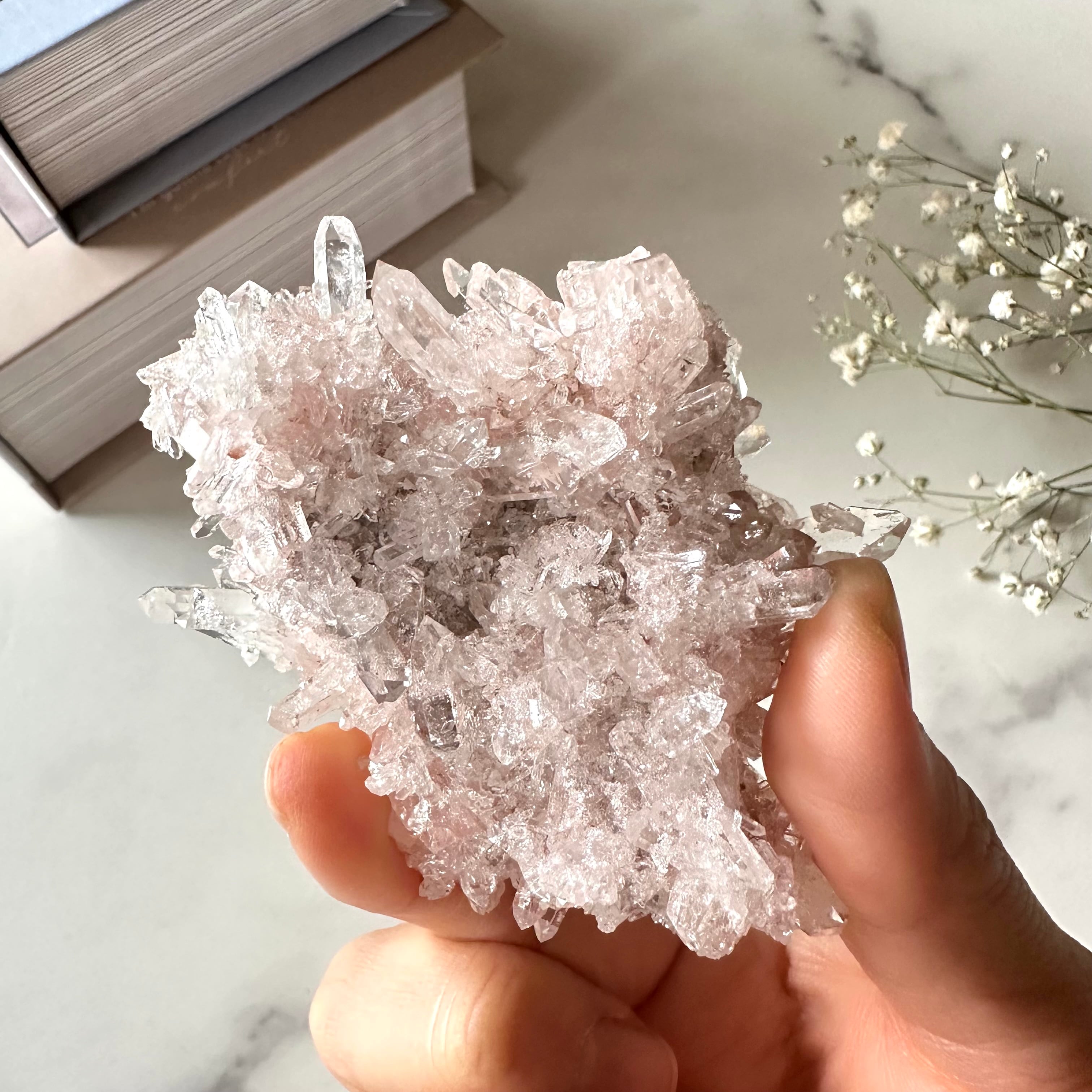 結晶は透き通ってクリア、淡いピンクの色合いが美しく形も整ったアイテムです。