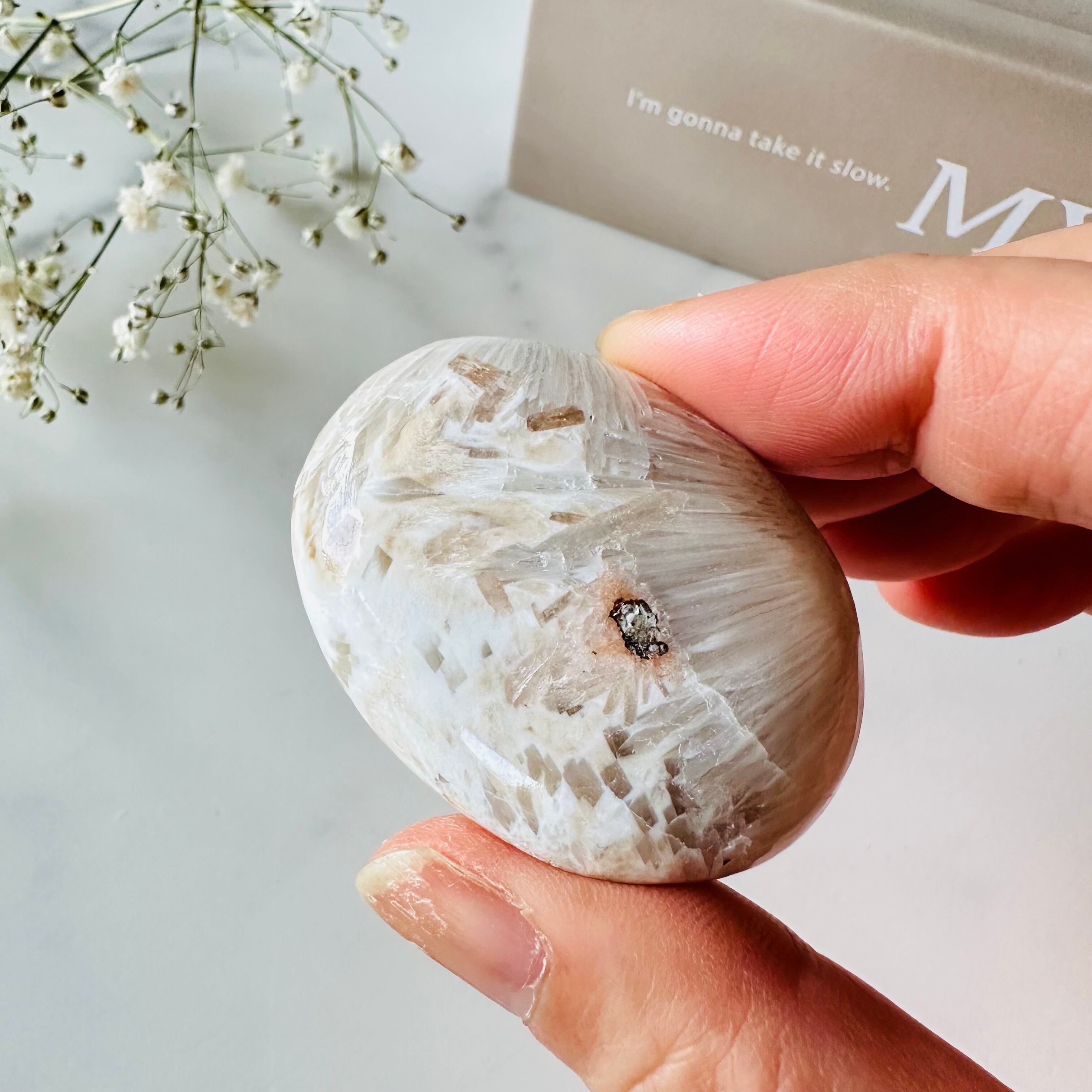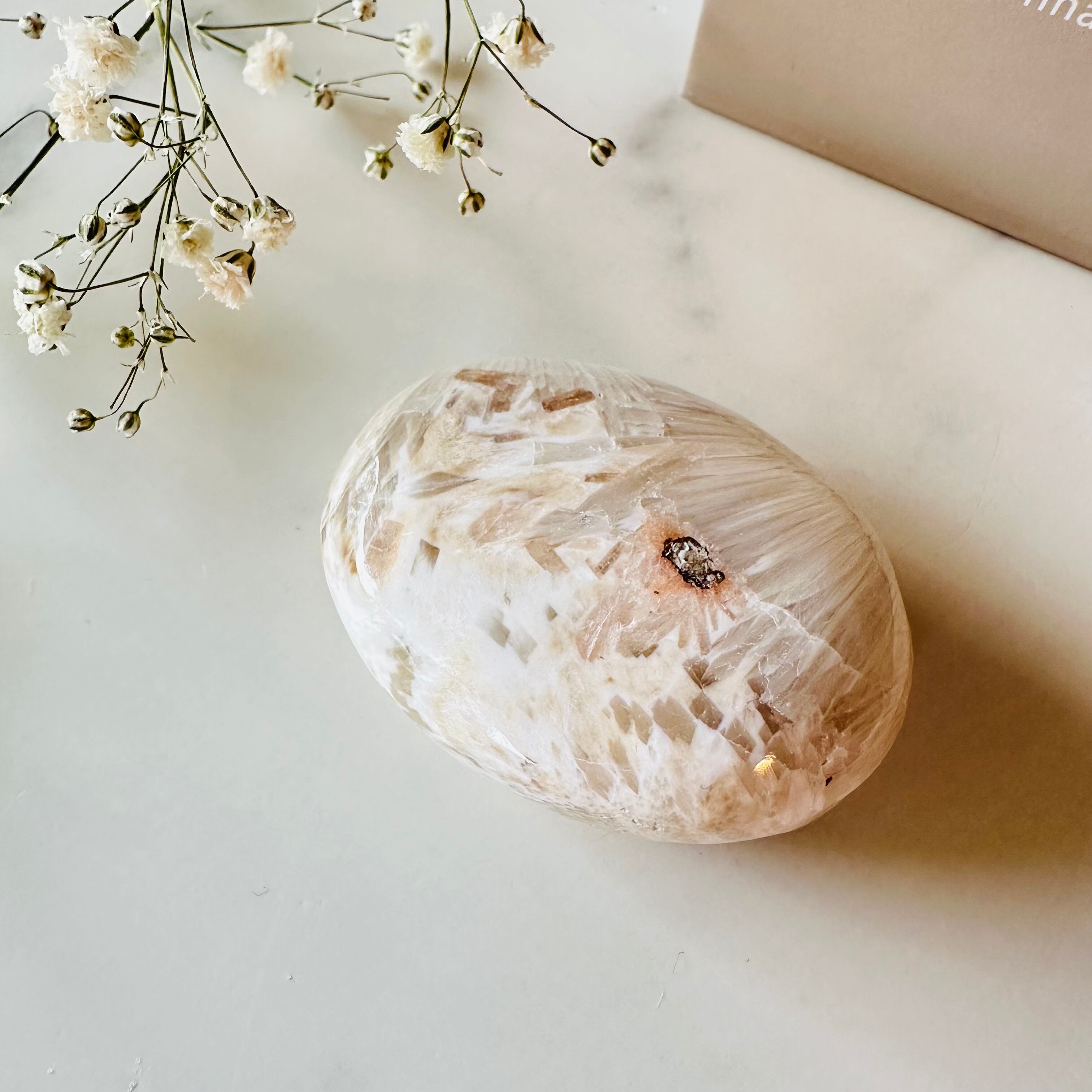 スコレサイトは、ウニのように細長いトゲのような針状結晶が放射状に集まった天然石です。透明感のあるシルクのような美しい結晶はとても繊細で息をのむような美しさです。パームストーンを傾けると結晶の光沢感がとても綺麗で、ピンクのお花のような模様が石の表面に咲いていたり、結晶の断面が花火のように見えたりして、とても愛らしいストーンです。