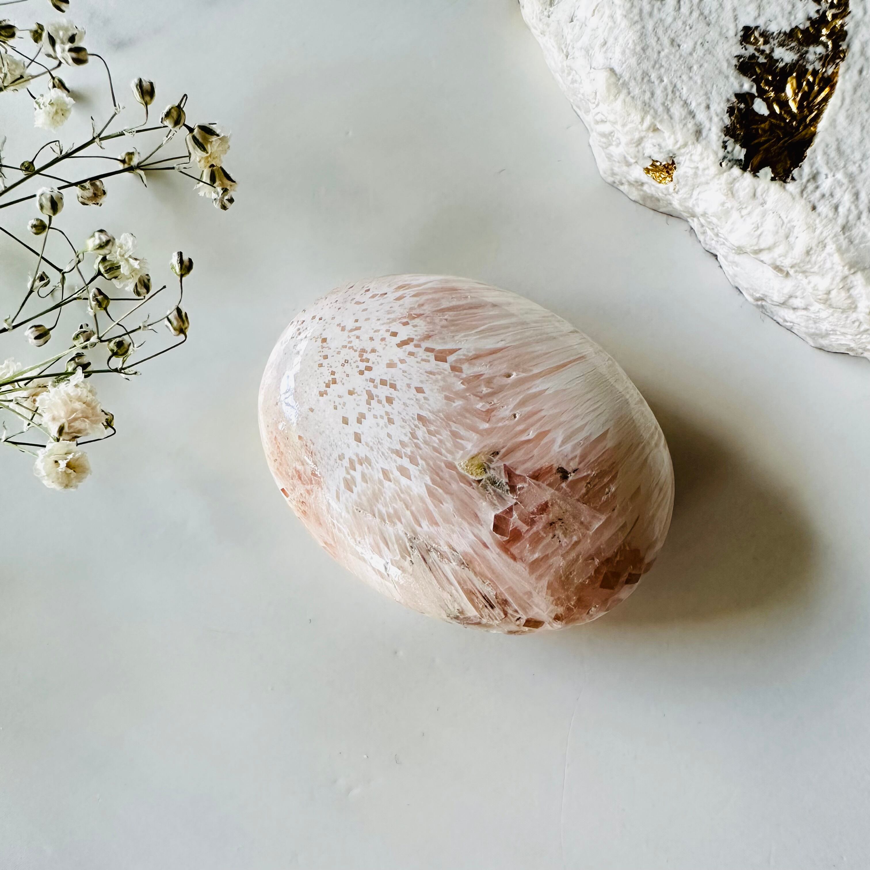 スコレサイトは、ウニのように細長いトゲのような針状結晶が放射状に集まった天然石です。透明感のあるシルクのような美しい結晶はとても繊細で息をのむような美しさです。パームストーンを傾けると結晶の光沢感がとても綺麗で、ピンクのお花のような模様が石の表面に咲いていたり、結晶の断面が花火のように見えたりして、とても愛らしいストーンです。