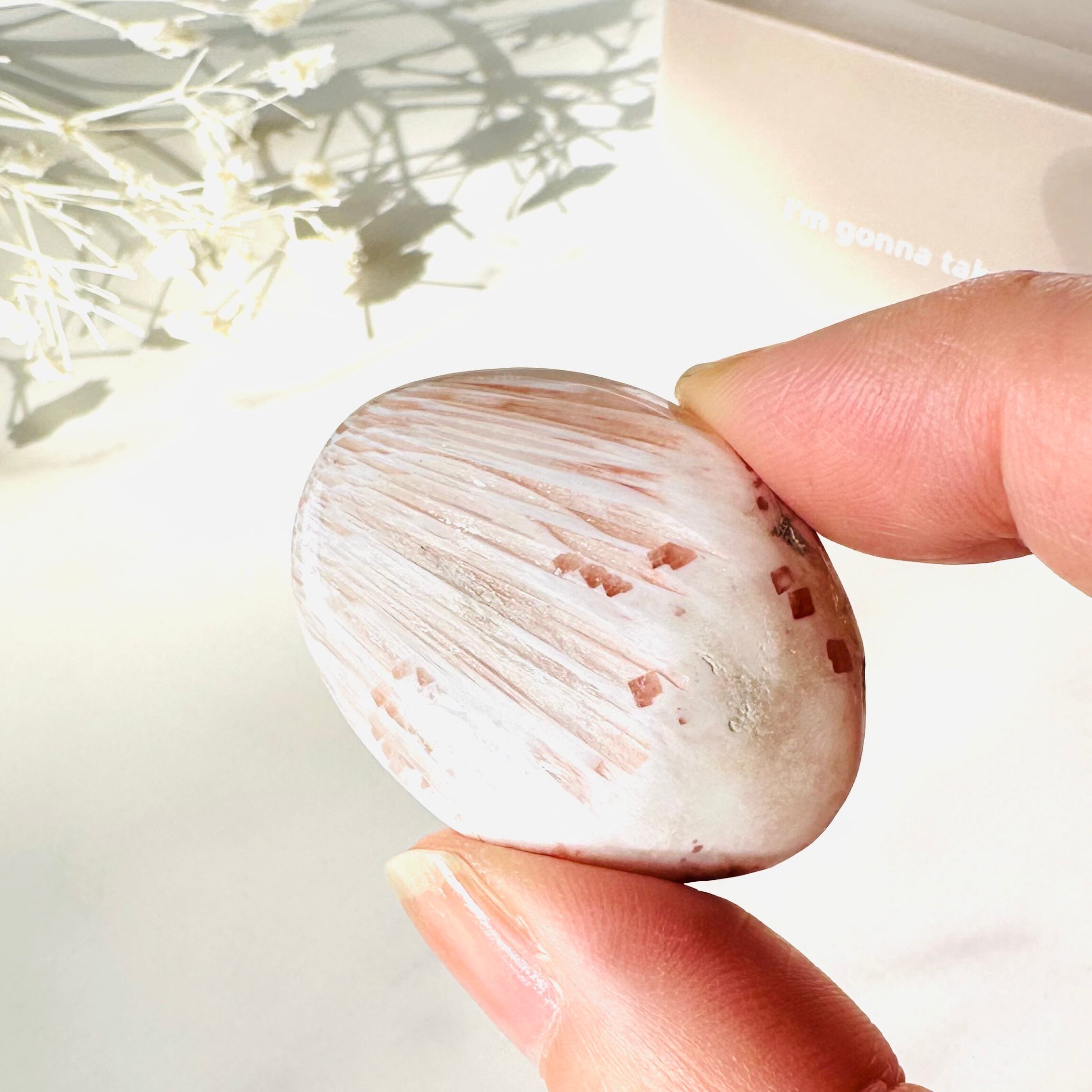 スコレサイトは、ウニのように細長いトゲのような針状結晶が放射状に集まった天然石です。透明感のあるシルクのような美しい結晶はとても繊細で息をのむような美しさです。パームストーンを傾けると結晶の光沢感がとても綺麗で、ピンクのお花のような模様が石の表面に咲いていたり、結晶の断面が花火のように見えたりして、とても愛らしいストーンです。