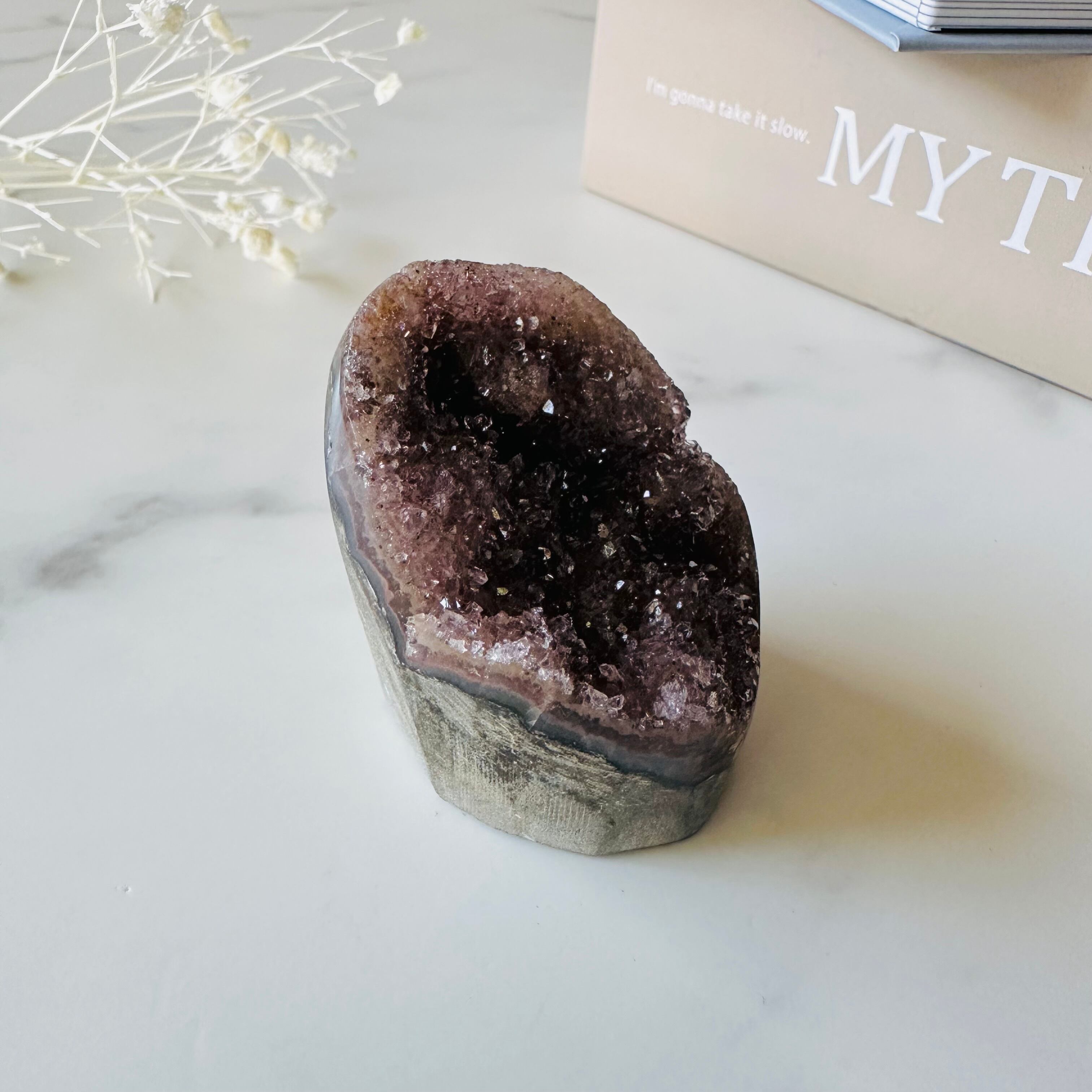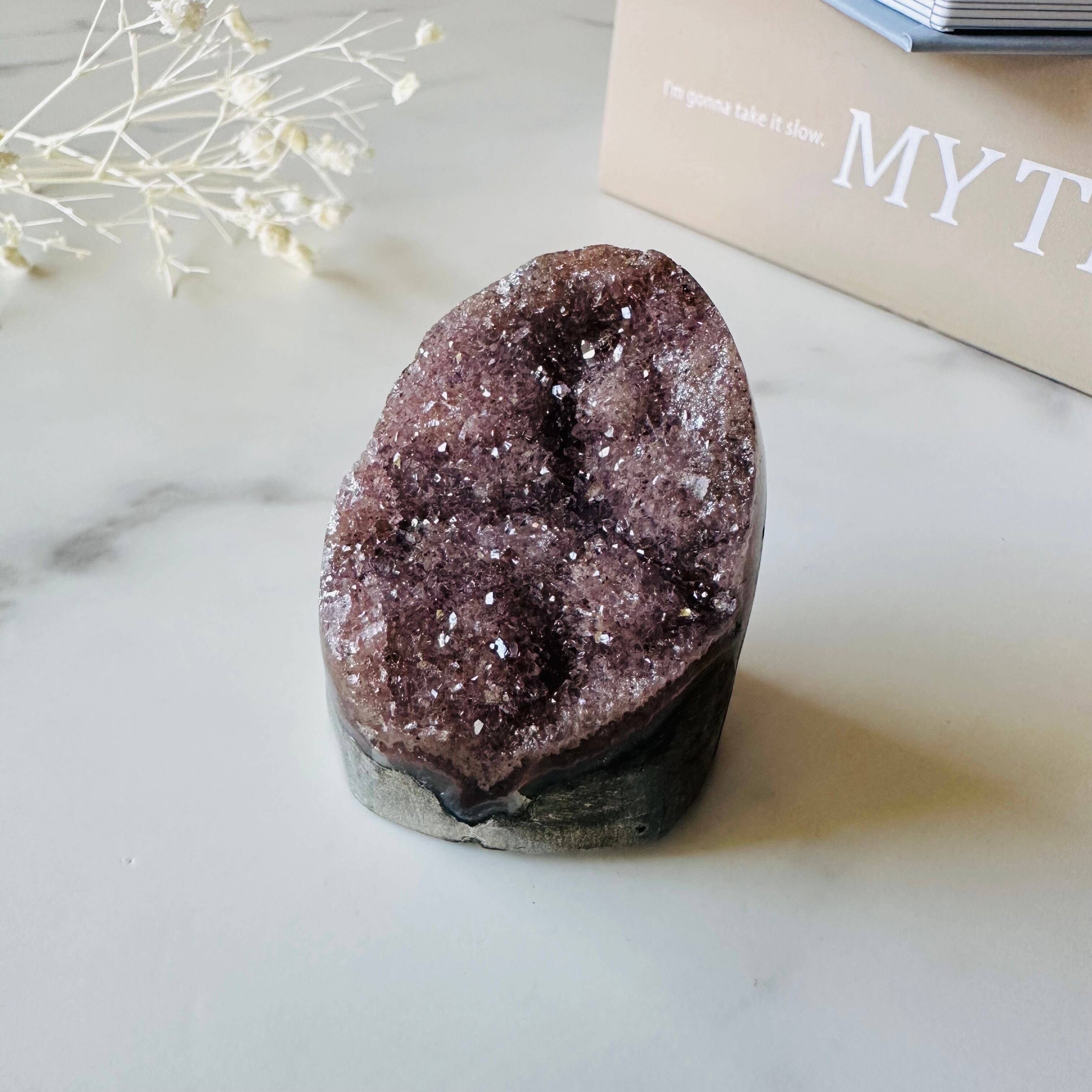 ピンク色に輝く結晶が綺麗で、まるでプラムジャムのような色合いです。細かい結晶の粒が光を受けてキラキラ輝きます。後ろはすべすべした石肌で、安定感があり飾りやすい形状です。