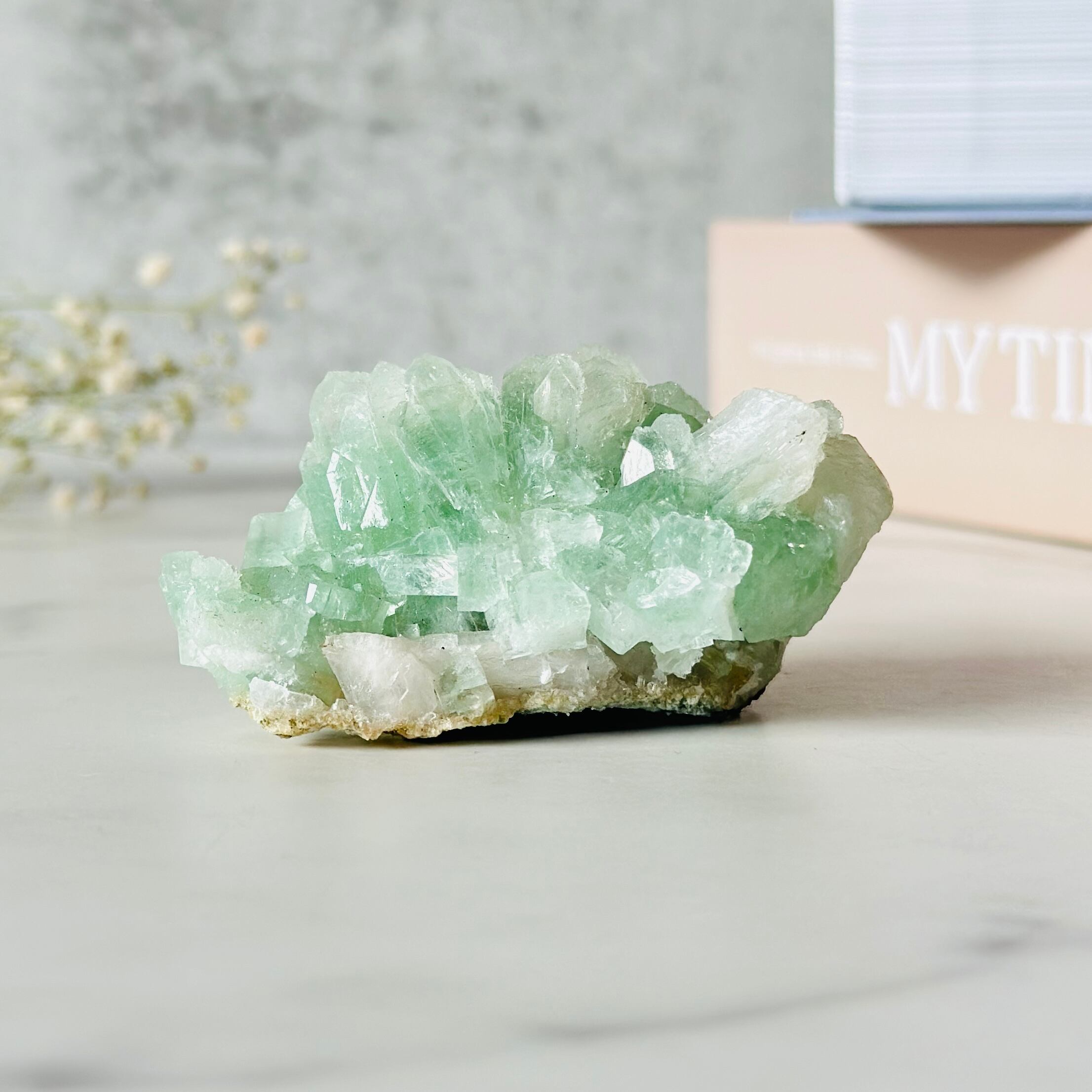 アポフィライトの中でも希少性が高く人気が高いグリーンアポフィライト。このクラスターはしっかりと濃いグリーンの発色で、ザクザクした結晶が魅力です。品良く美しいグリーンの色合いと煌めきが癒しを与えてくれます。また白い束状の結晶は、スティルバイトの共生です。