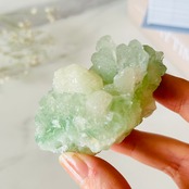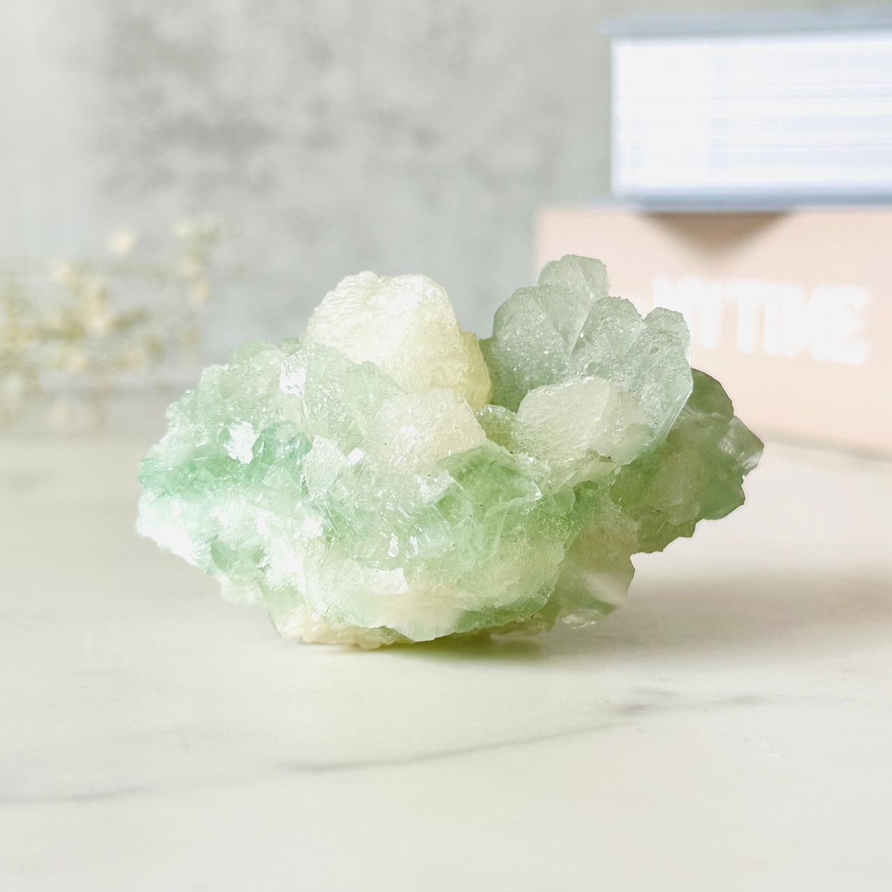 アポフィライトの中でも希少性が高く人気が高いグリーンアポフィライト。このクラスターはしっかりと濃いグリーンの発色で、ザクザクした結晶が魅力です。品良く美しいグリーンの色合いと煌めきが癒しを与えてくれます。また白い束状の結晶は、スティルバイトの共生です。