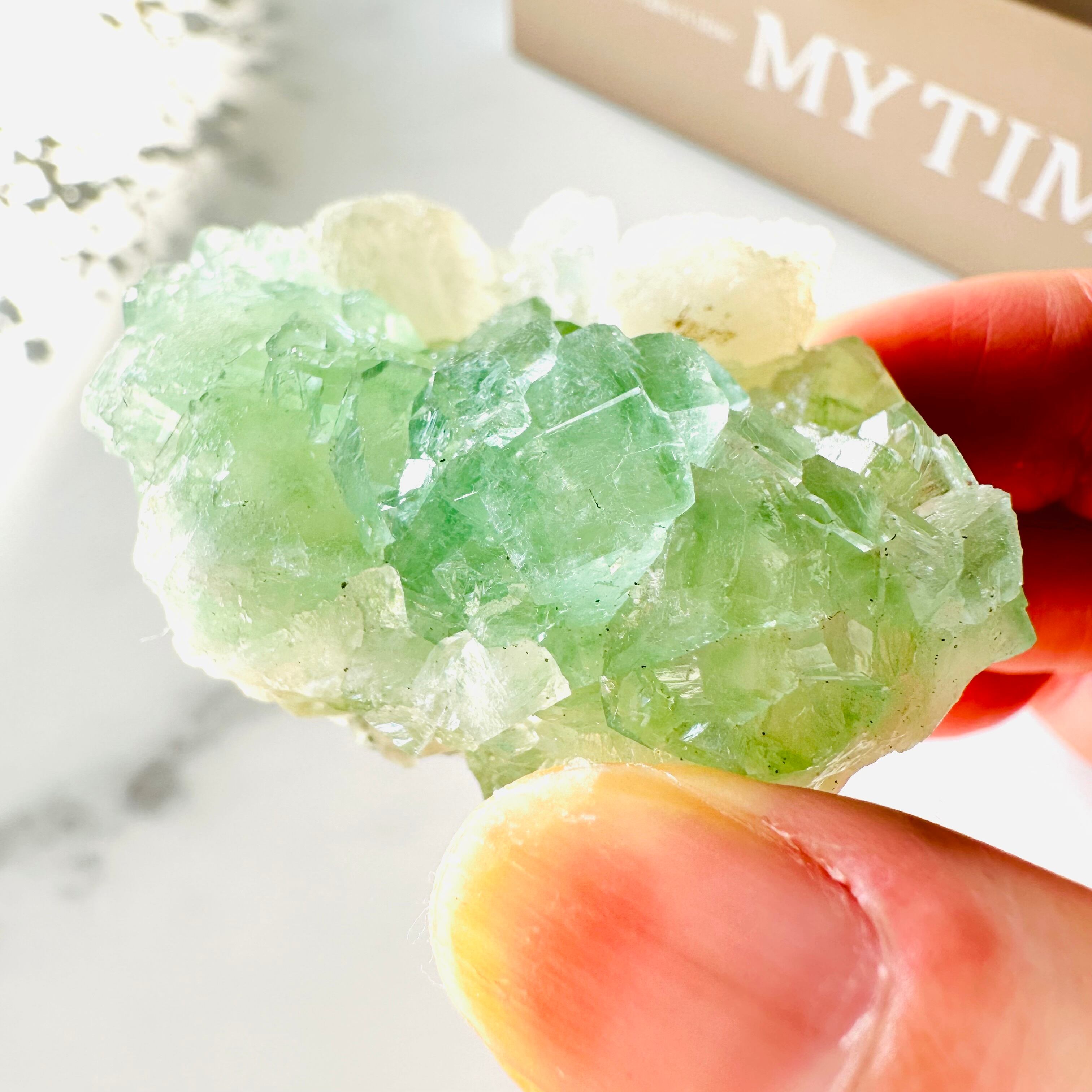 アポフィライトの中でも希少性が高く人気が高いグリーンアポフィライト。このクラスターはしっかりと濃いグリーンの発色で、ザクザクした結晶が魅力です。品良く美しいグリーンの色合いと煌めきが癒しを与えてくれます。また白い束状の結晶は、スティルバイトの共生です。