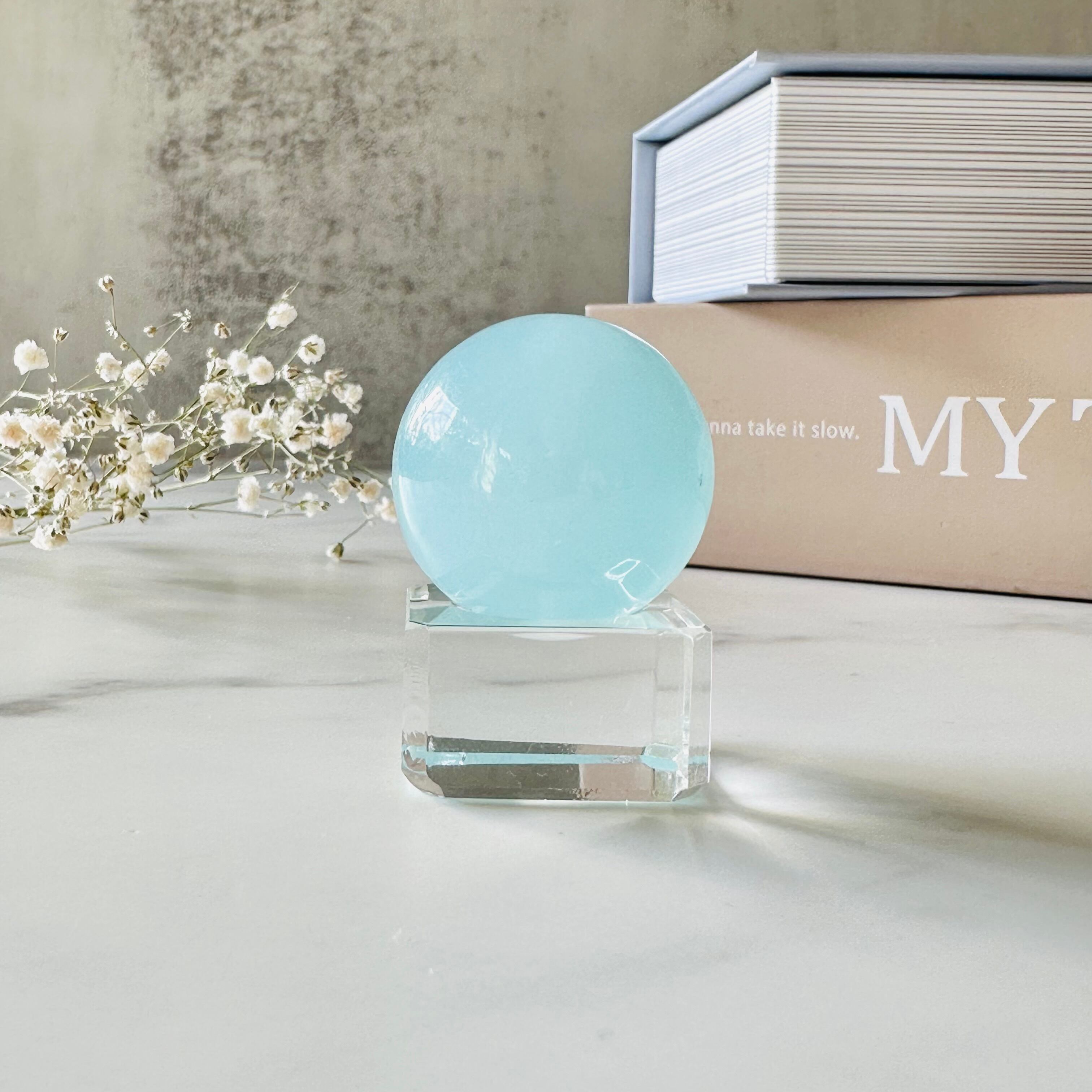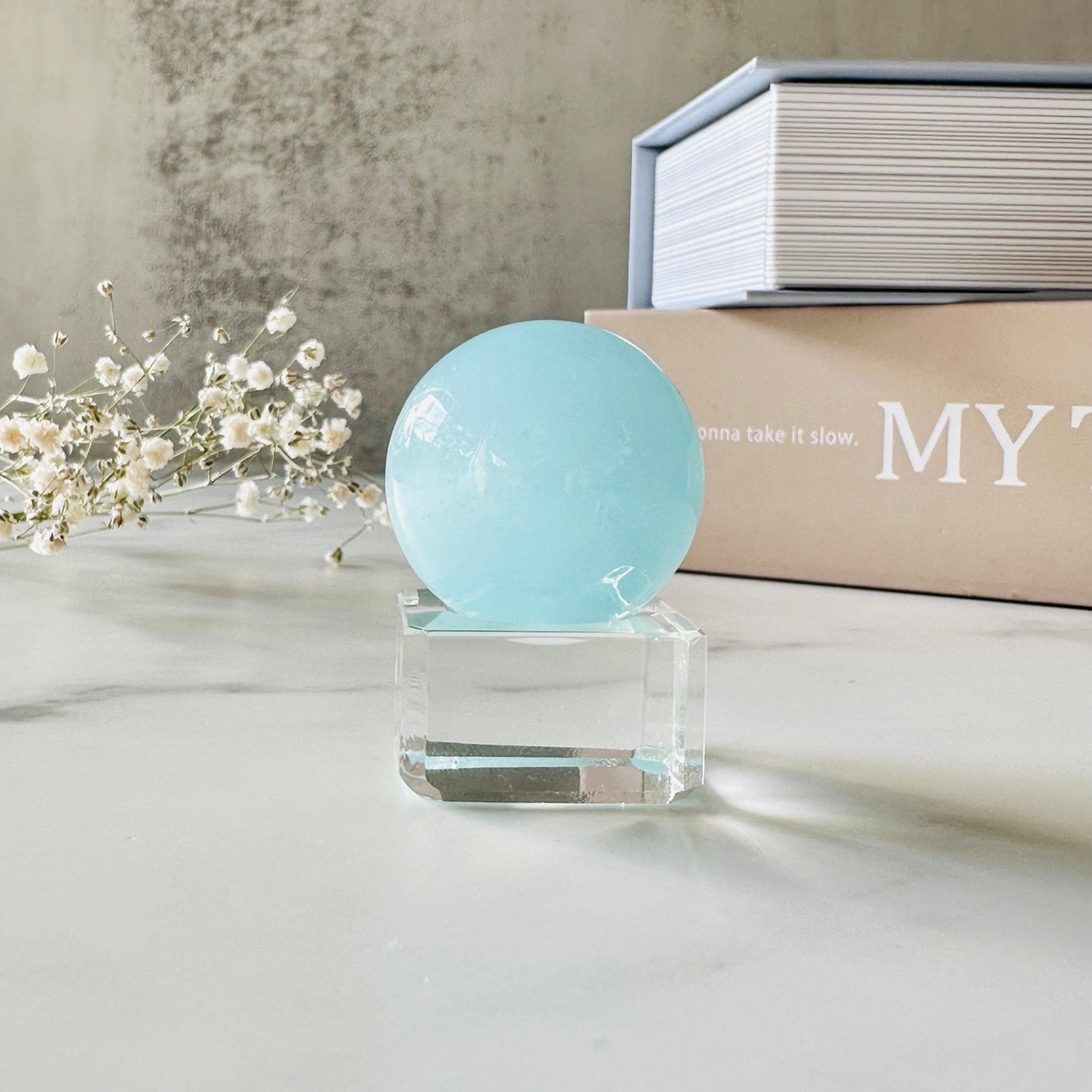 淡く澄んだブルーが美しいアクアマリンミニスフィア。透明感がある明るい水色で、内部の白い模様がふんわりと輝いて雲のようにも霧のようにも見えます。みて触れるほどに癒されるアイテムです。