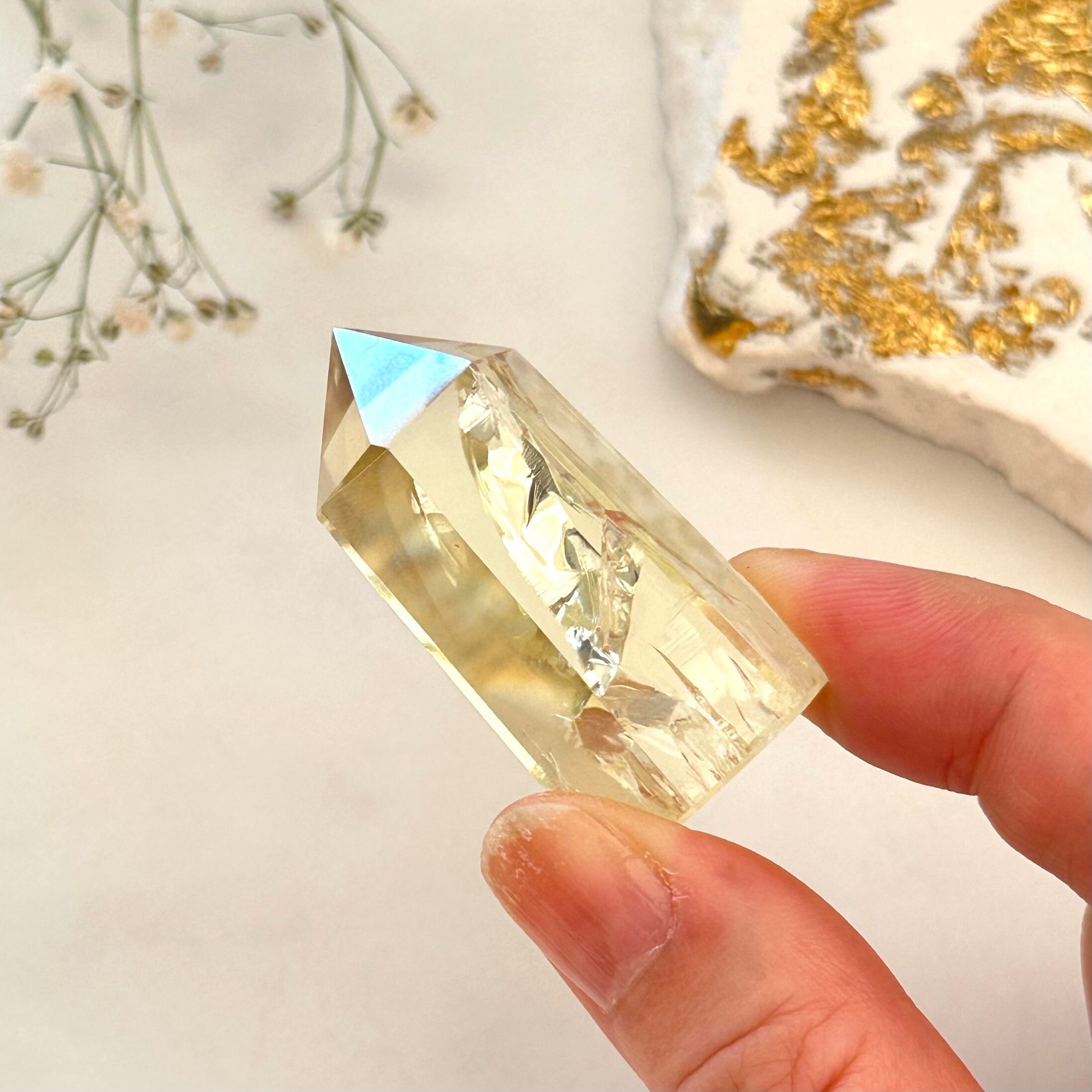 透明度が高く綺麗なシトリンのミニポイントです。明るく濁りのないすっきりとしたイエローゴールドカラーで、内部に大胆に入ったクラックが大きな虹を映し出します。
