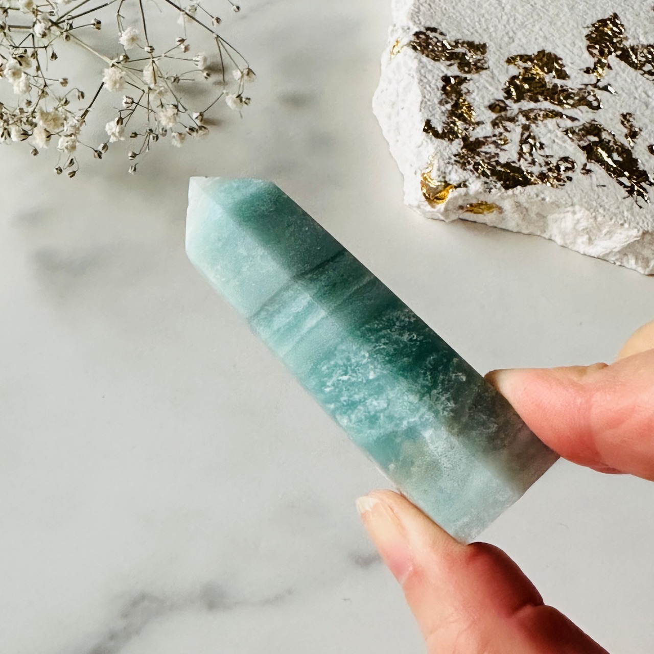 美しいブルーとホワイトのマーブル模様が美しいコントラストを描き出すブルーアラゴナイト。ラリマーと見間違うことも多いようです。穏やかな優しいブルーが癒しを感じさせてくれる希少価値の高いレアストーンです。