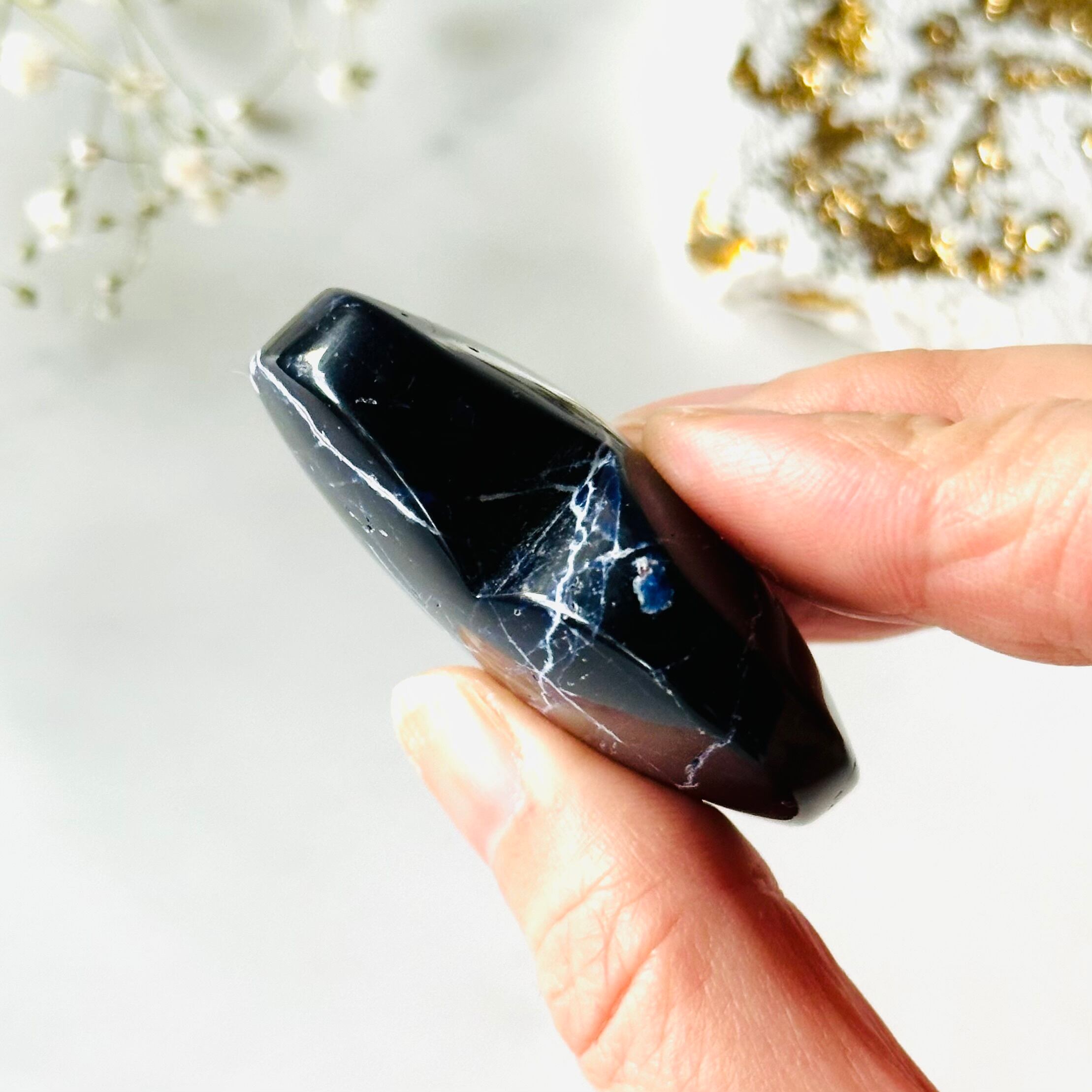 深いブルーのソーダライトは宇宙や夜空を思わせます。流れるようなラインは、まるで流れ星の残像のようです。思慮深く神秘的な佇まいで、自己と深く繋がりたい時、内なる自己の声を聞きたい時にそばにおくと良いでしょう。瞑想をされる方、ハイヤーセルフと繋がりたい方にお勧めします。