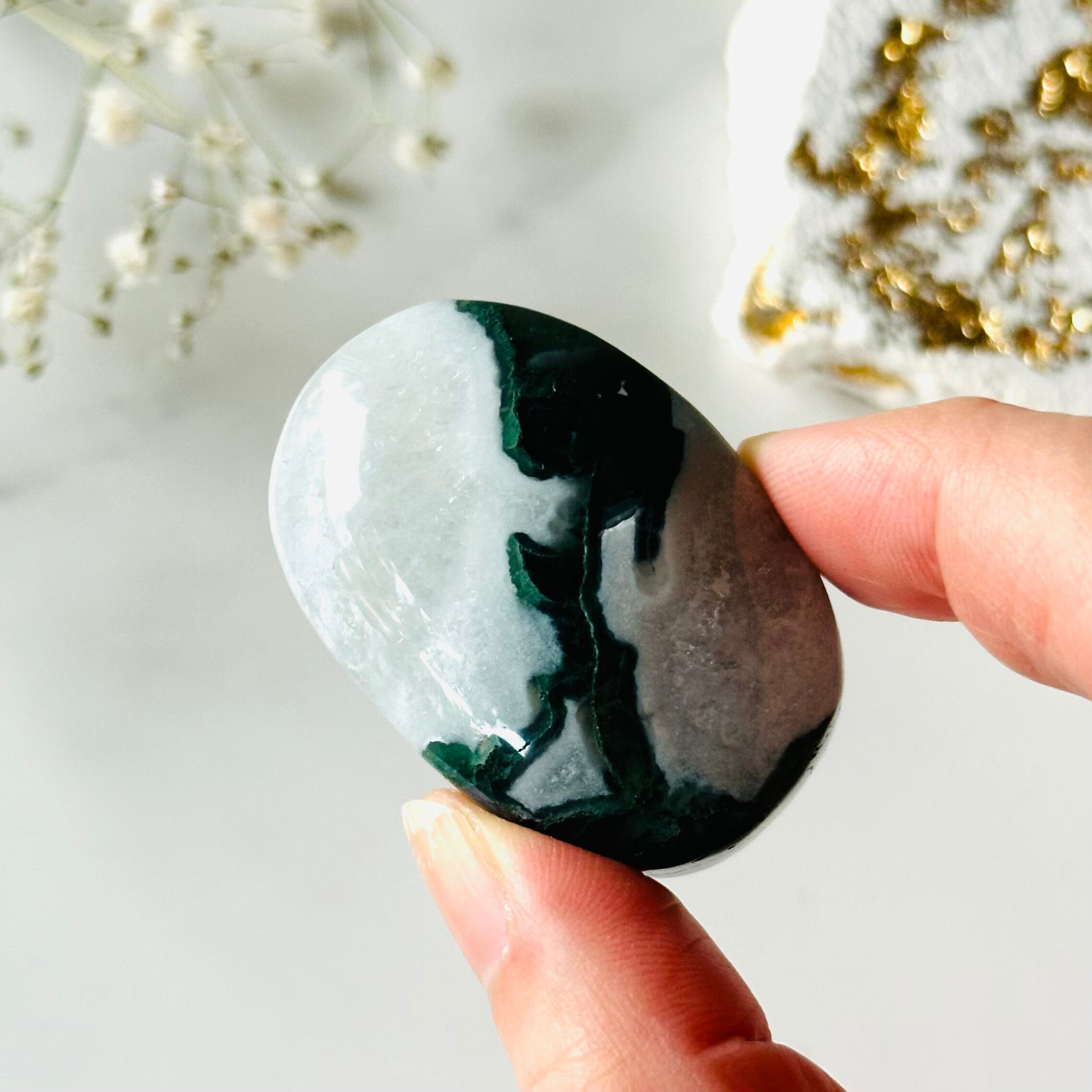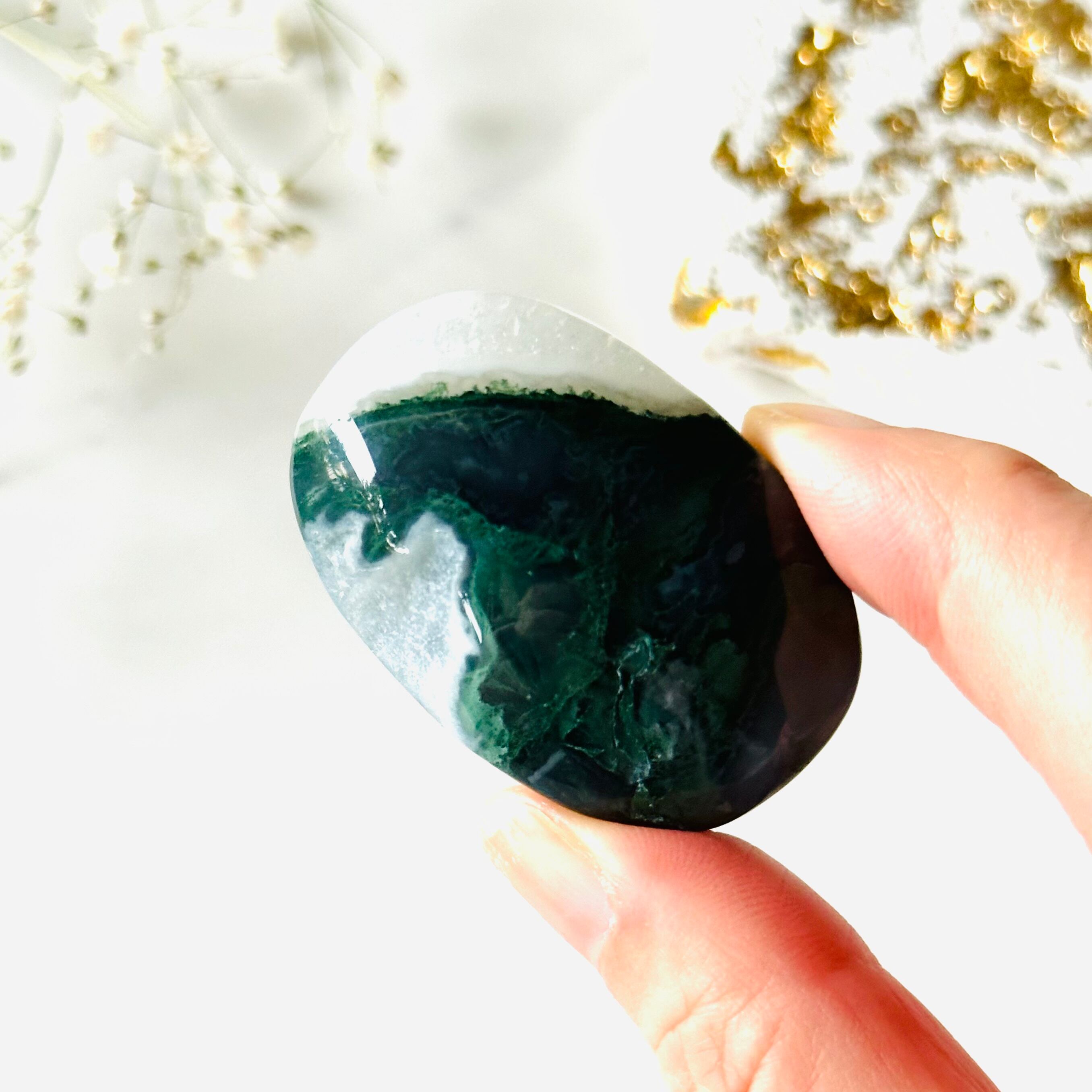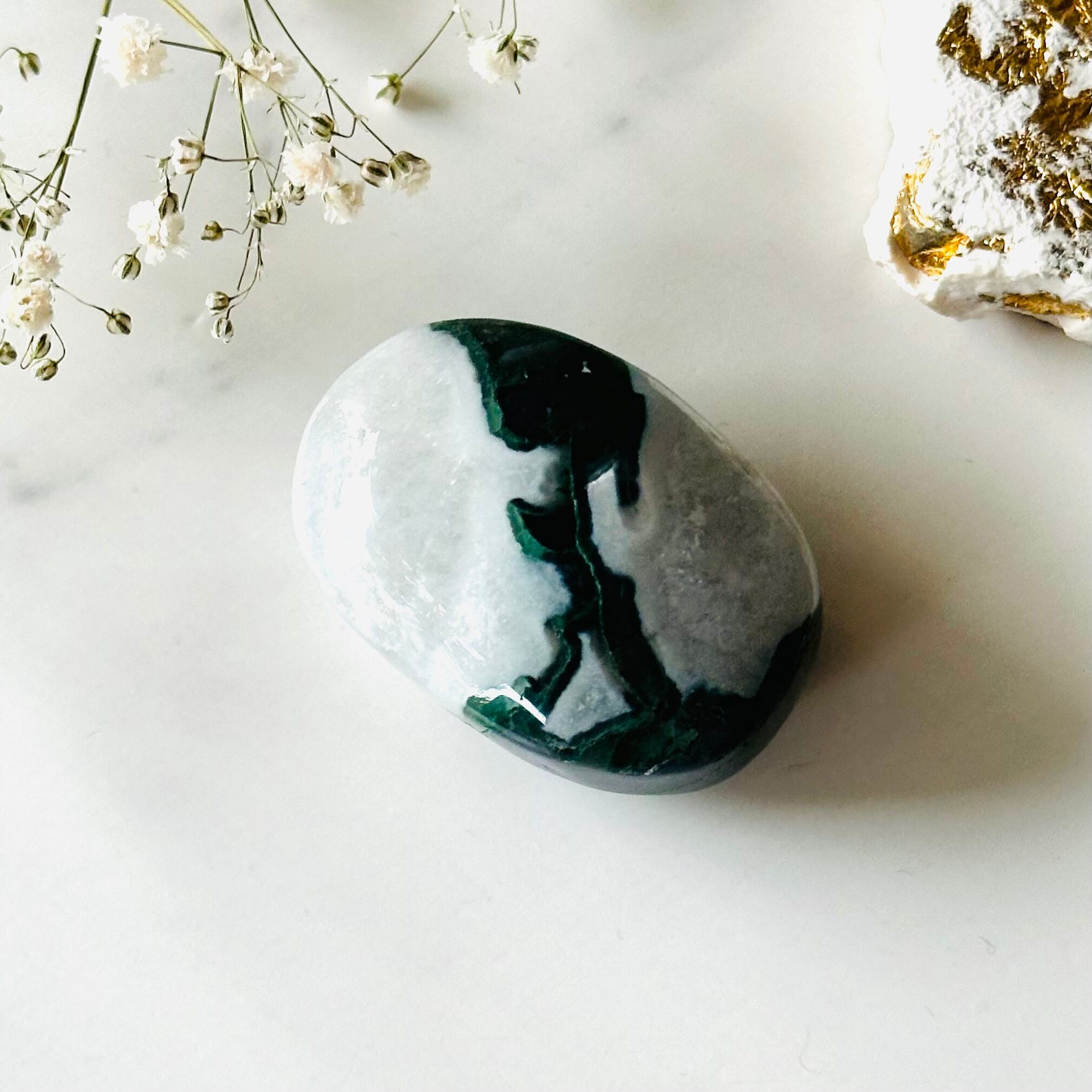 まっさらな白と綺麗なグリーンが美しいモスアゲートのタンブルです。観葉植物の代わりに、癒しのグリーンをインテリアに取り入れてみてはいかがでしょうか。