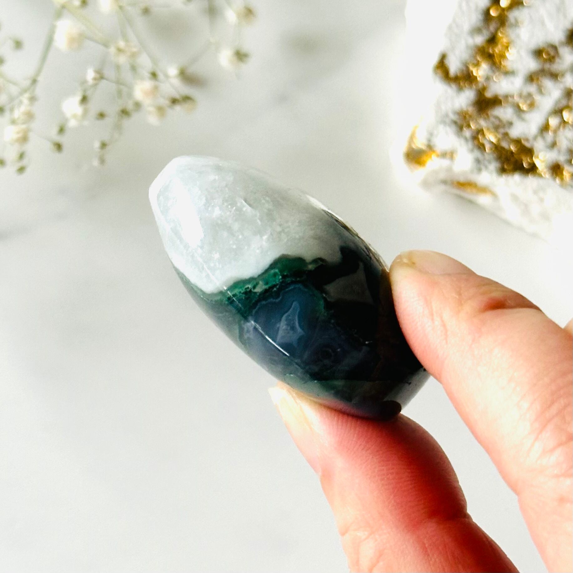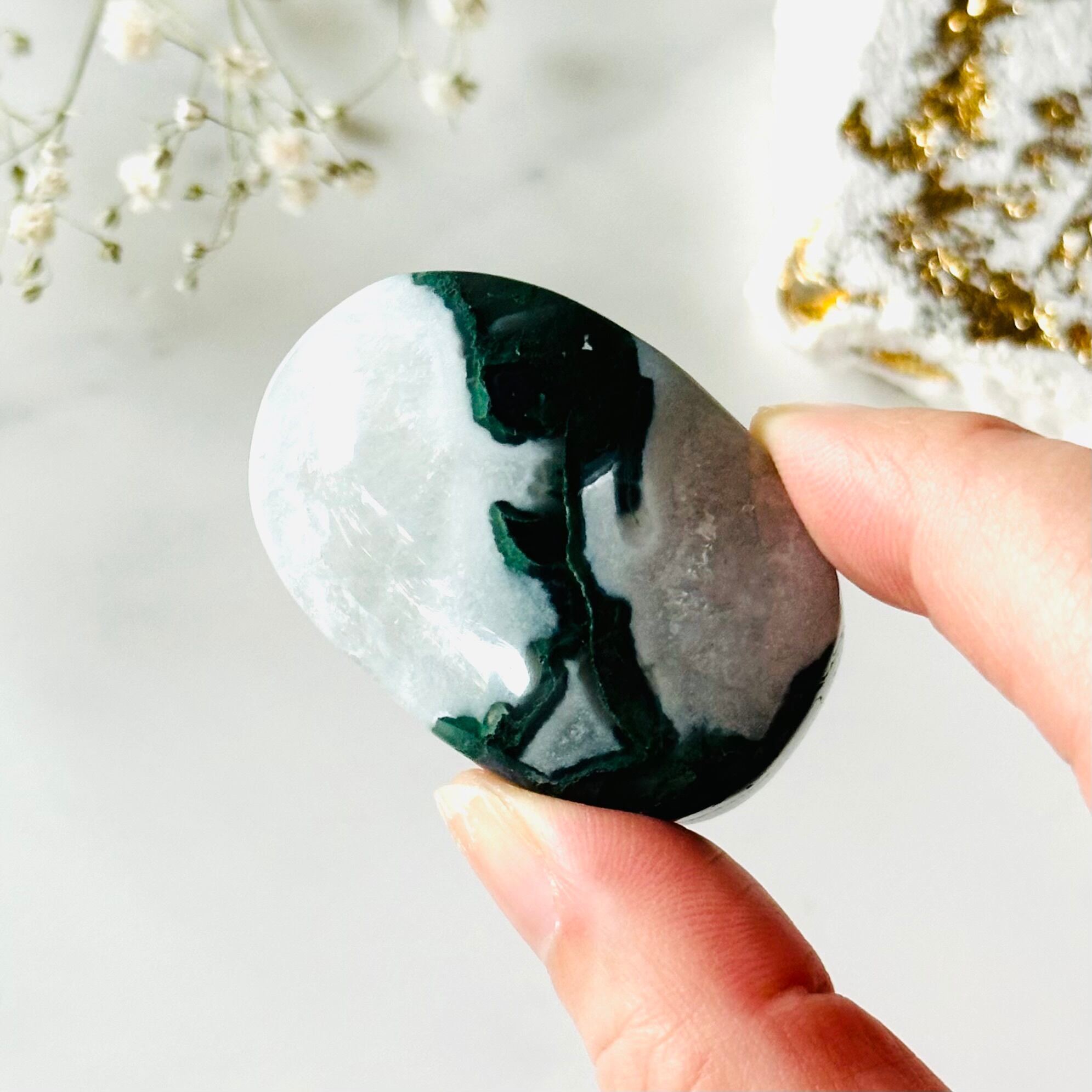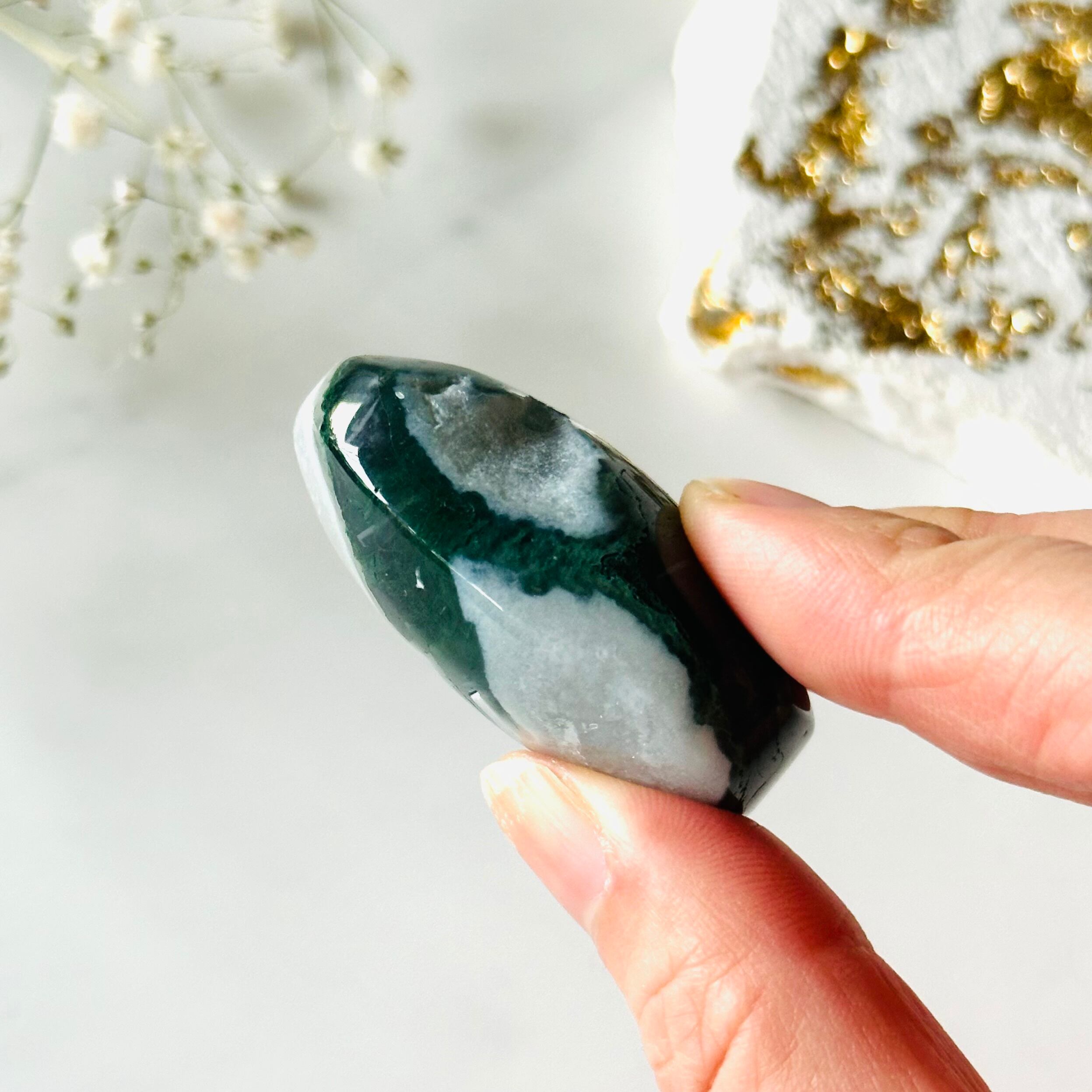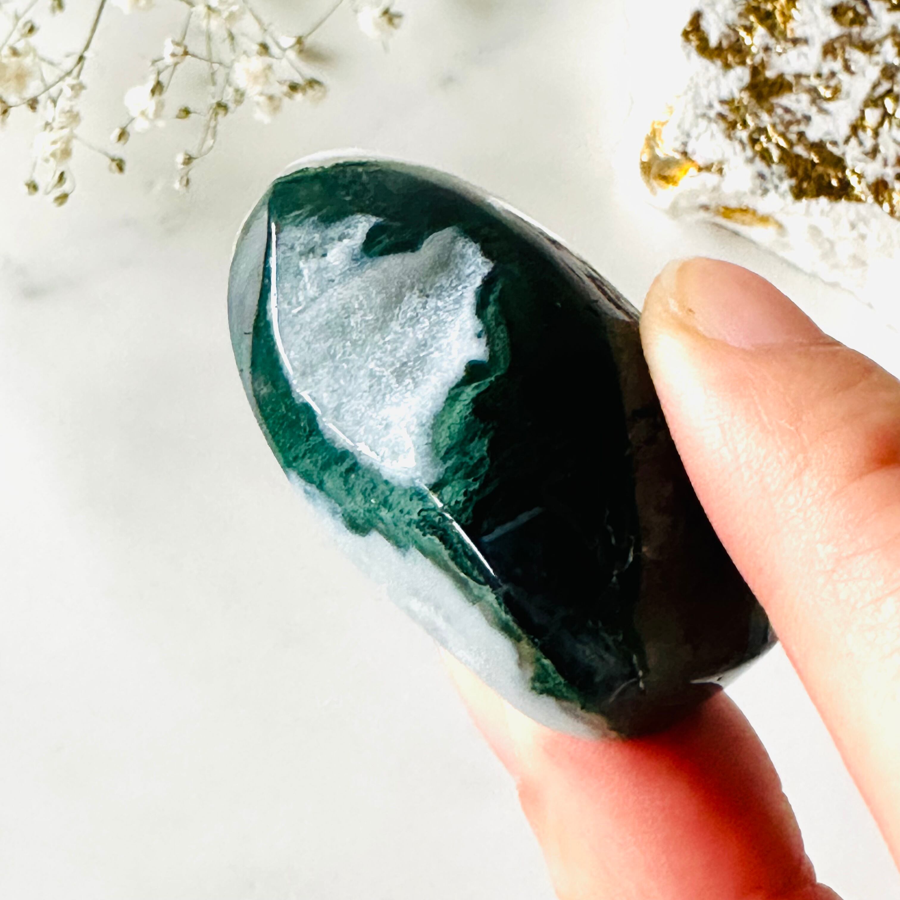 まっさらな白と綺麗なグリーンが美しいモスアゲートのタンブルです。観葉植物の代わりに、癒しのグリーンをインテリアに取り入れてみてはいかがでしょうか。