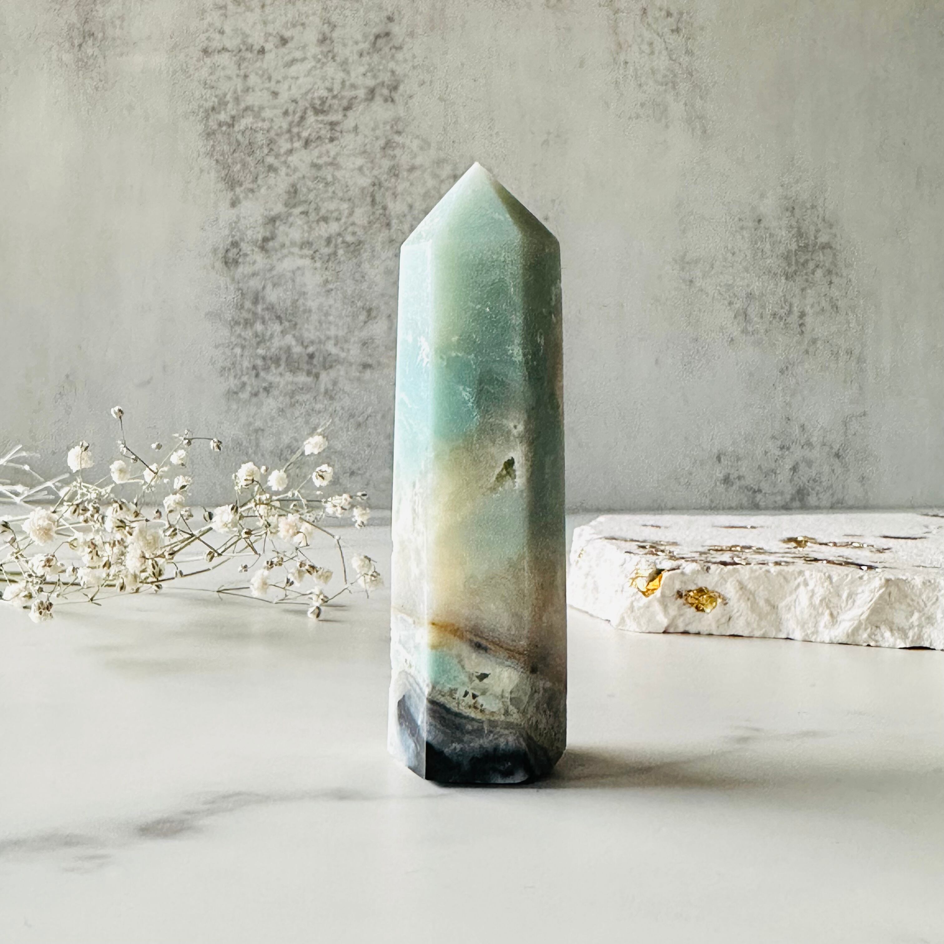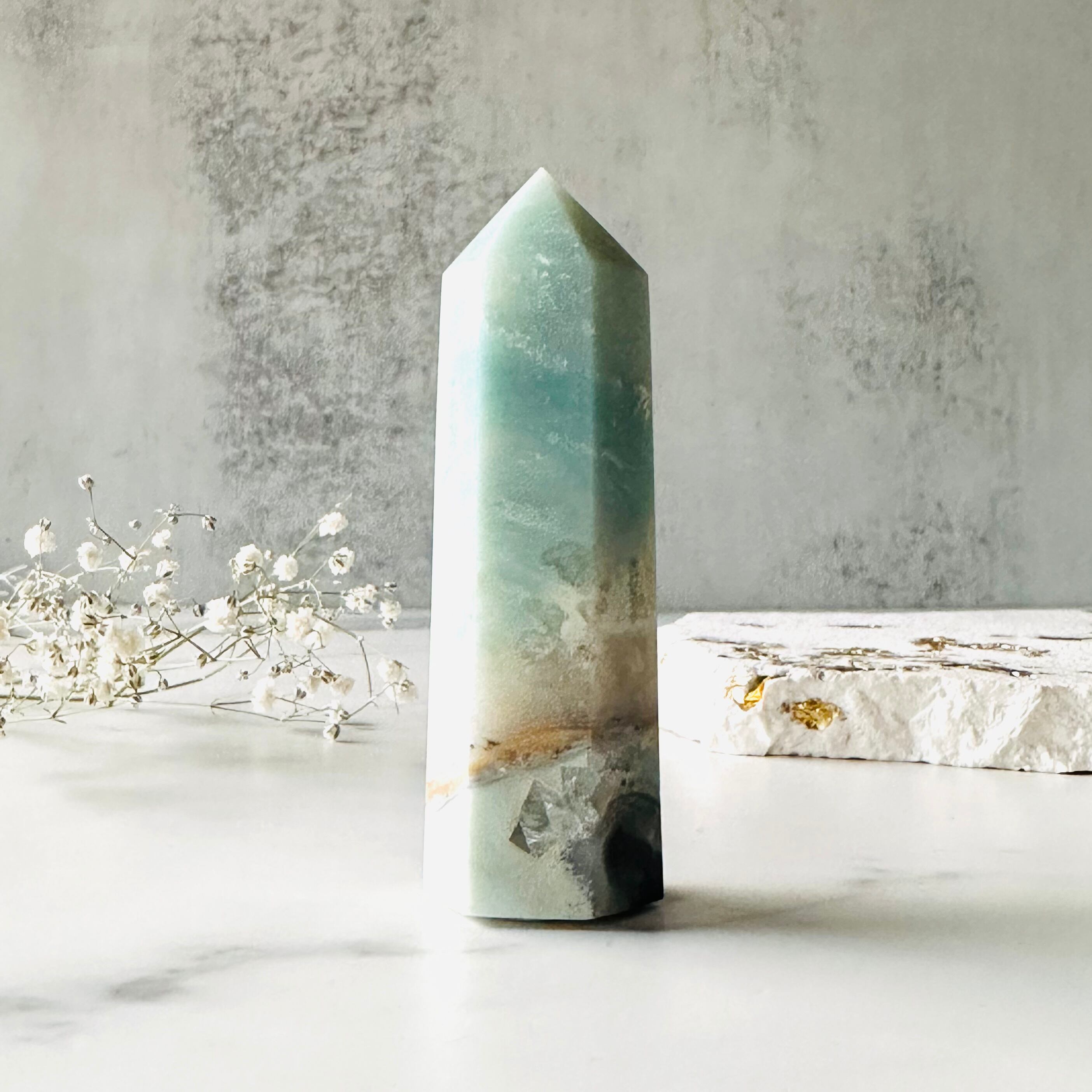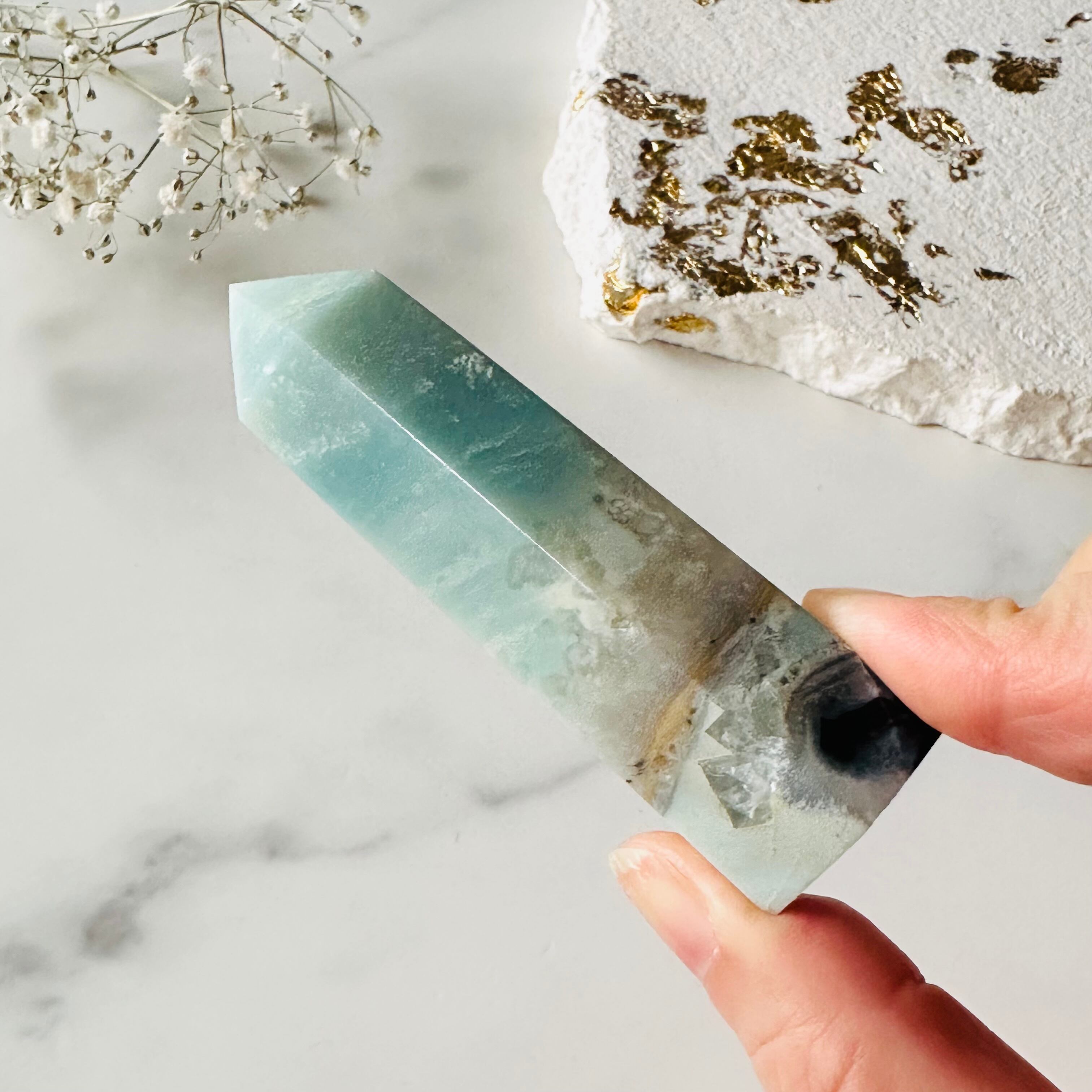 美しいブルーとホワイトのマーブル模様が美しいコントラストを描き出すブルーアラゴナイト。ラリマーと見間違うことも多いようです。穏やかな優しいブルーが癒しを感じさせてくれる希少価値の高いレアストーンです。