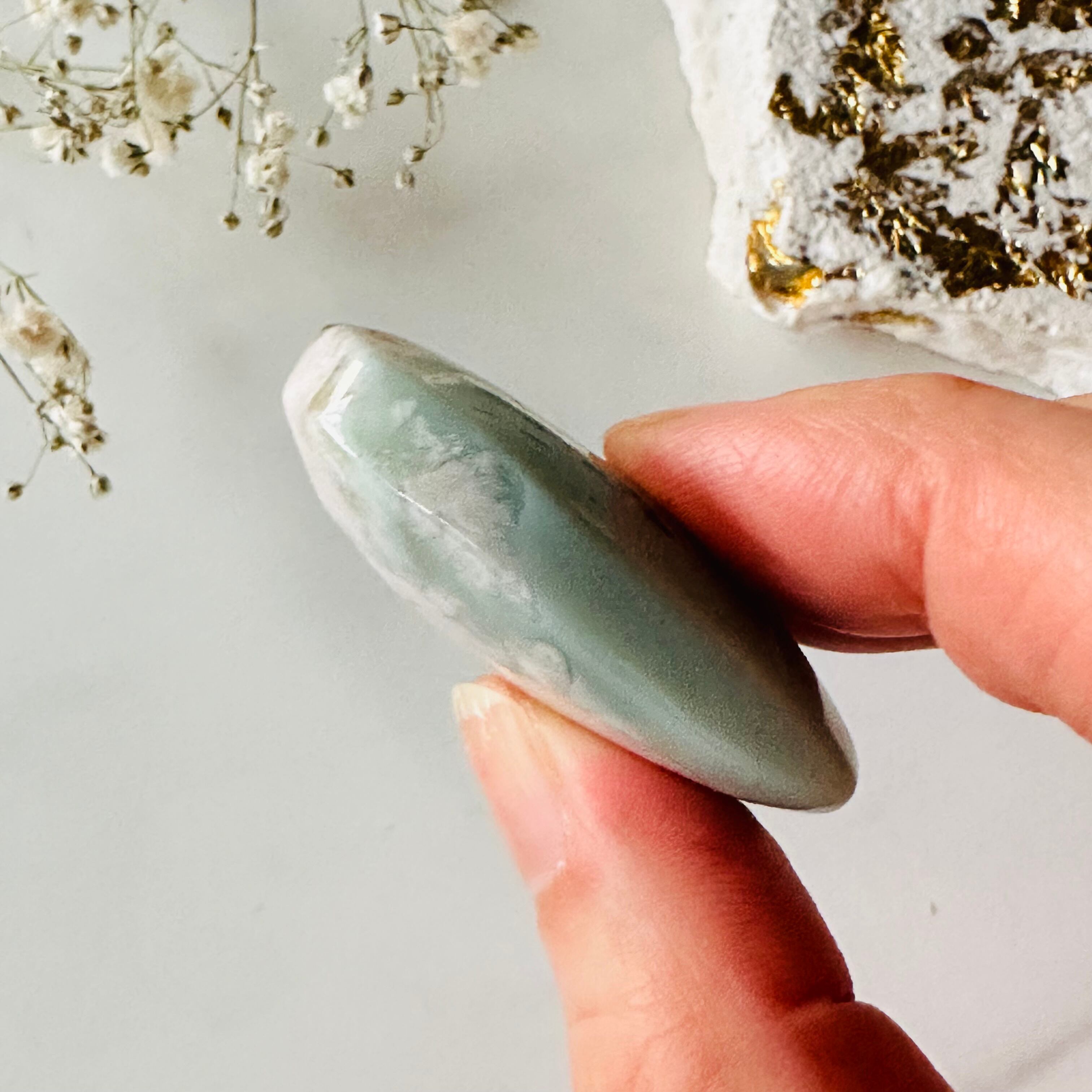 大きな白いお花がまるで桜の花のようなエレガントで可愛いグリーンフラワーアゲートのハート型ストーンです。優しい配色に心癒され、触れるたびに心が落ち着き穏やかになれるストーンです。
