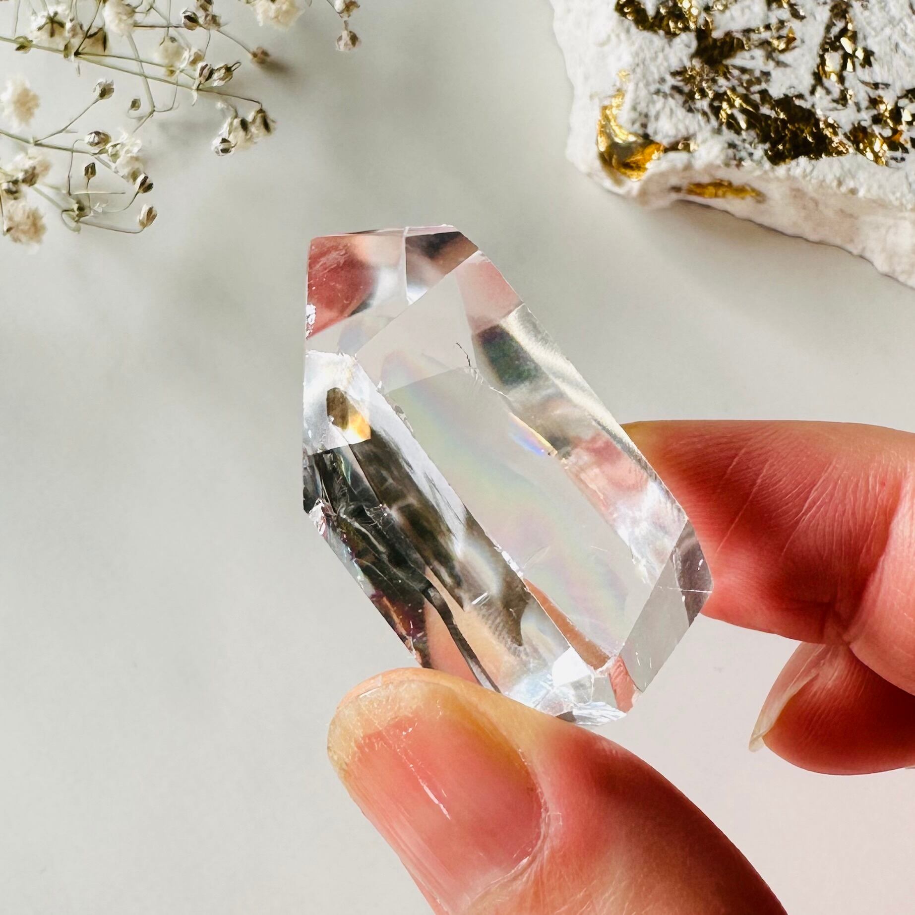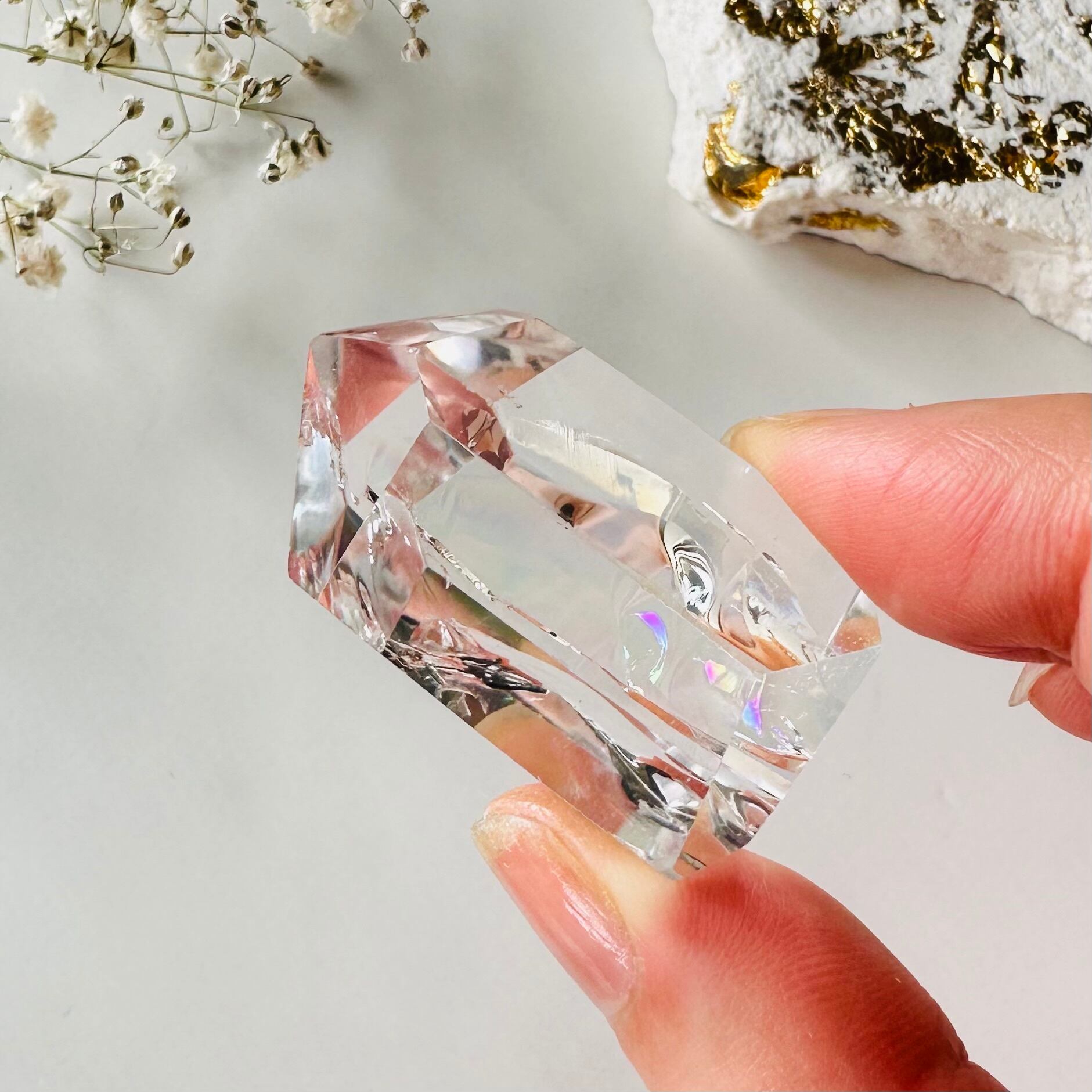 内部のクラックが美しい虹を映し出す宝石カットのクリアクォーツ。高い透明度の水晶はまるで氷のかけらのように透き通って光を宿し、幻想的な世界に連れて行ってくれます。素材の美しさ、丁寧なカット、クリアで無垢なクォーツがとても魅力的で、世界にひとつだけの特別なアイテムです。ぜひお手に取ってご覧ください。