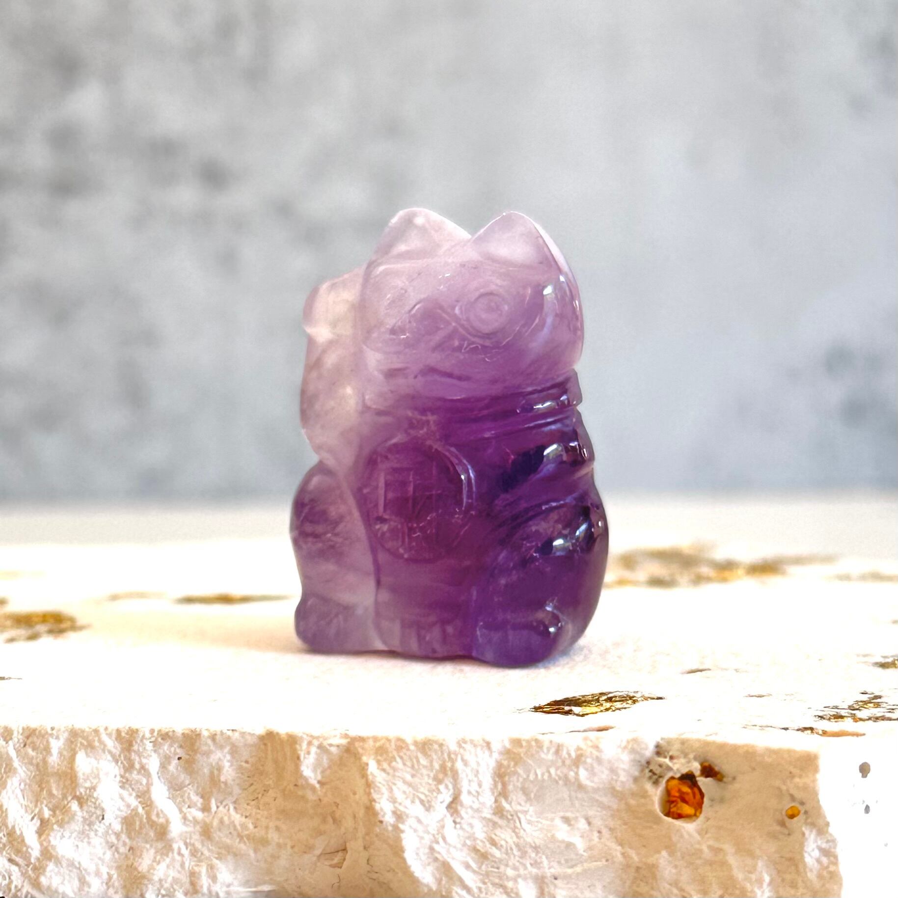 右手を上げている招き猫には金運アップの意味があるとされています。お顔の上部はごく淡いパープルで透明感があり、お腹に向かって色が濃くなります。お腹には「財」の文字が入っています。お腹や足に綺麗な虹が見られます。